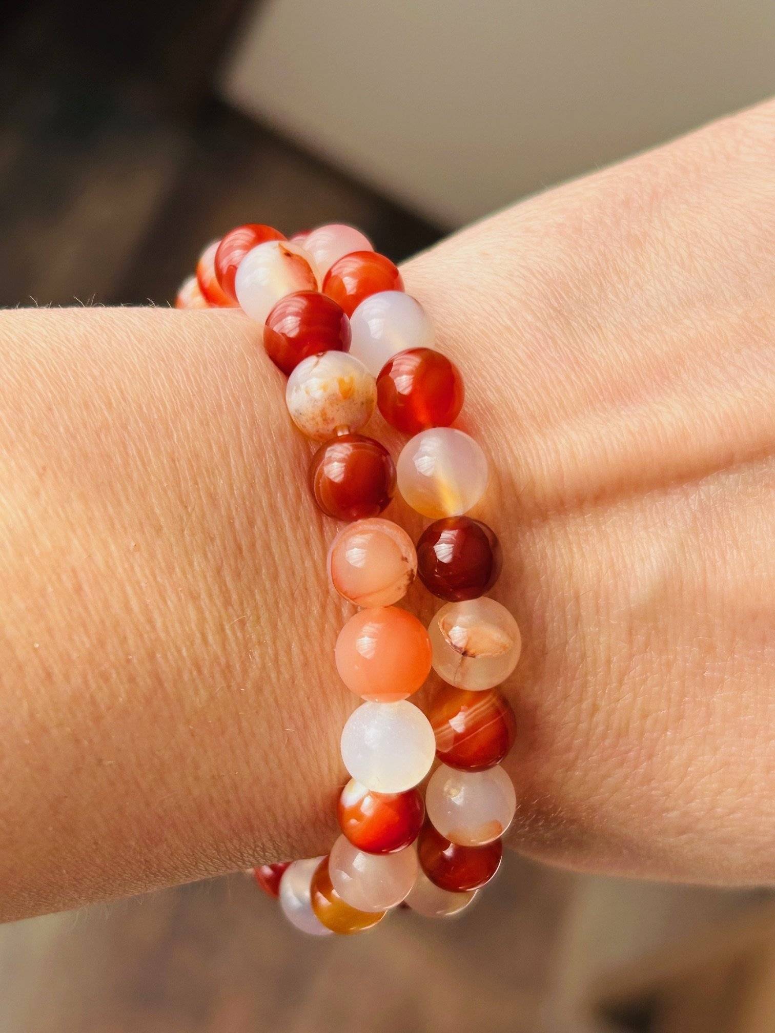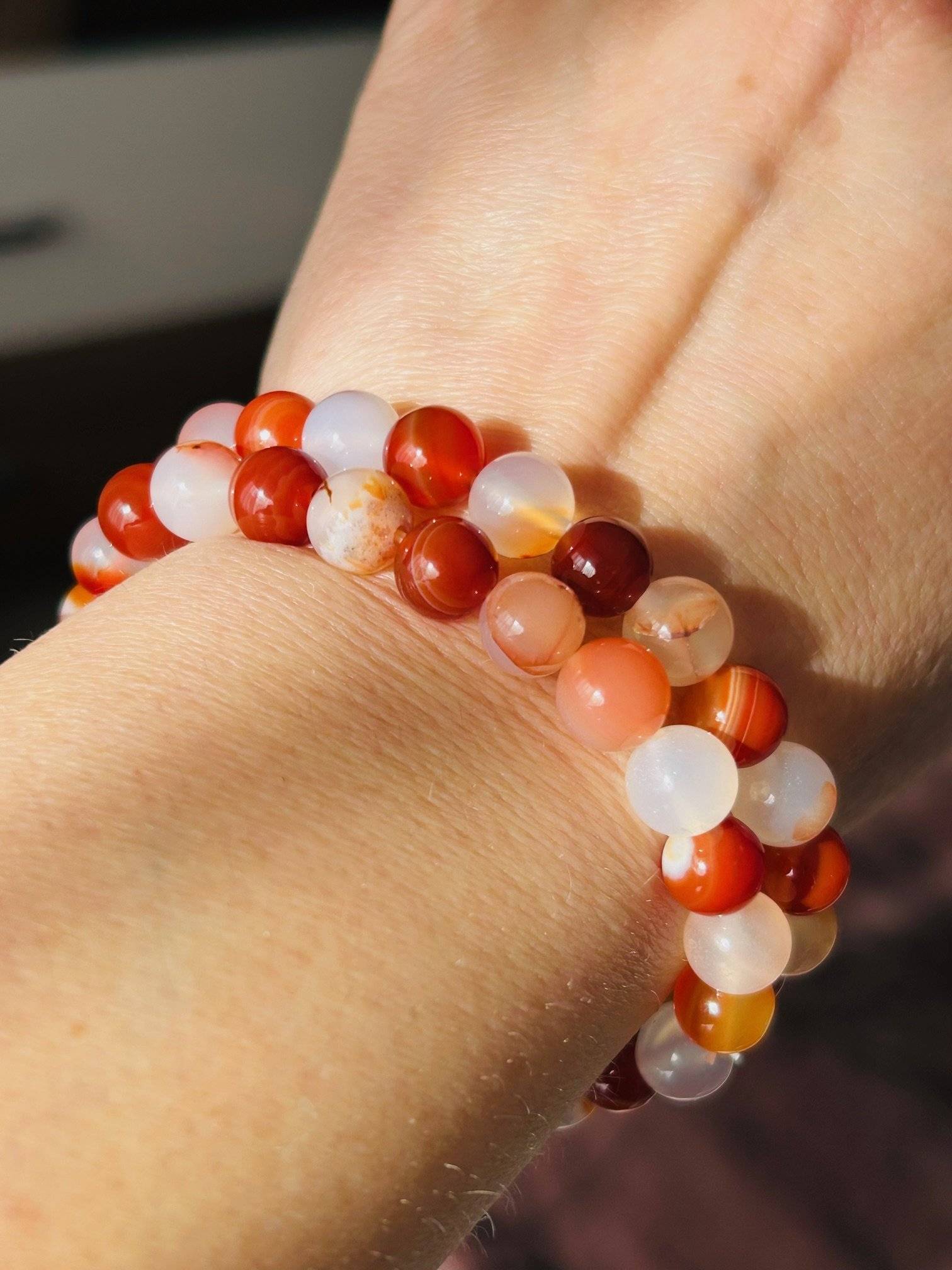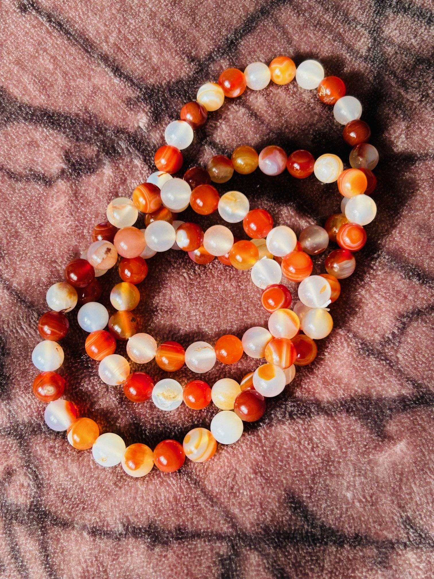O brățară realizată din 24 sfere de carneol și agate  alb-portocalii, cu dimensiunea de 8 mm, înșirate pe gută elastică.