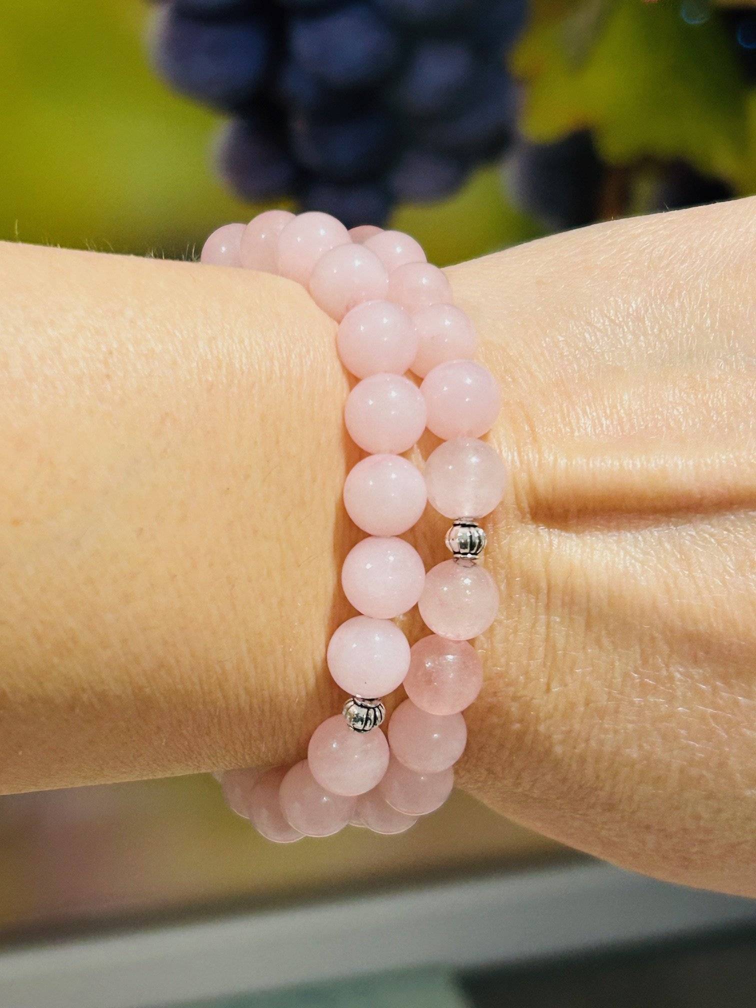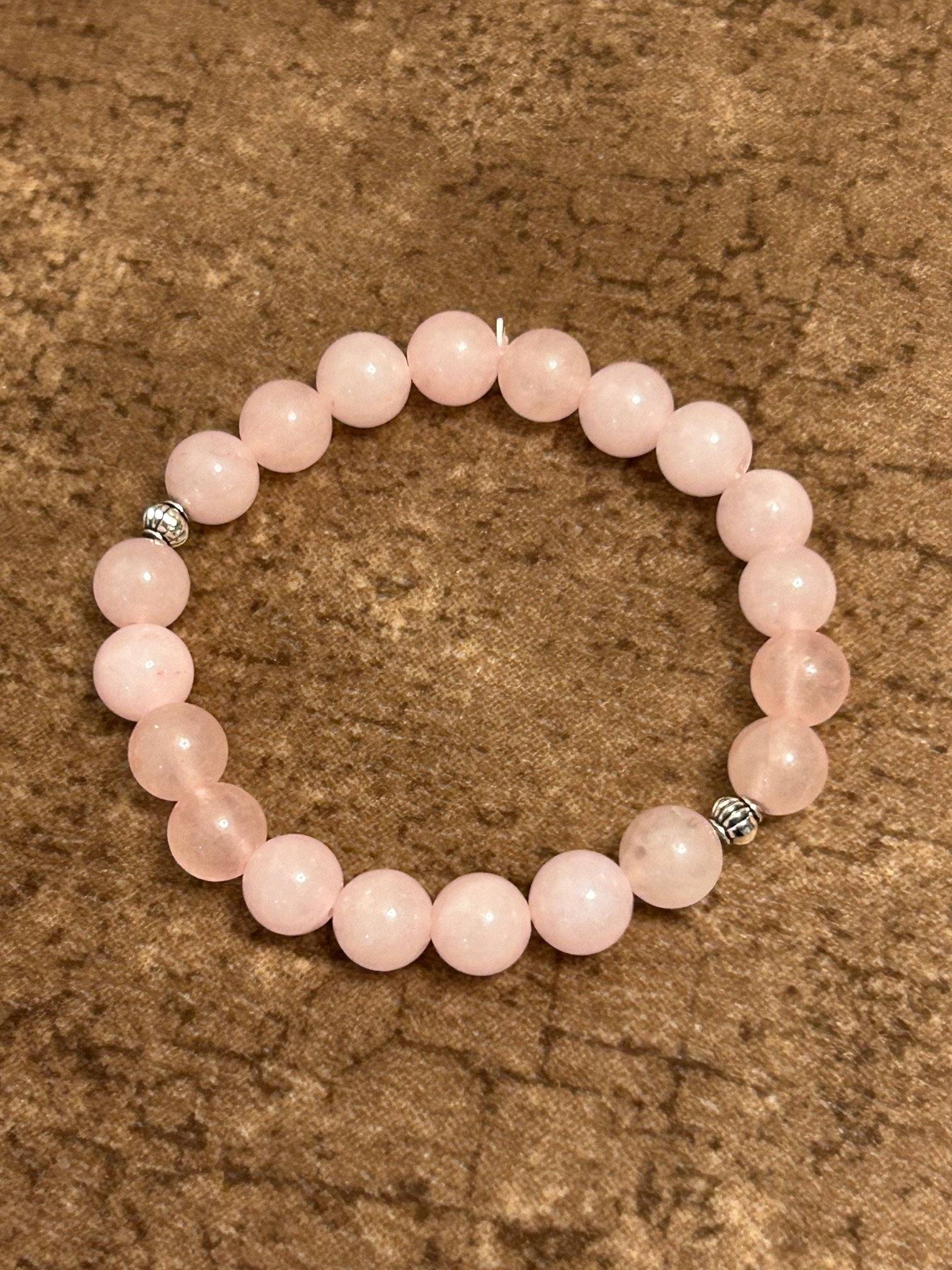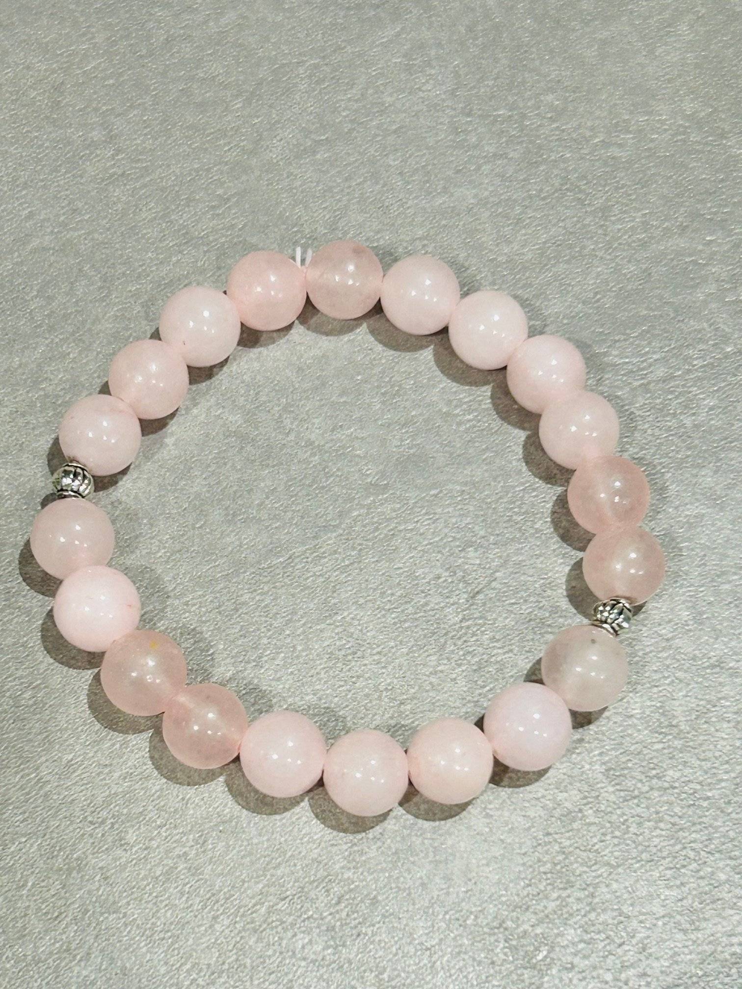 Brățară realizată din sfere de CUARȚ ROZ, cu dimensiunea de 8 mm și câteva elemente metalice, înșirate pe gută elastică.
