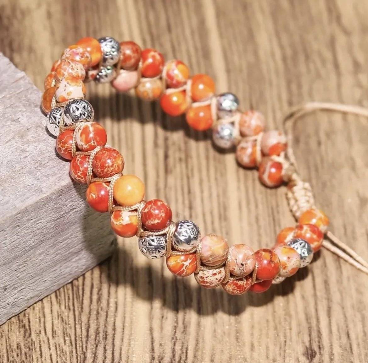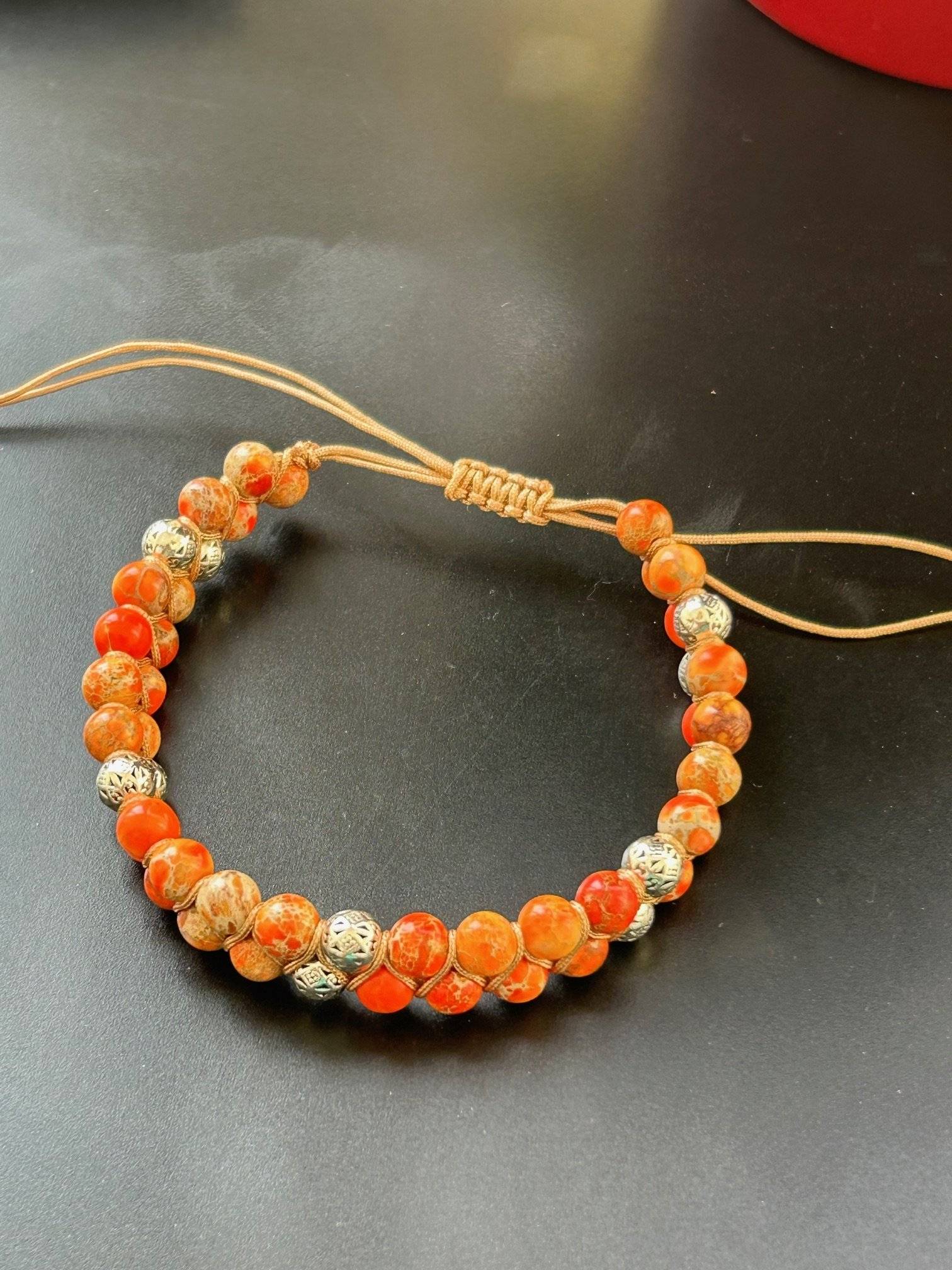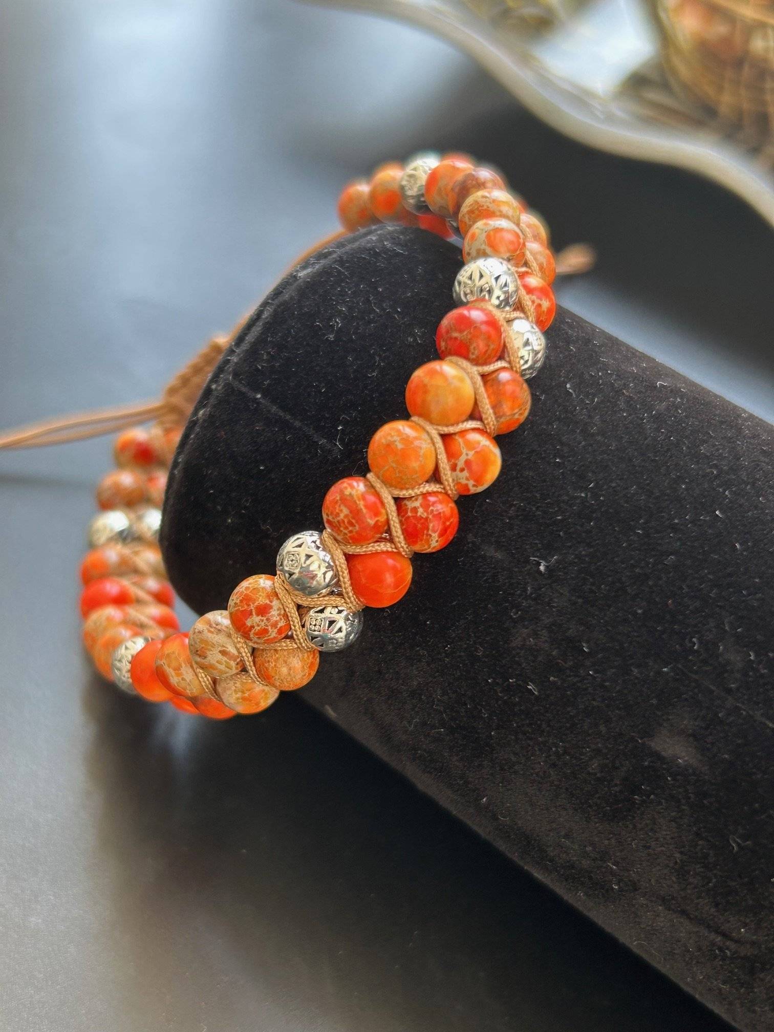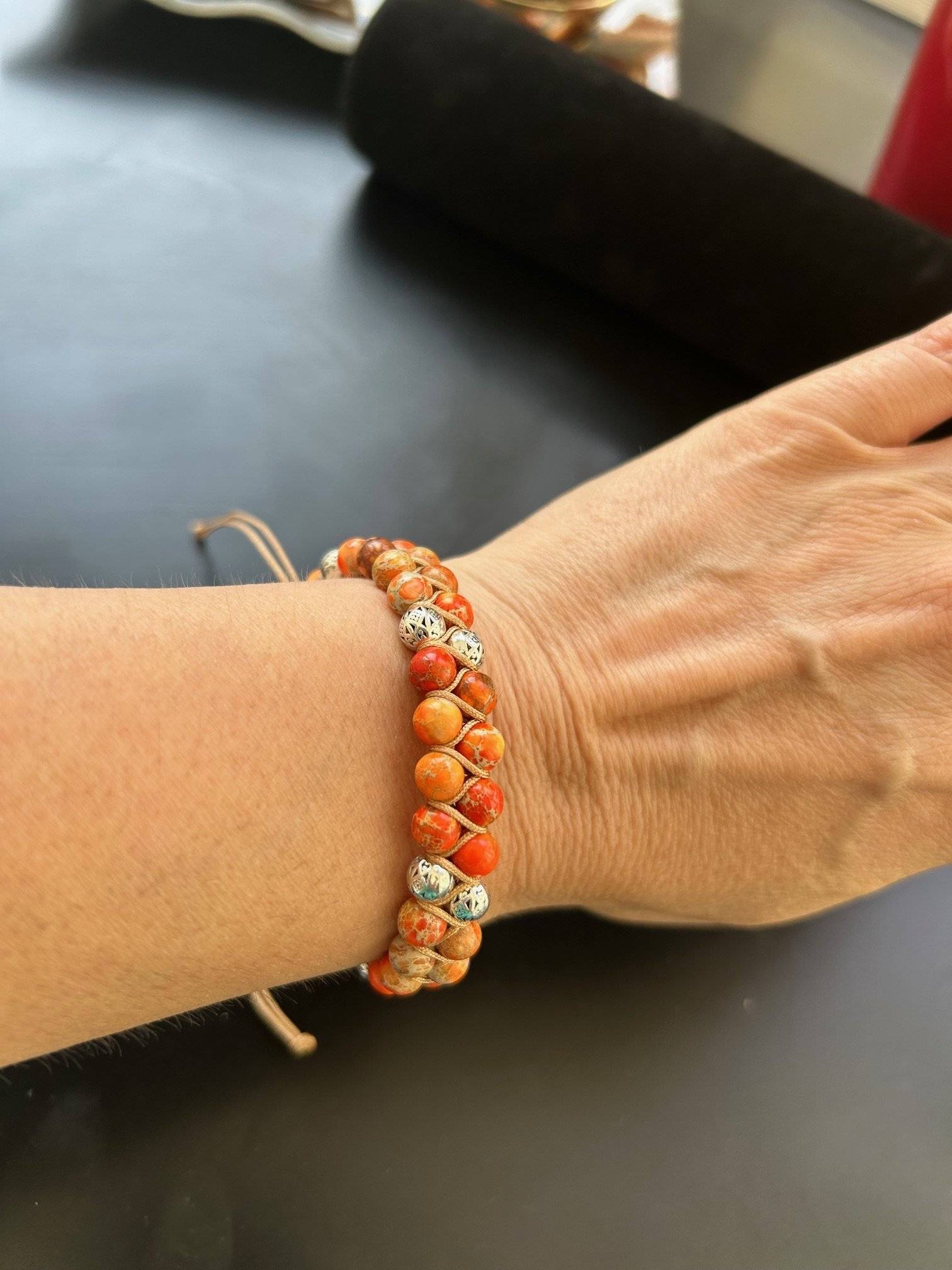 O brățară elegantă și surprinzătoare, împletită manual din 2 rânduri de sfere de jasp imperial portocaliu intens (de 6 mm) și câteva mărgeluțe metalice.