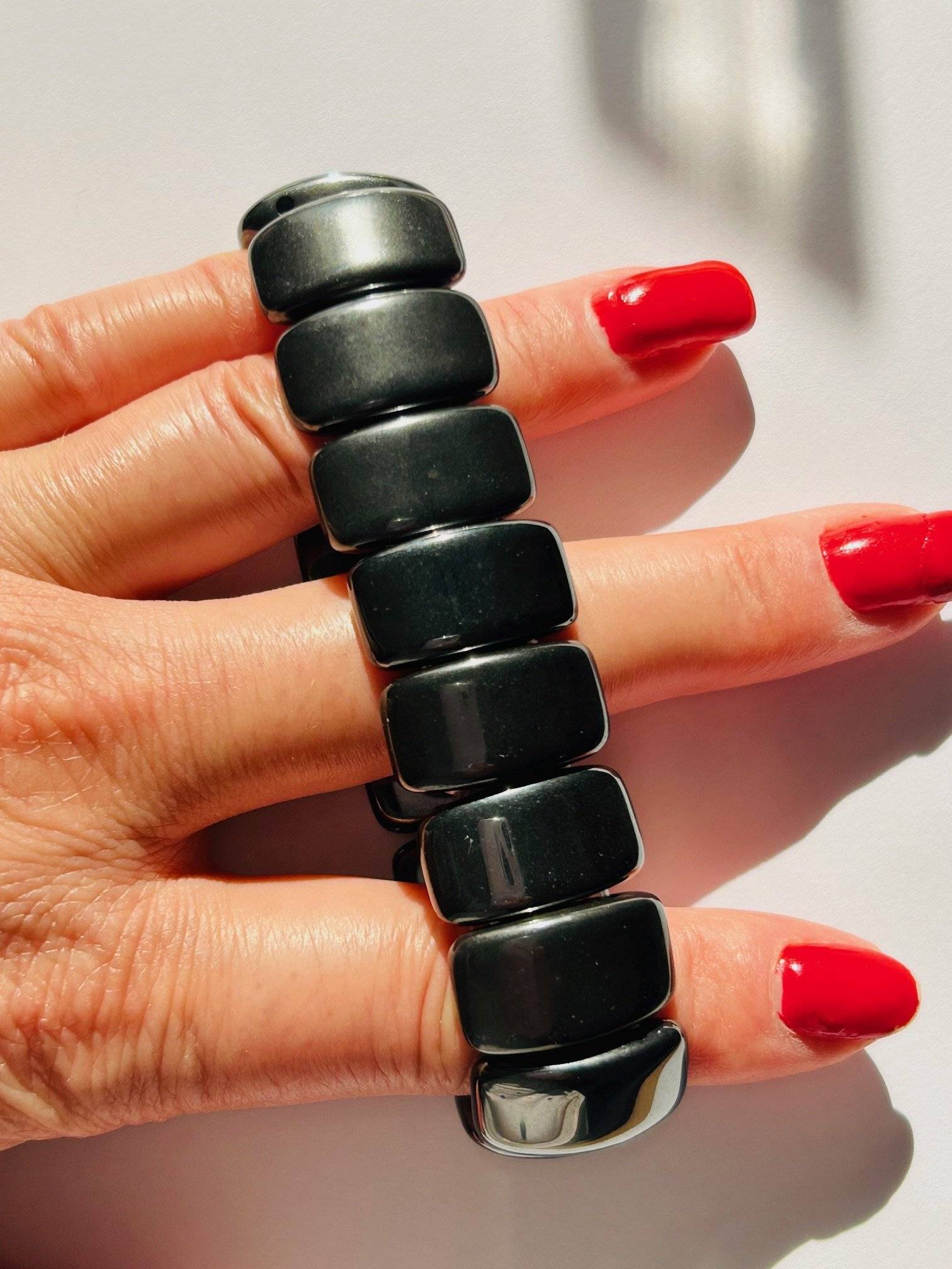 Brățară lată din pietre rulate de hematit, cu dimensiunea de 20x15 mm, înșirate pe dublu fir silicon elastic.