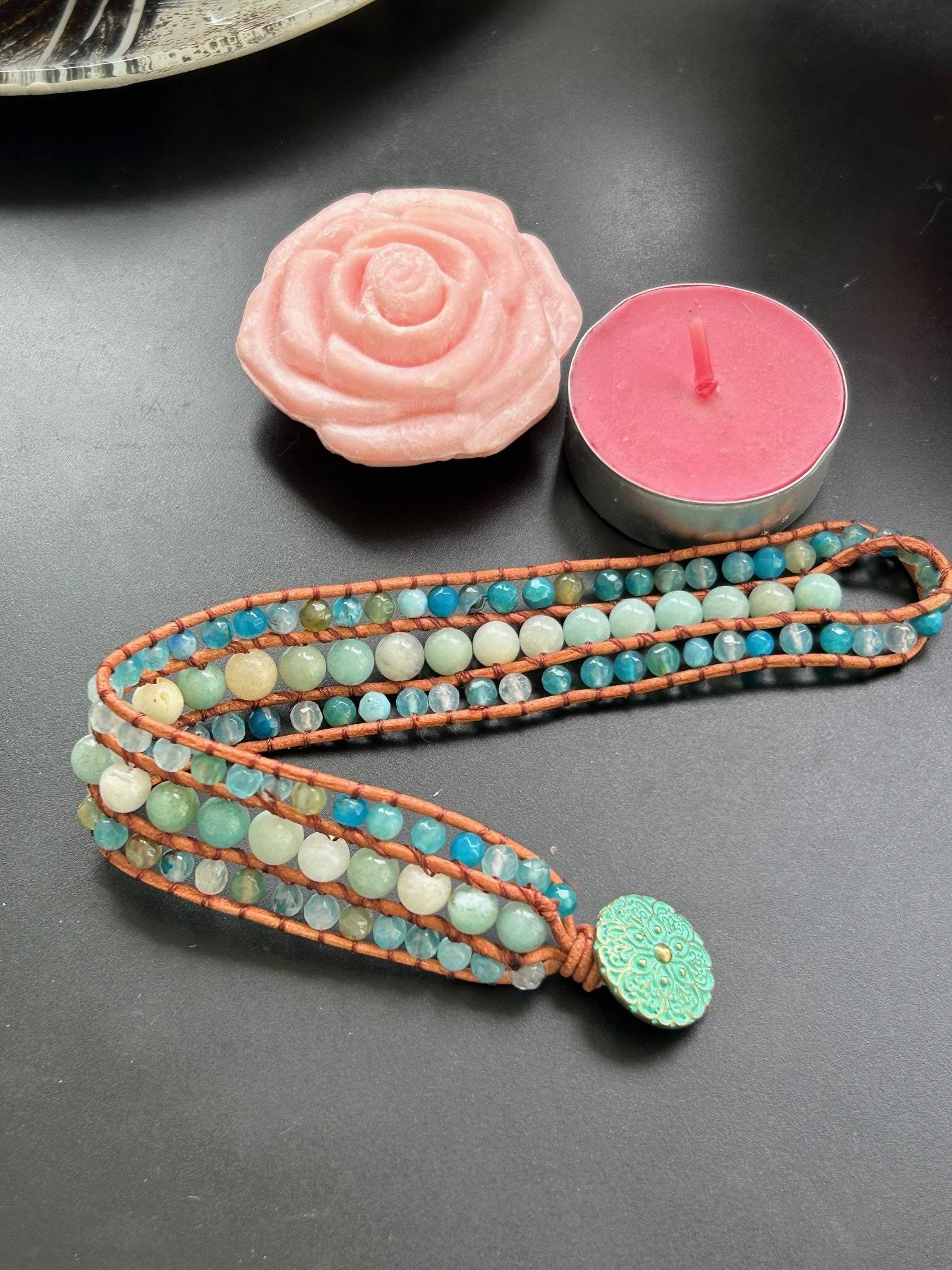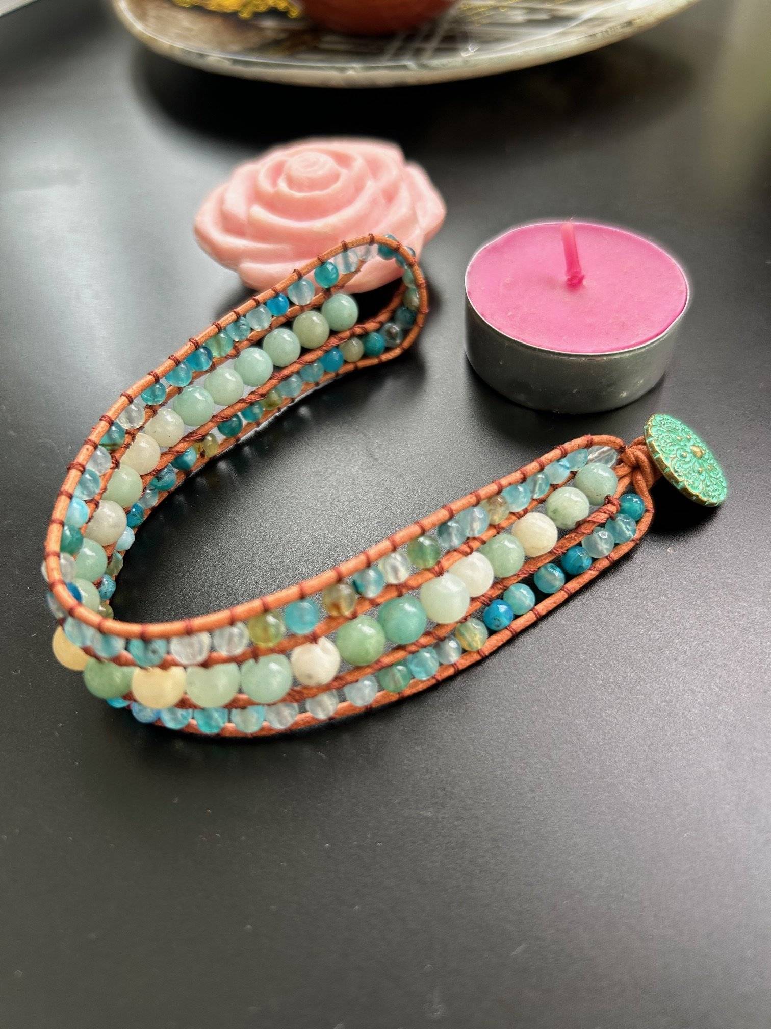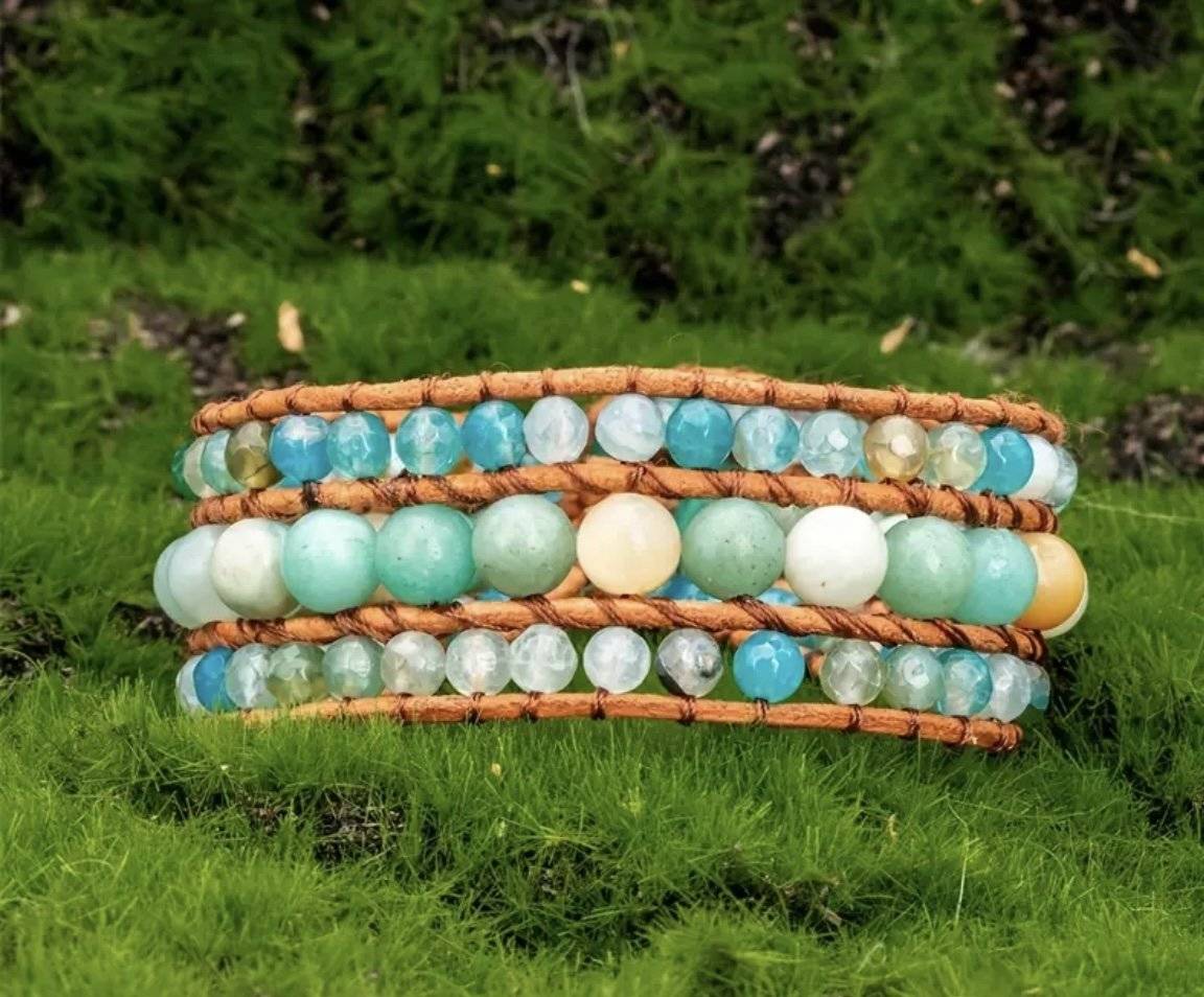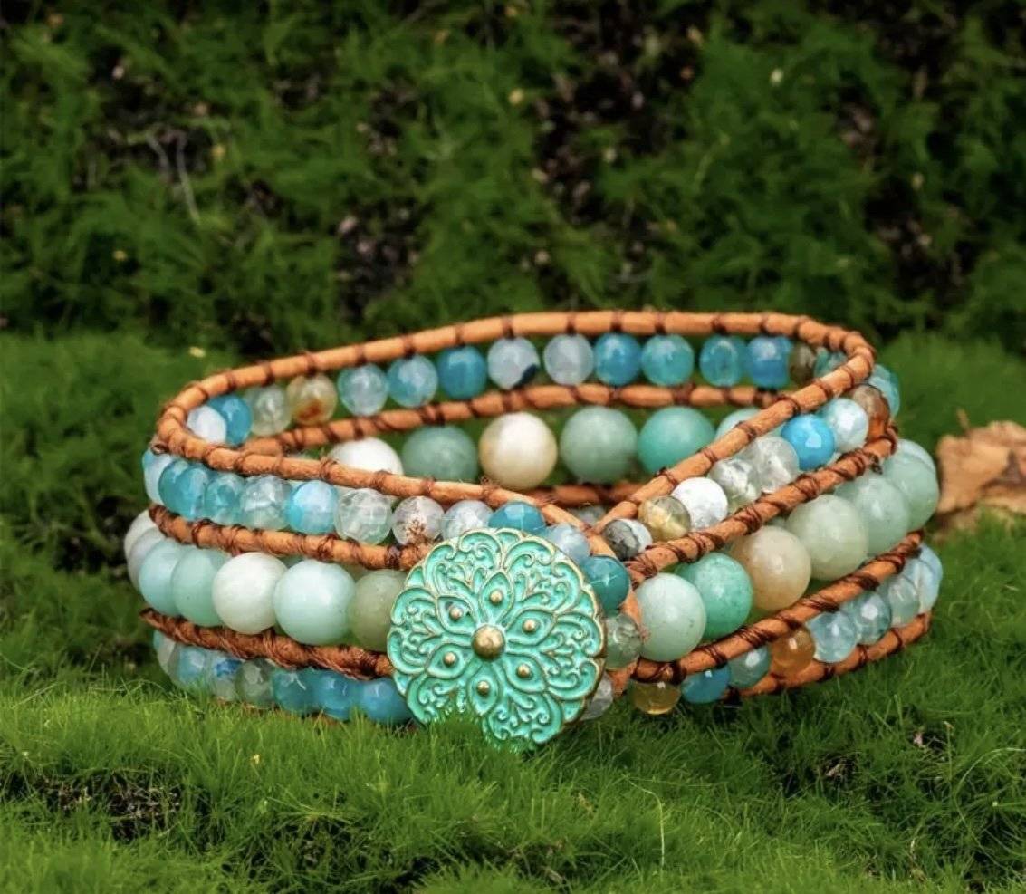 O brățară în culori sănătoase, împletită manual dintr-un rând de sfere de 6 mm din AMAZONIT la mijloc și alte două rânduri de sfere fațetate de 4 mm din amazonit, pe laterale.