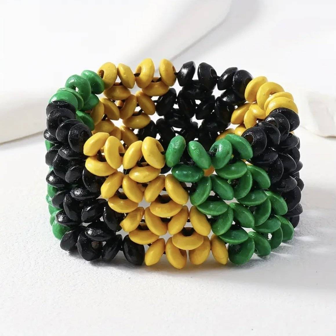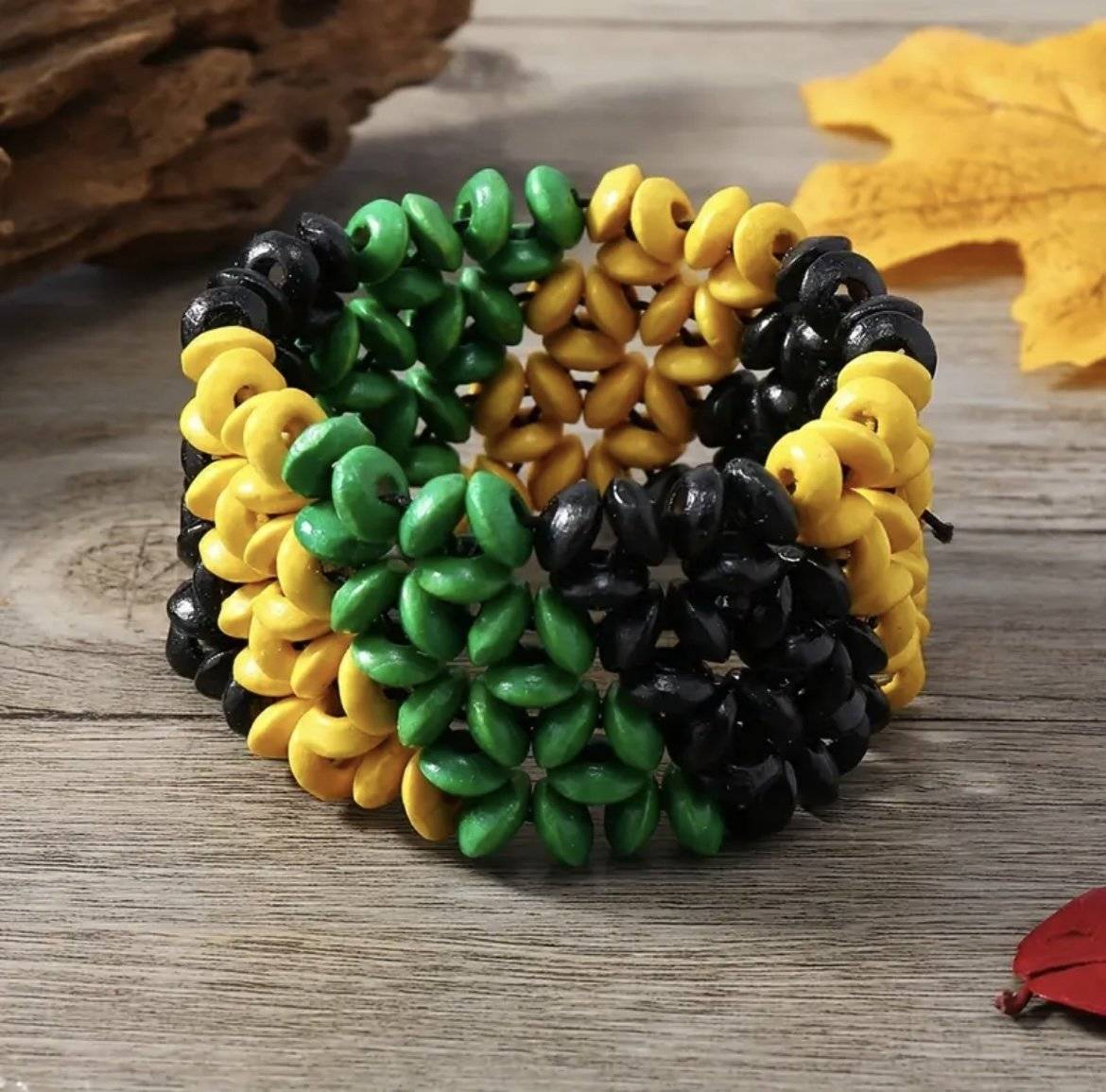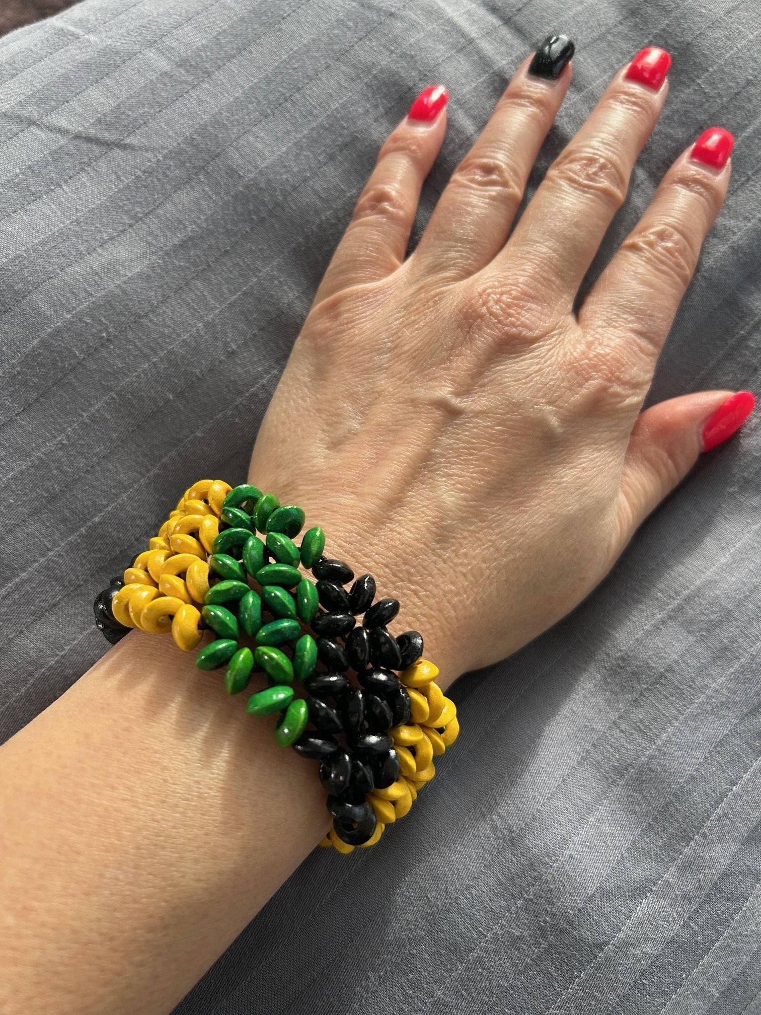 Brățară din lemn colorat, lucrată manual în trei culori: galben, verde și negru.