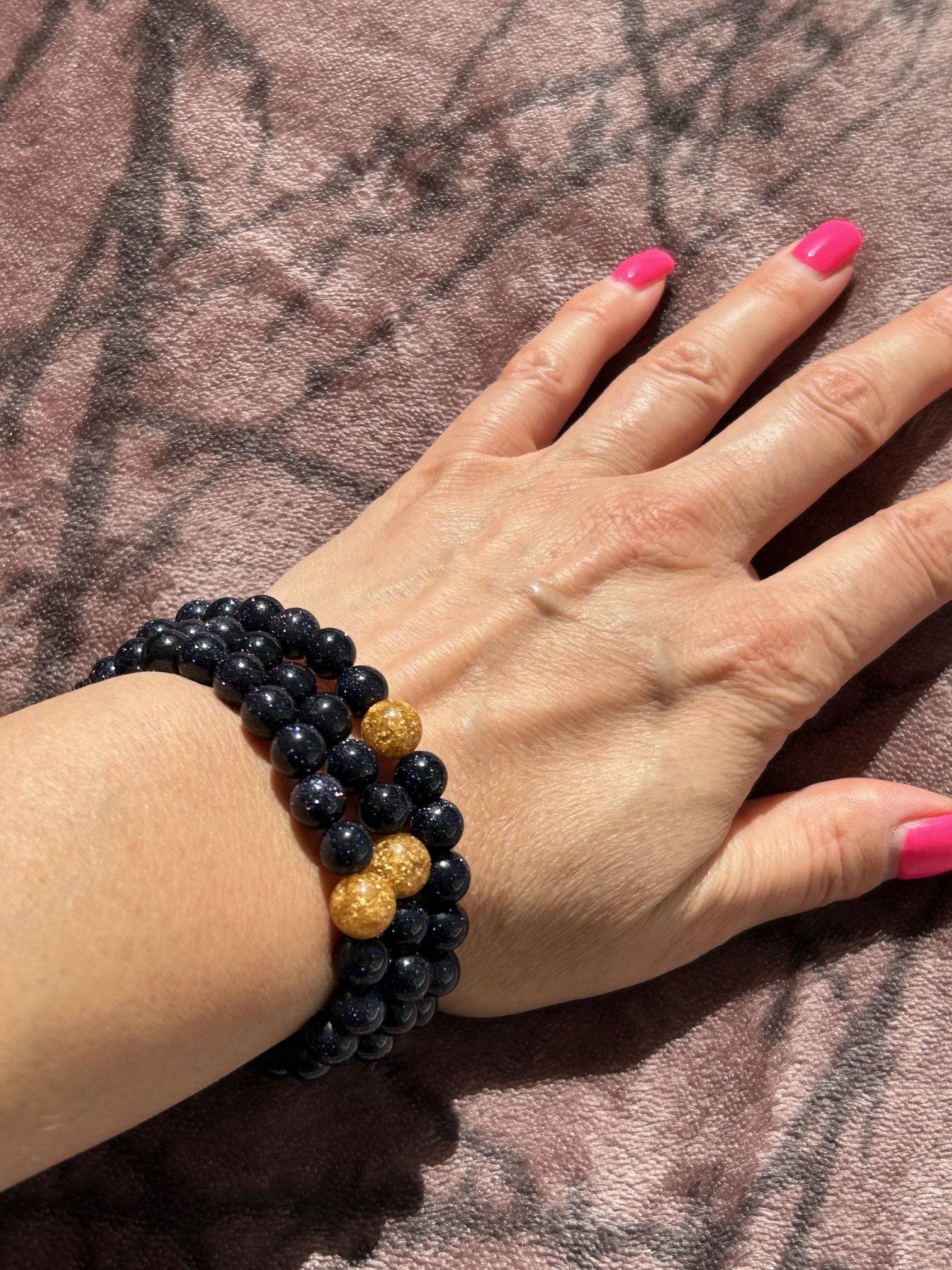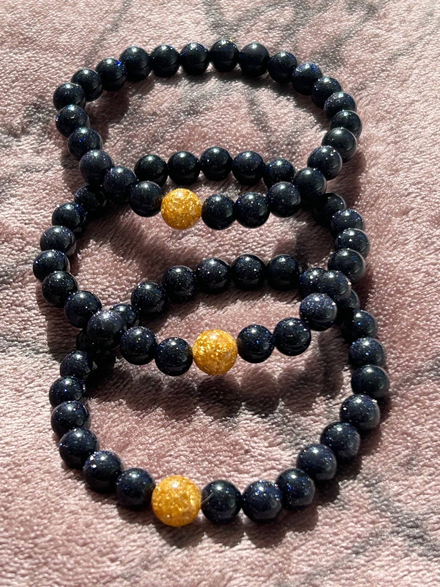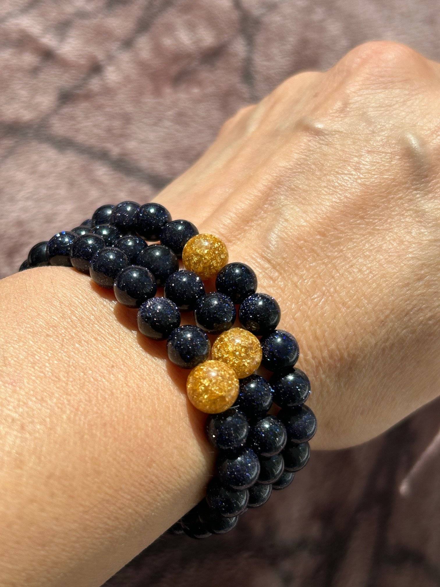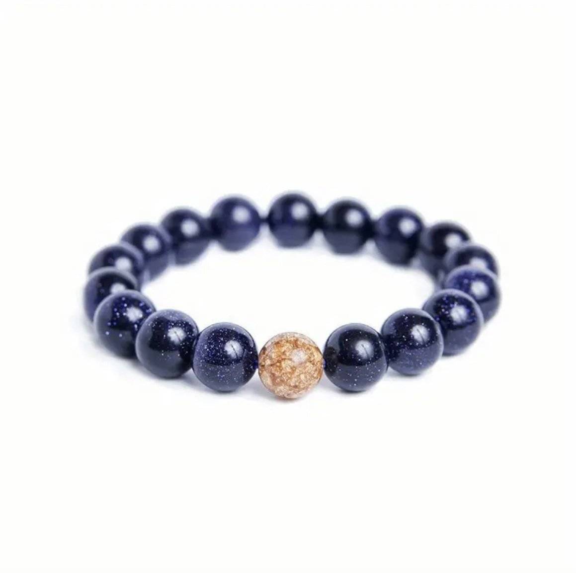O brățară în culori fascinante, realizată din 24 de sfere din piatra soarelui albastră, cu dimensiunea de 6 mm și o sferă de piatra soarelui maro de 8 mm, înșirate pe gută elastică.