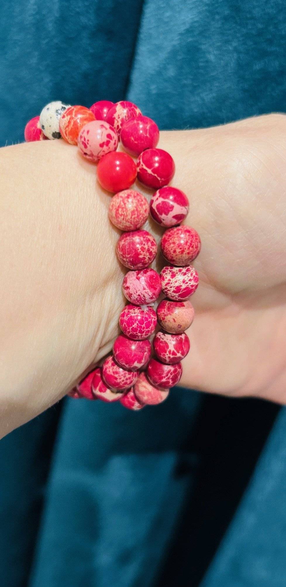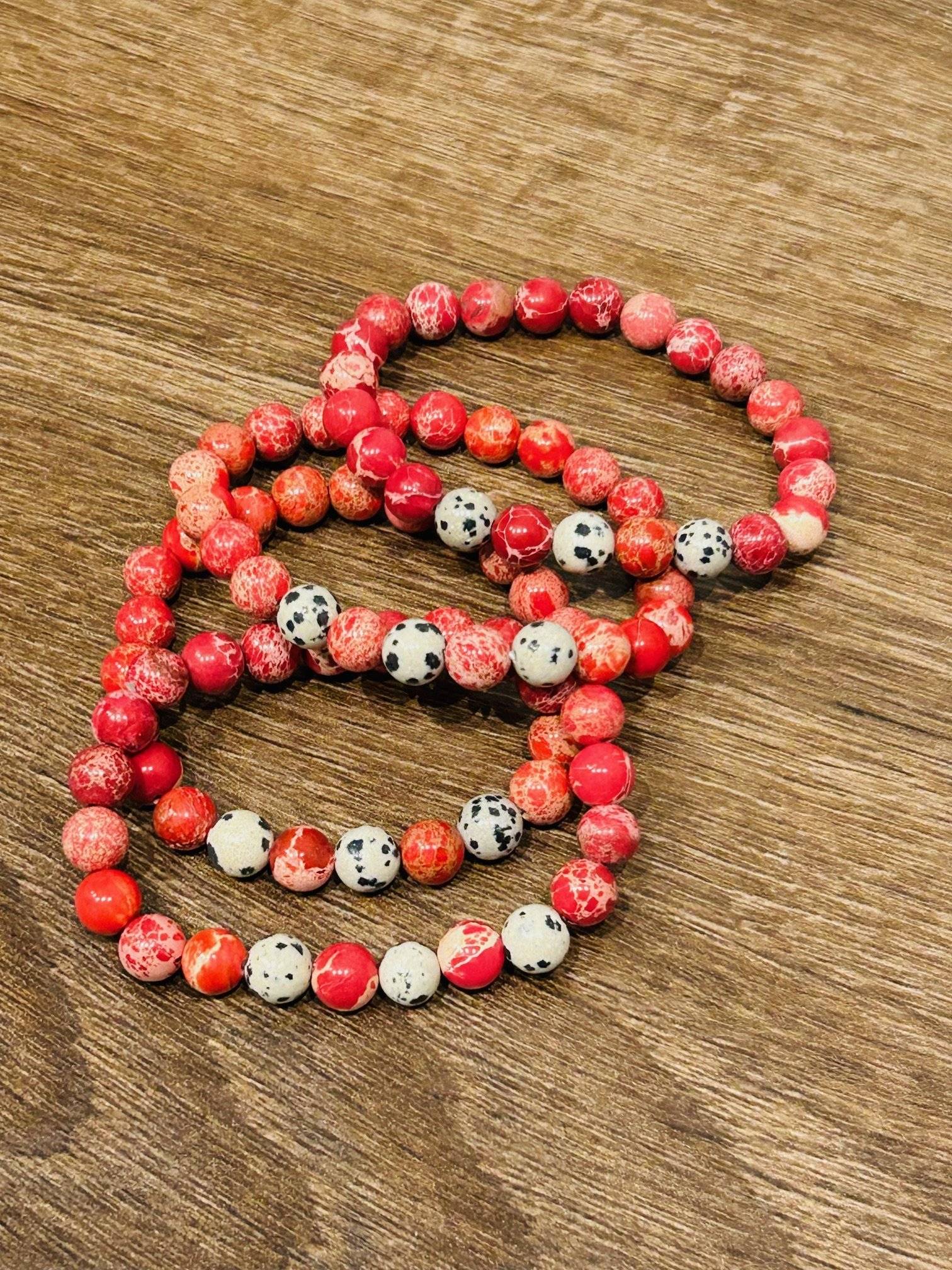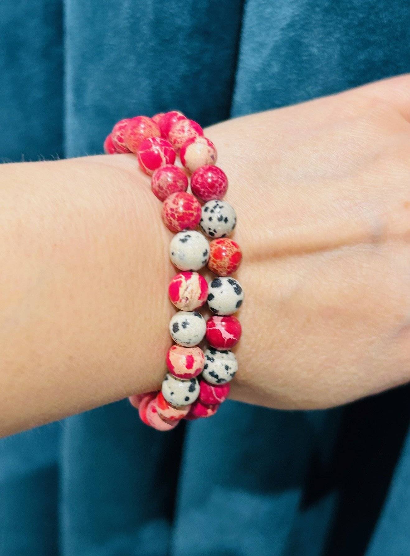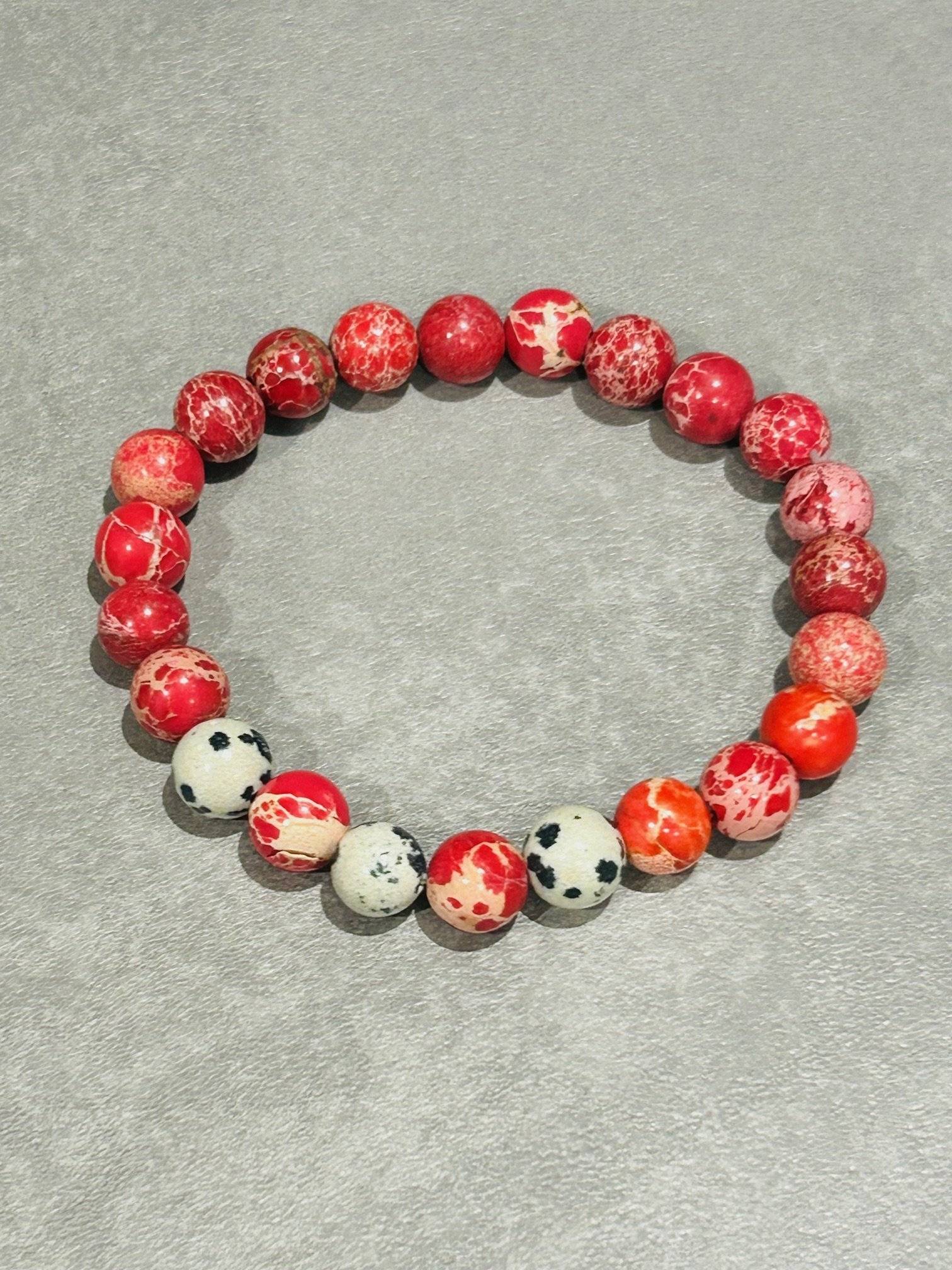 O brățară realizată din 23 sfere de regalite (jasp imperial) roșu și jasp dalmatian, cu dimensiunea de 8 mm, înșirate pe fir silicon elastic.