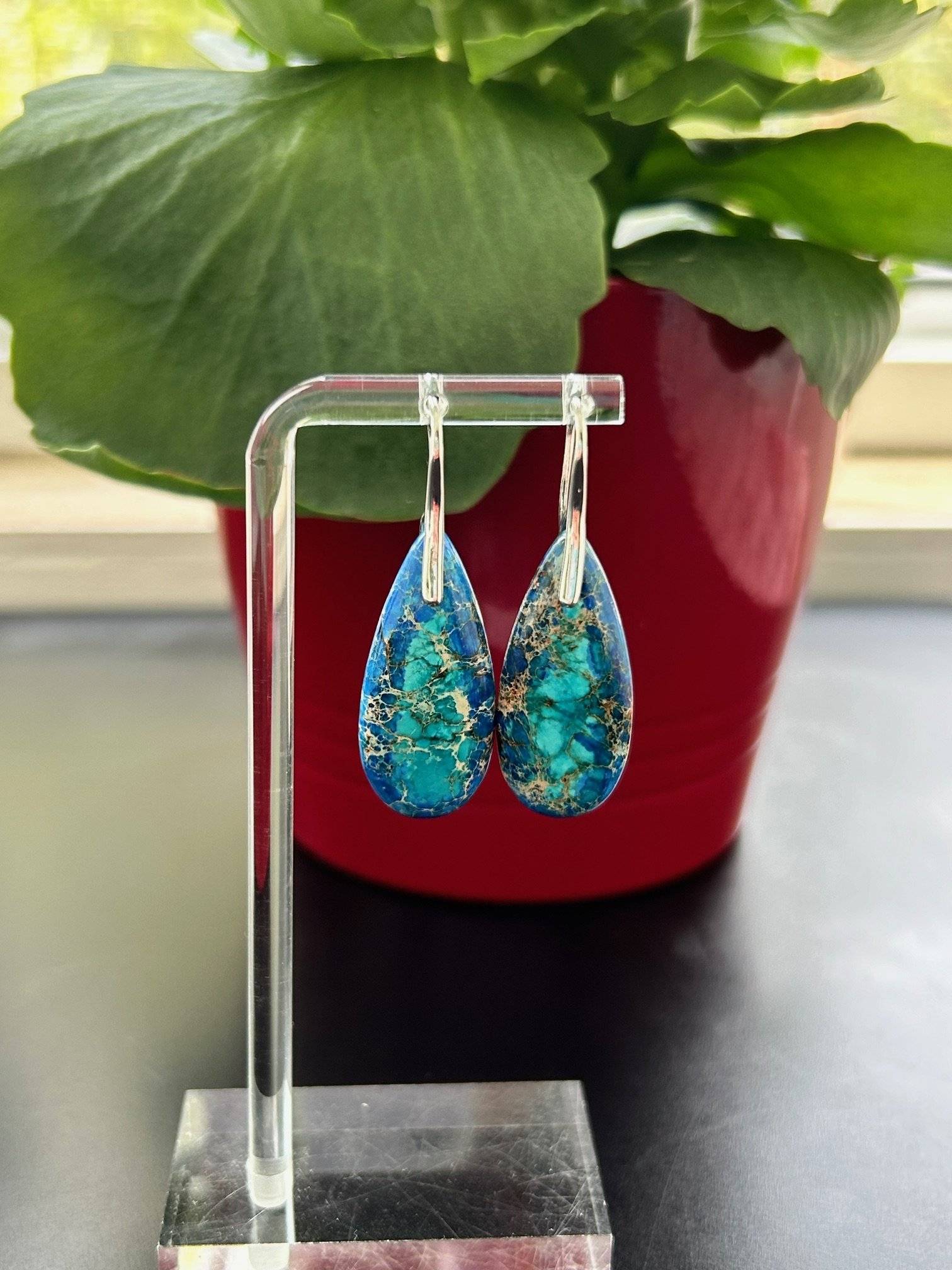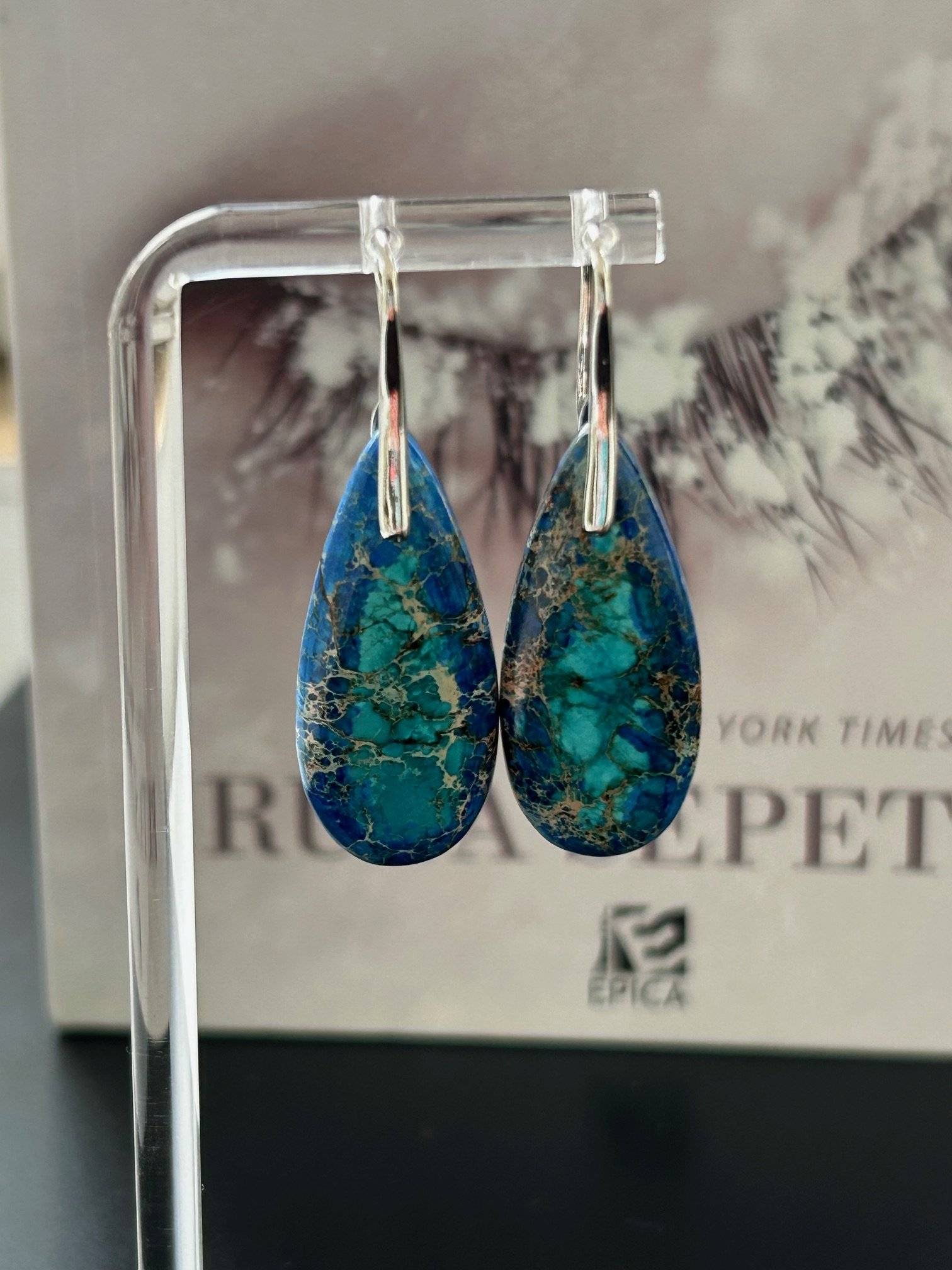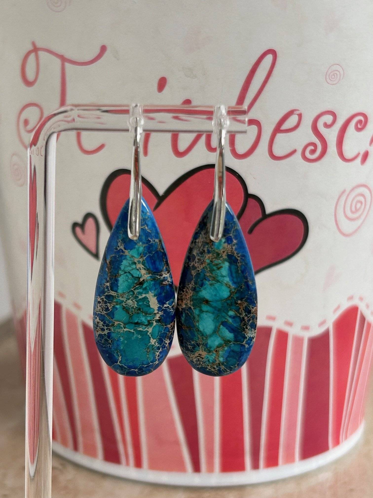 O pereche de cercei cu piatră JASP IMPERIAL, în nuanțe albastru si turcoaz.