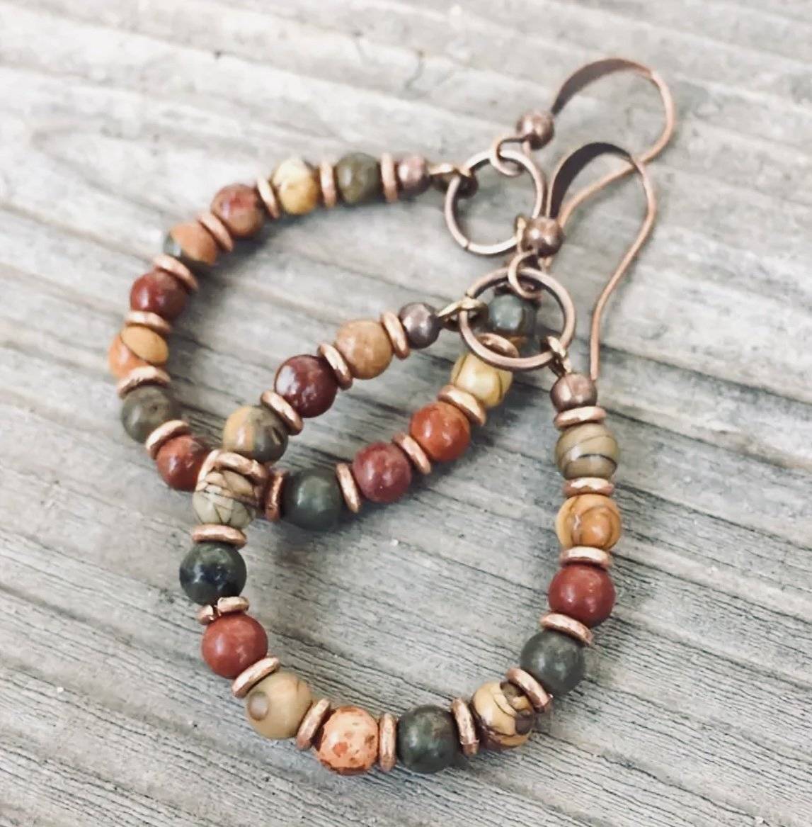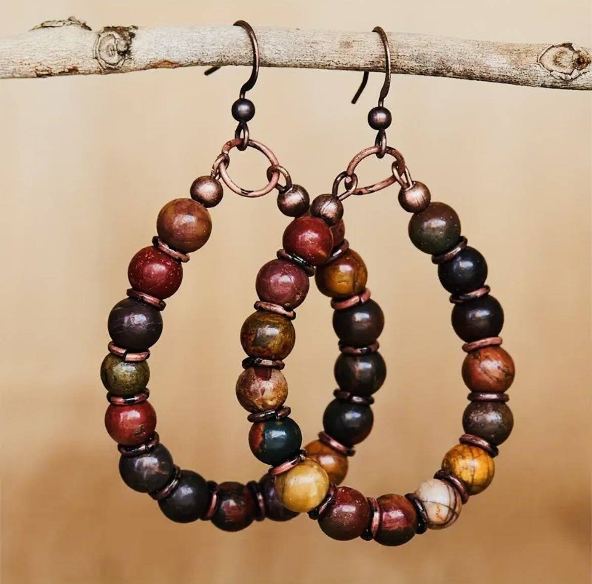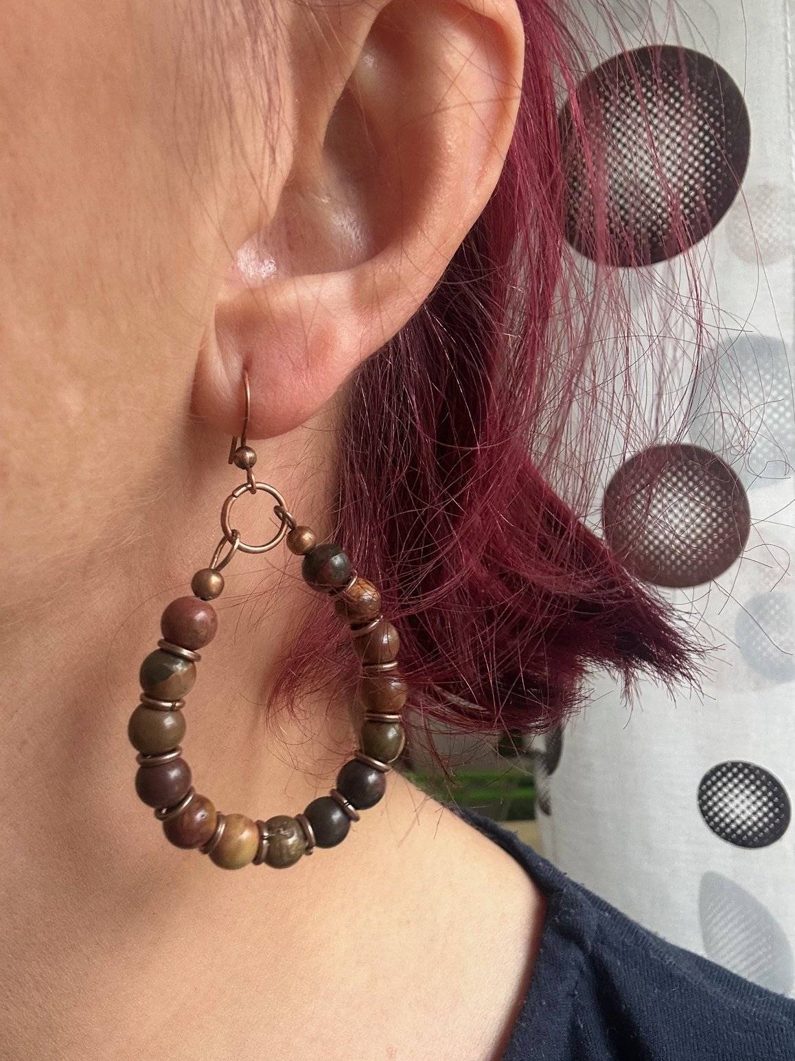 O pereche de cercei din aliaj aspect cupru, cu pietre de jasp mookait.