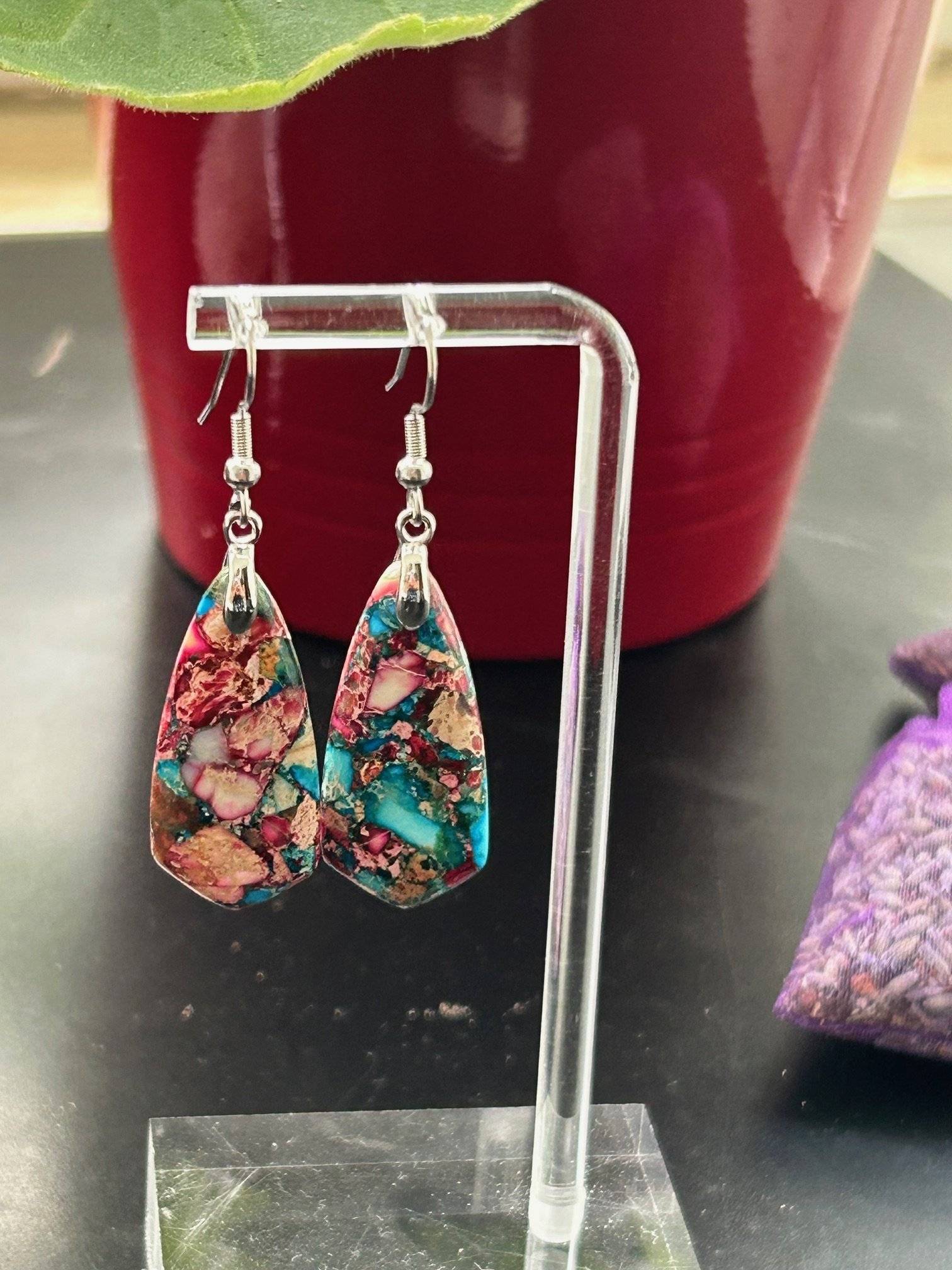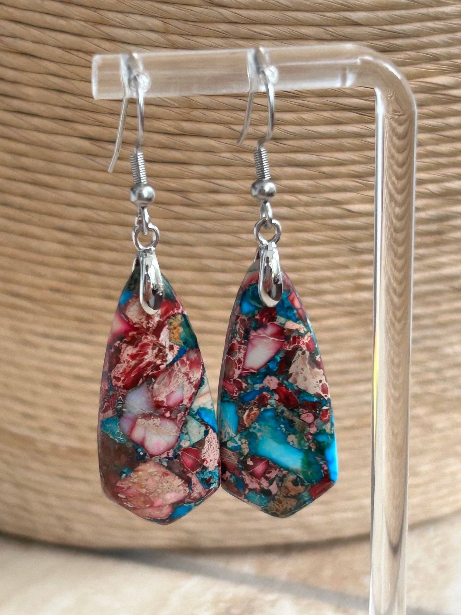 O pereche de cercei cu piatră JASP IMPERIAL, în nuanțe albastru și roșu.