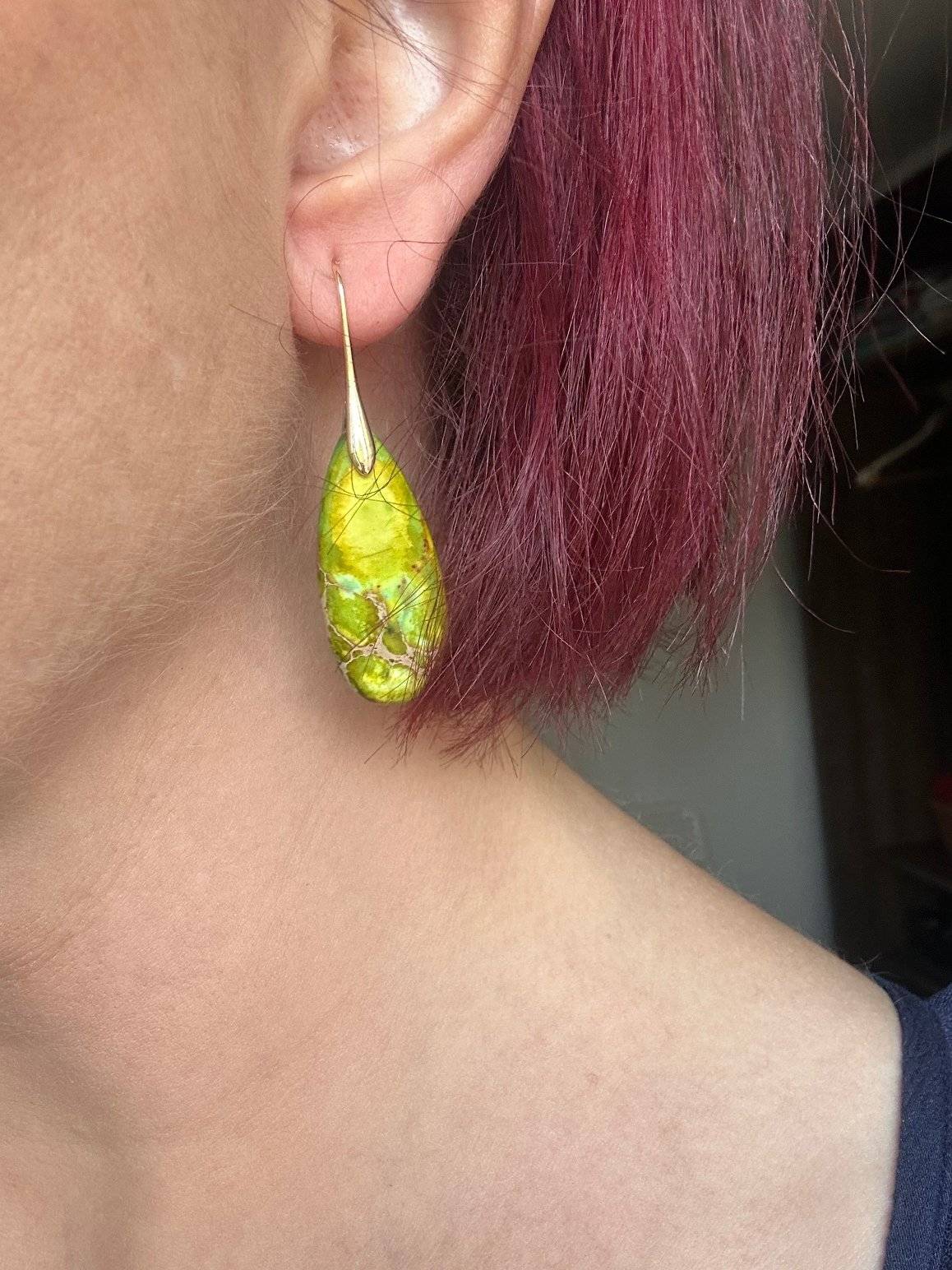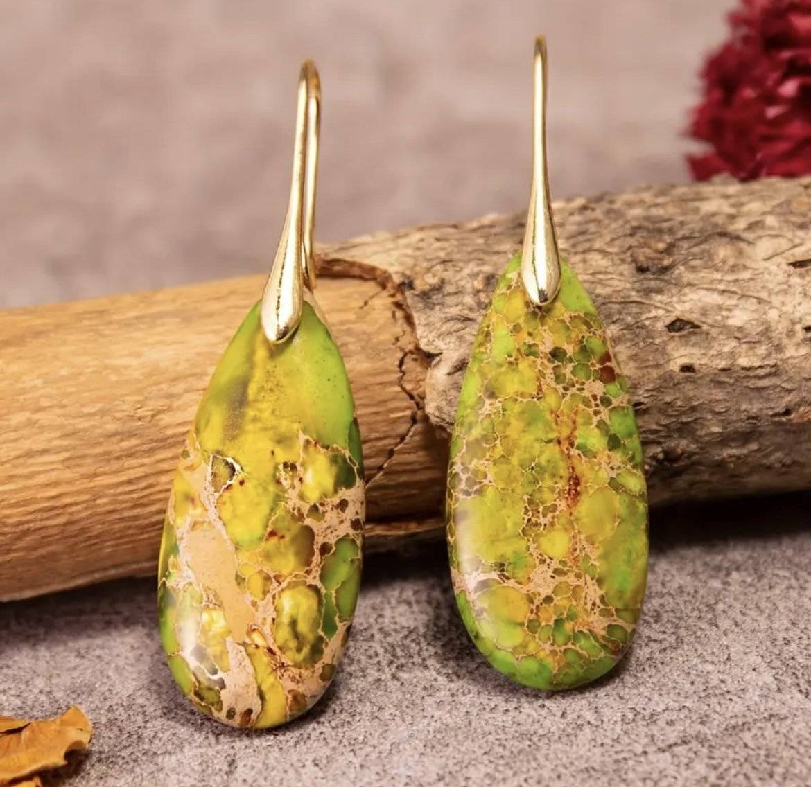 O pereche de cercei cu piatră JASP IMPERIAL, în nuanțe de verde crud .
