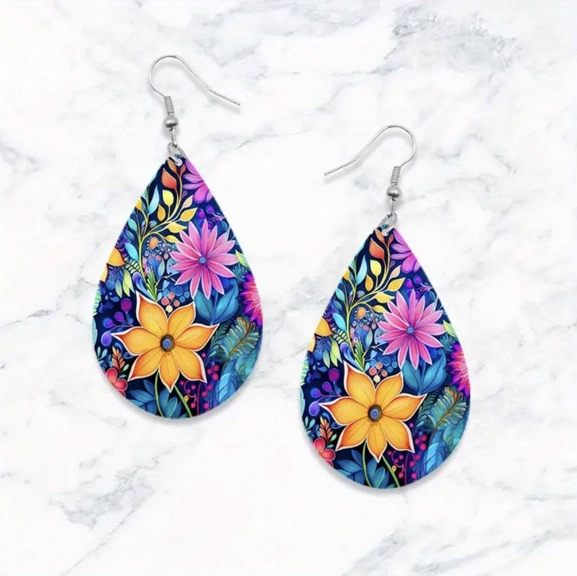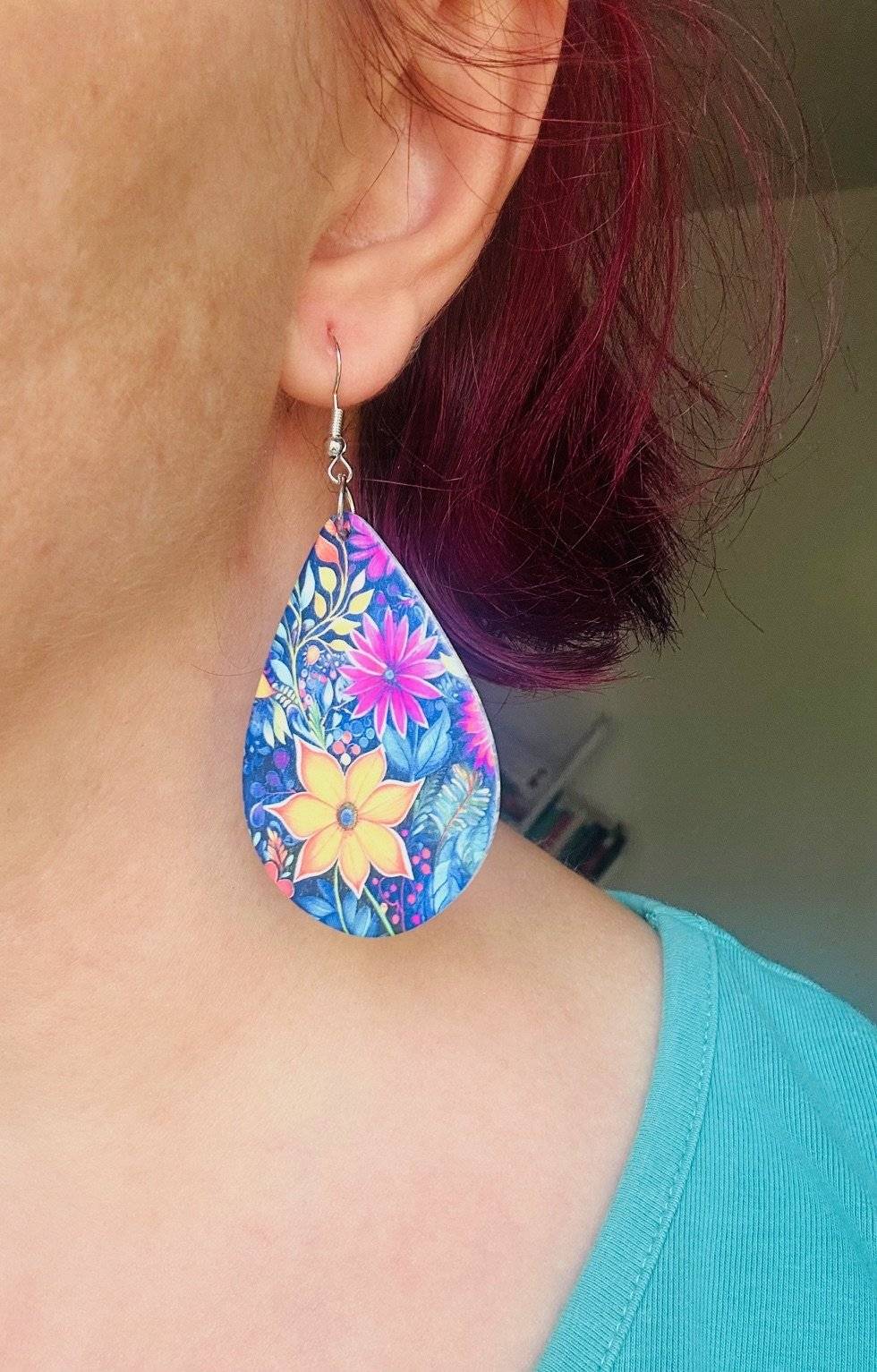 O pereche de cercei confecționațI din lemn, model lacrimă, colorată.