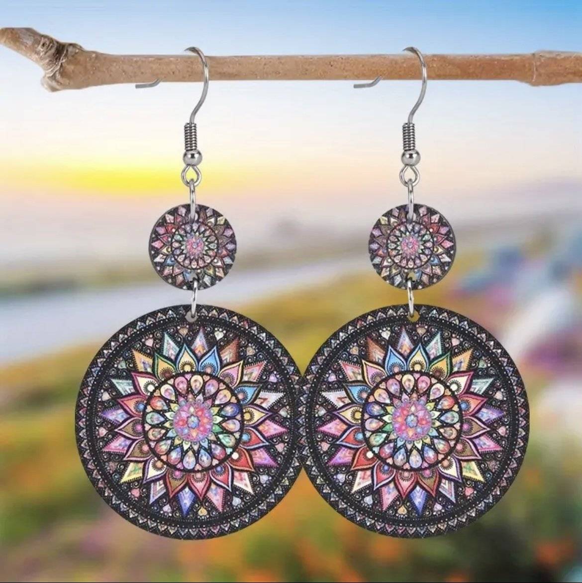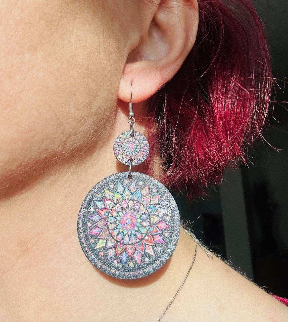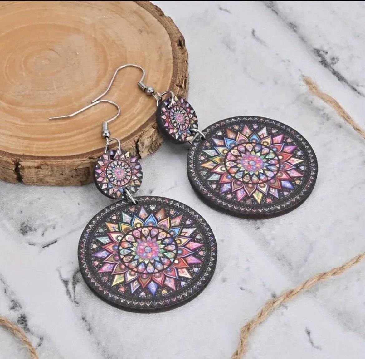 O pereche de cercei confecționațI din lemn, model mandala mică și mare, colorată.