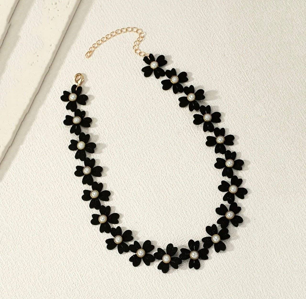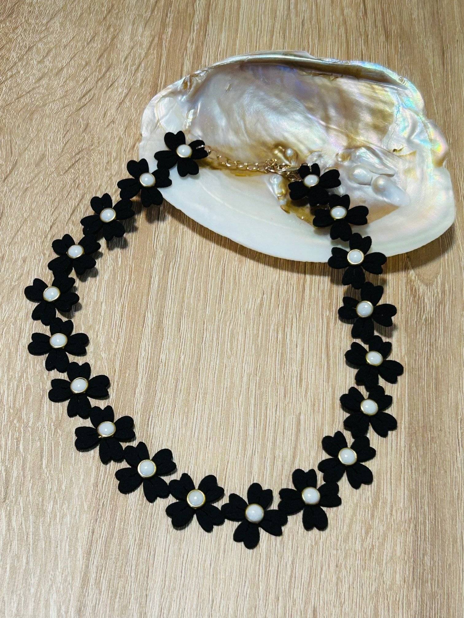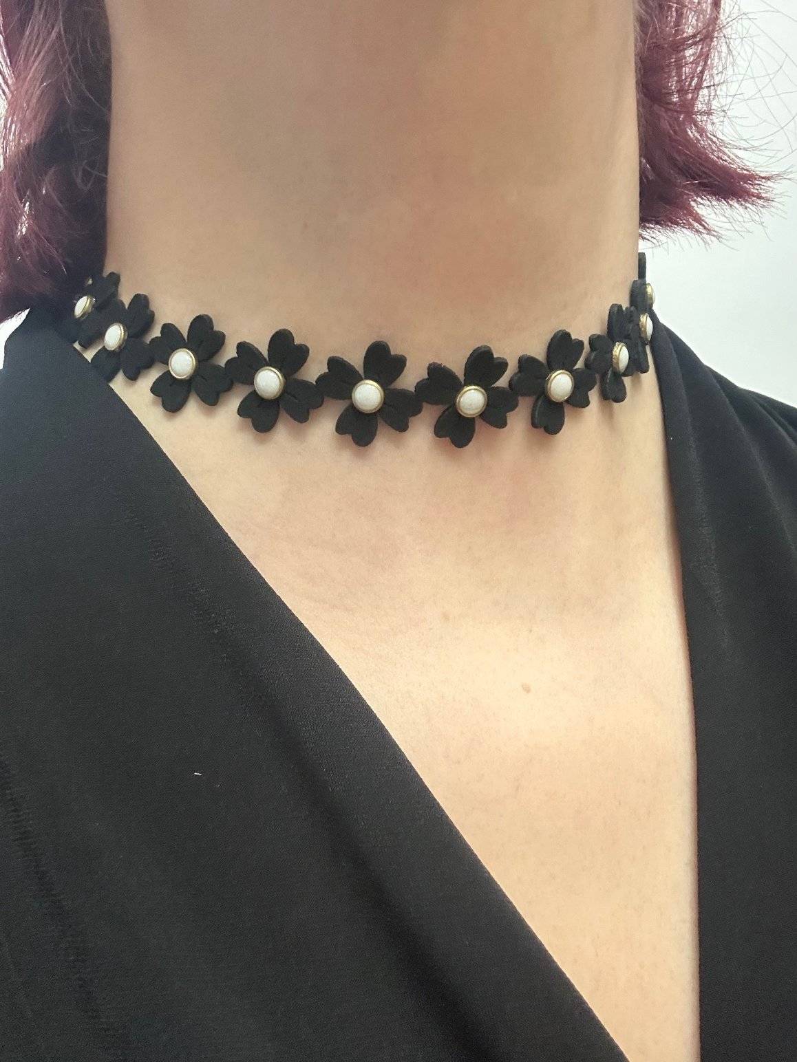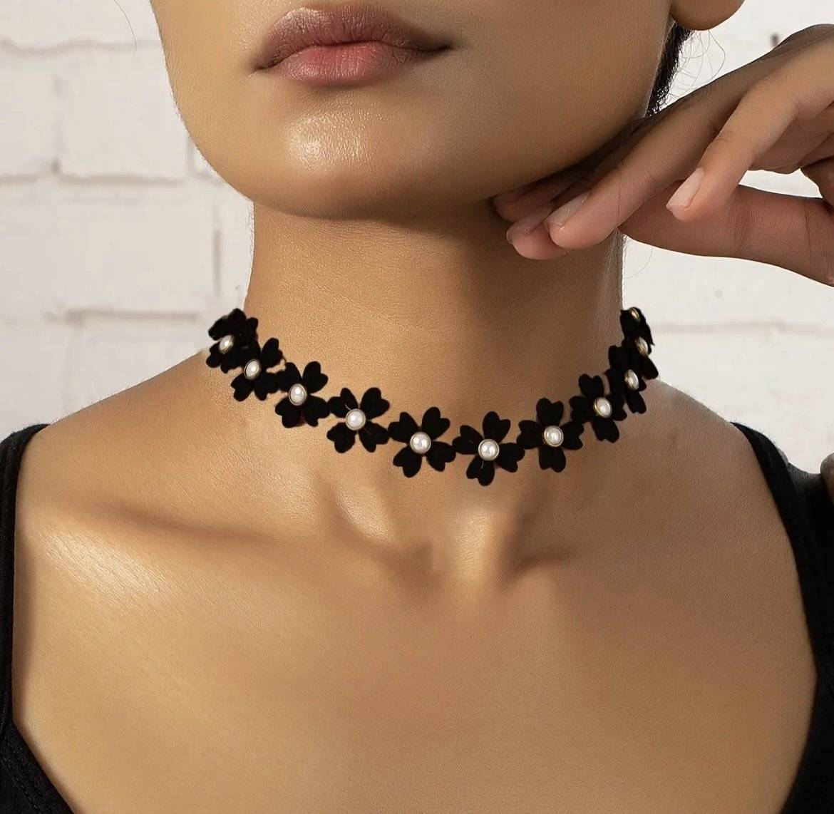 Vă prezentăm un choker finuț, la baza gâtului, confecționat din catifea pe care sunt aplicate floricele alb-gălbui.