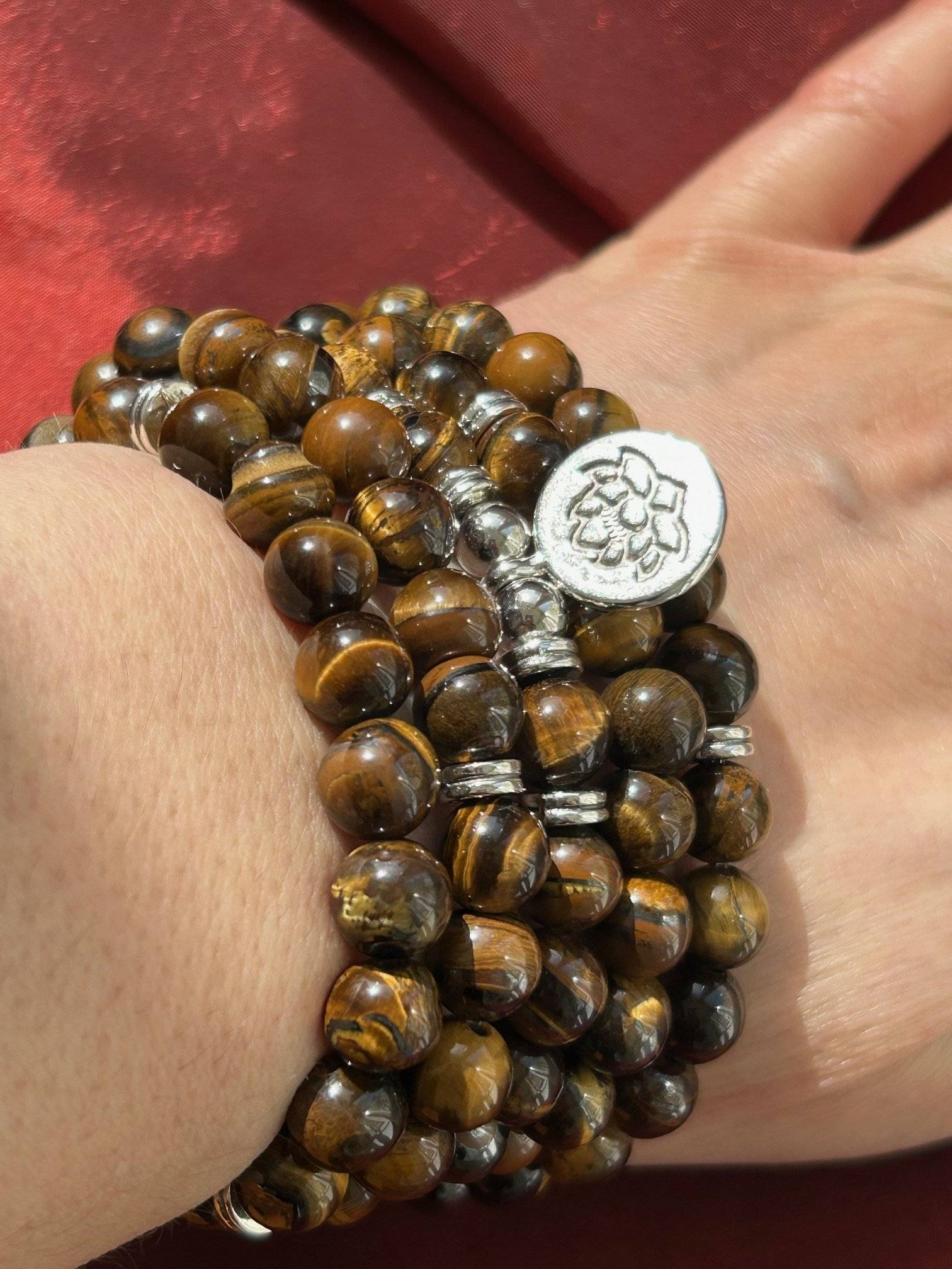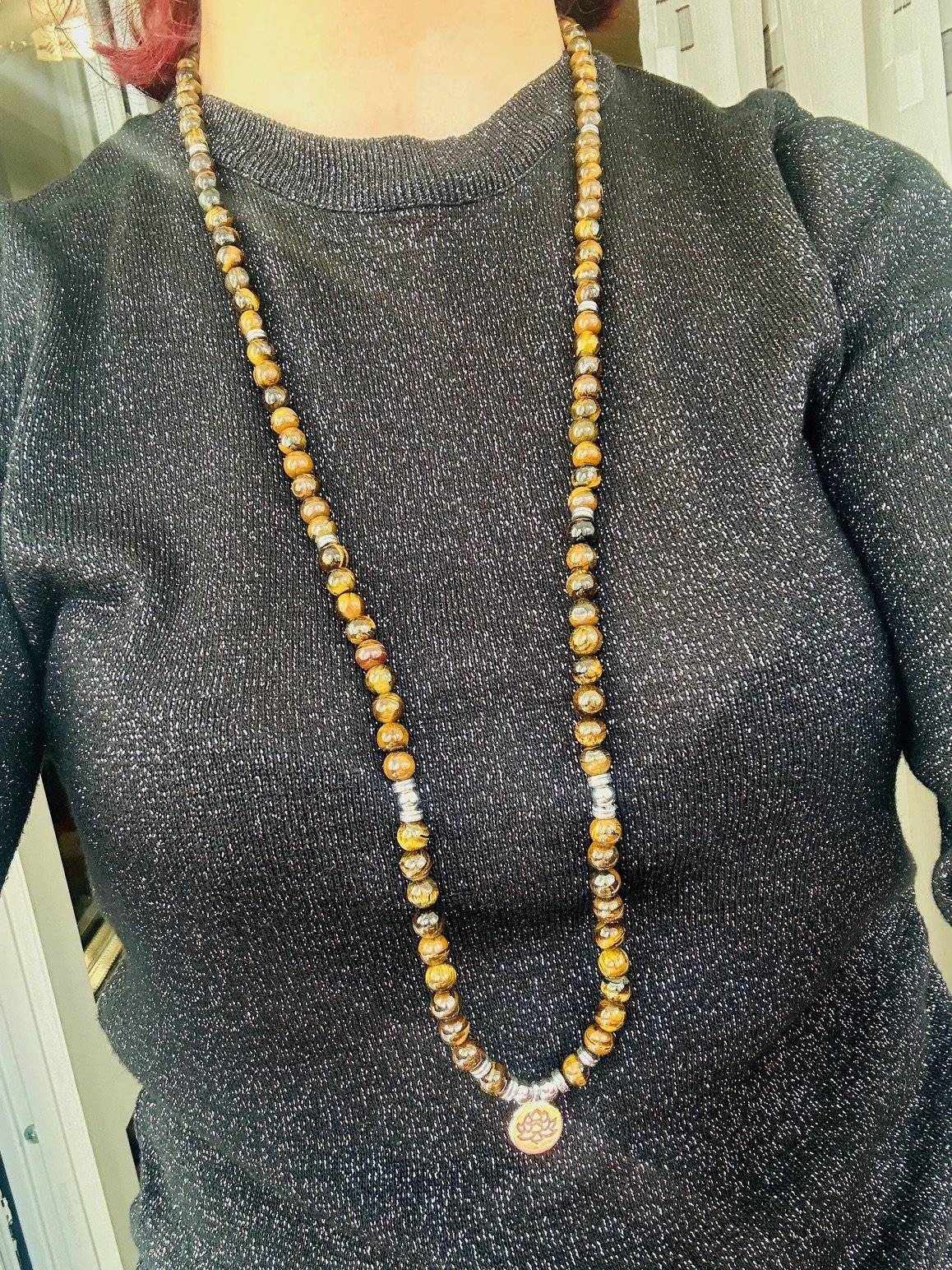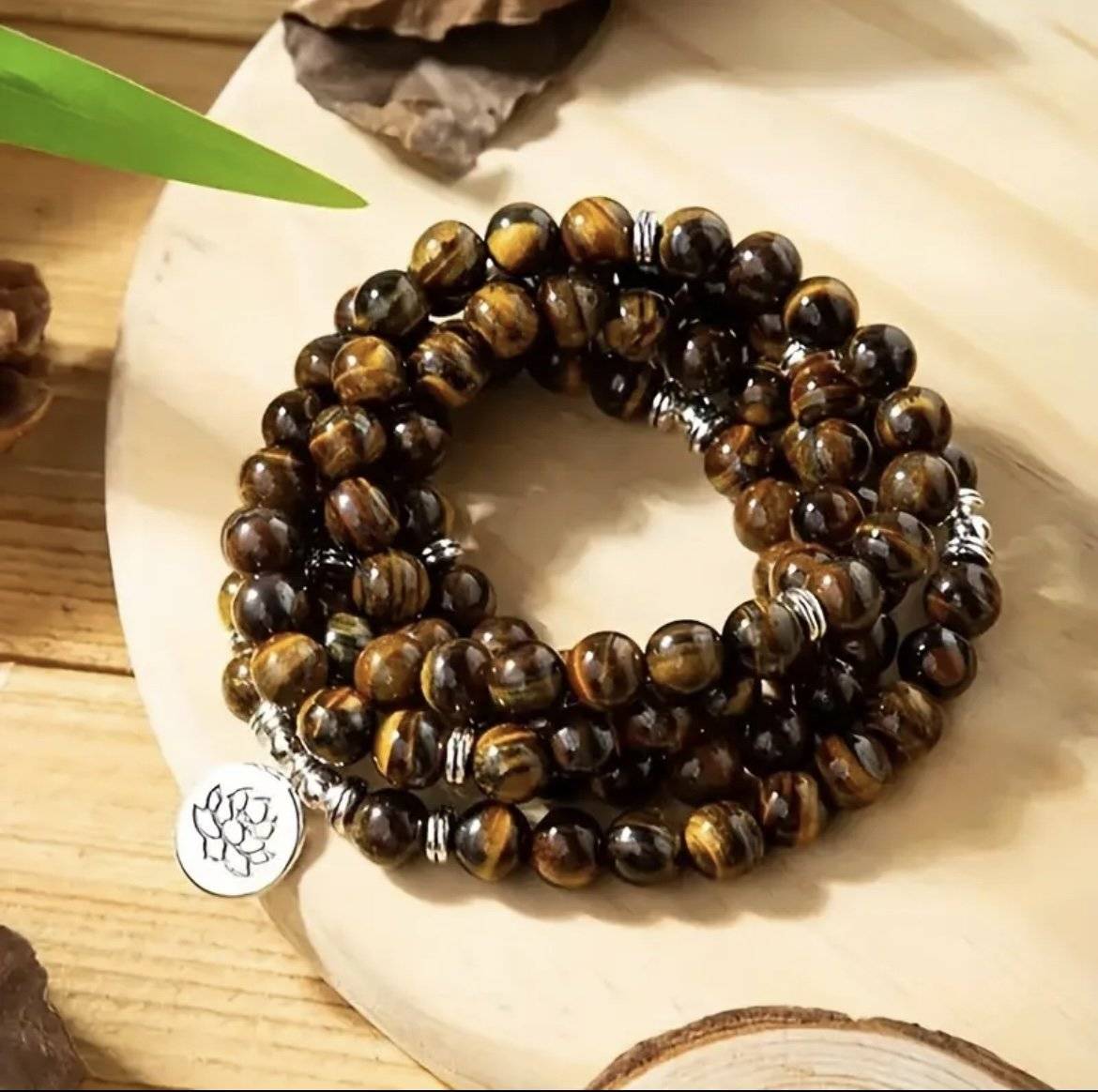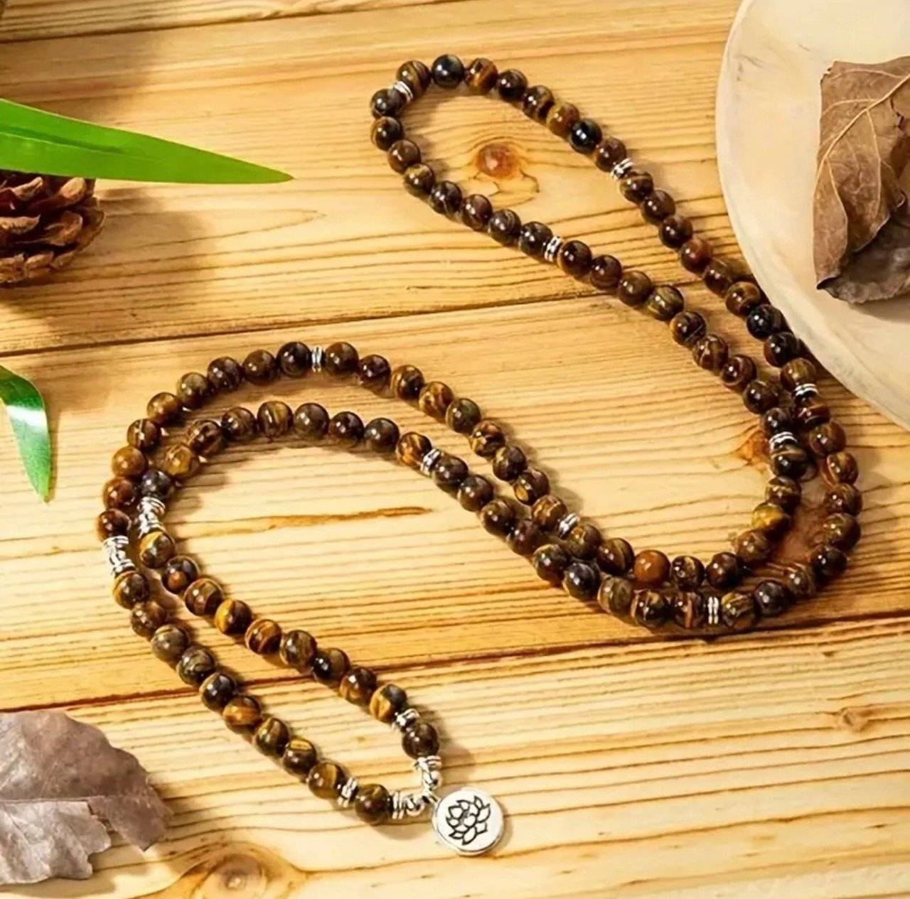 Colier din 108 sfere de OCHI DE TIGRU MARO, cu dimensiunea de 8 mm și mărgeluțe metalice și simbolul Lotusului - simbol al păcii, eternității, trezirii spirituale, purității și credinței.
