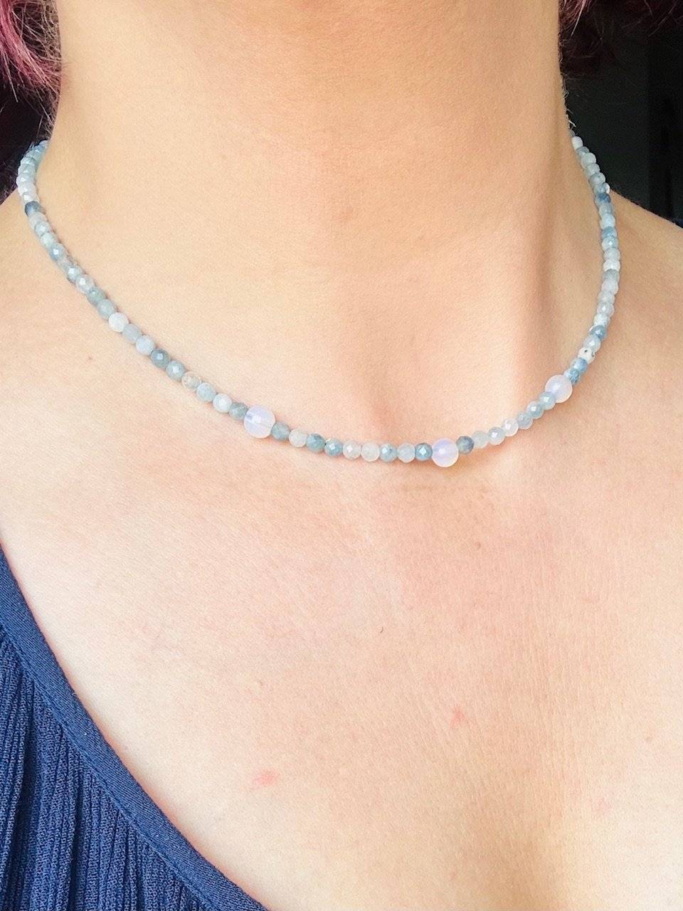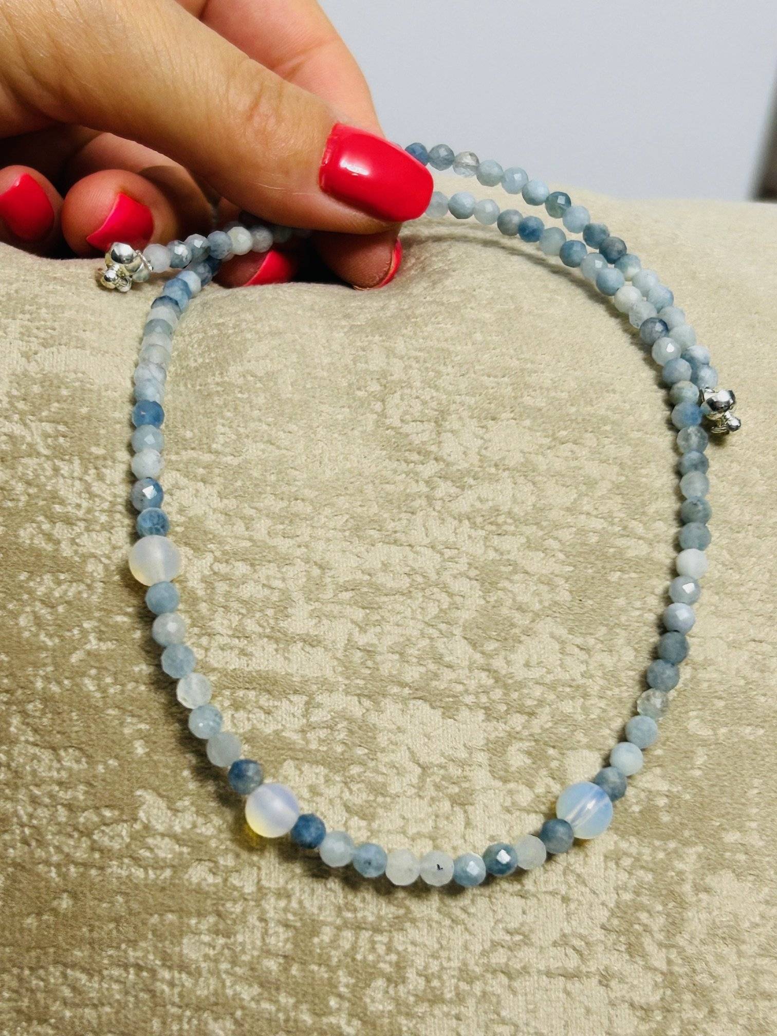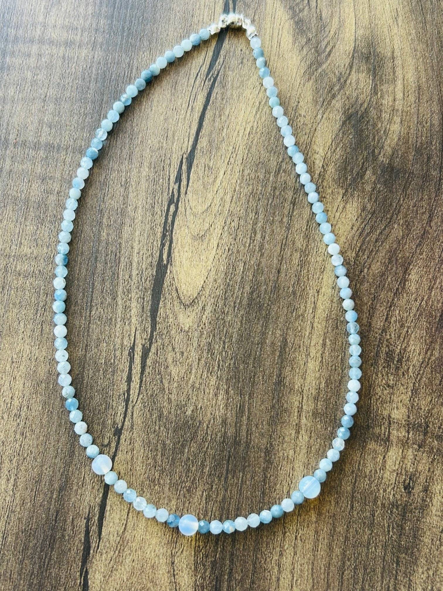 Lungimea colierului de acvamarin este de cca. 42 cm.