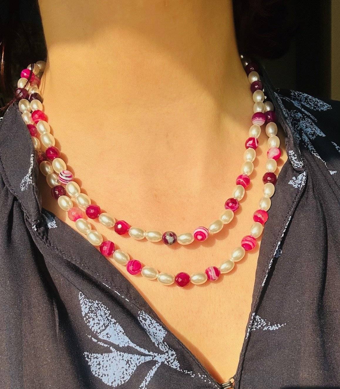 - agate dantelate fucsia, sfere fațetate cu dimensiunea de 8 mmLungimea colierului este de cca. 100 cm și poate fi purtat și dublat la gât.