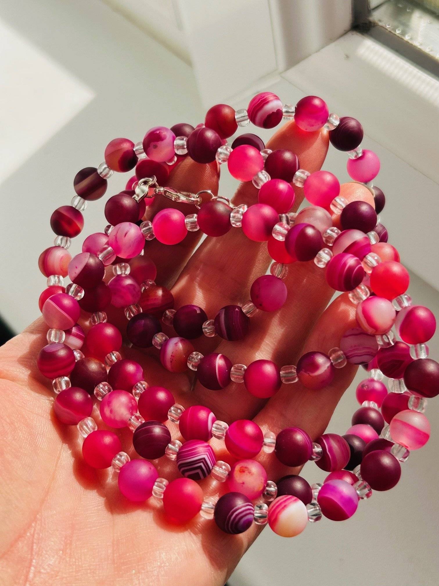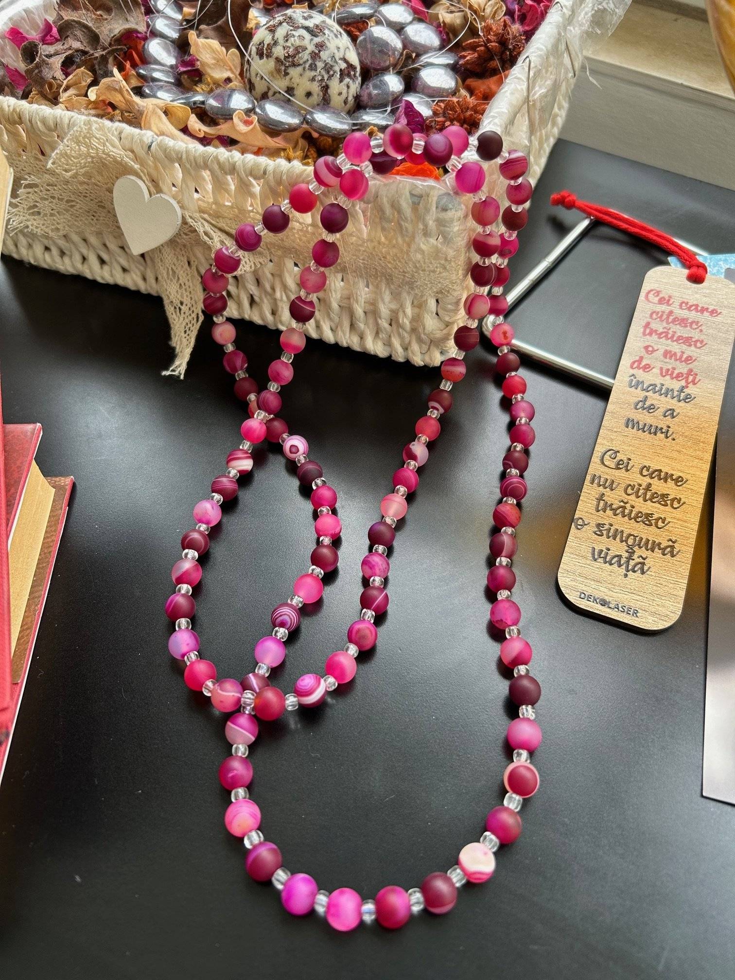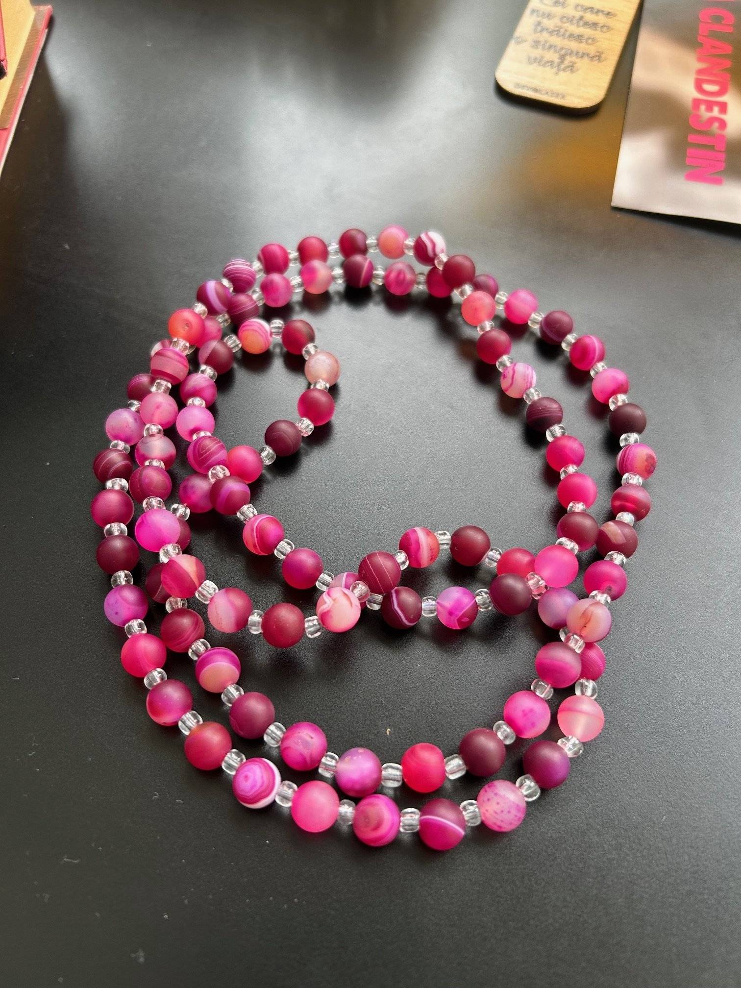 - agate dantelate fuchsia frosted, sfere semiprețioase cu dimensiunea de 8 mm;