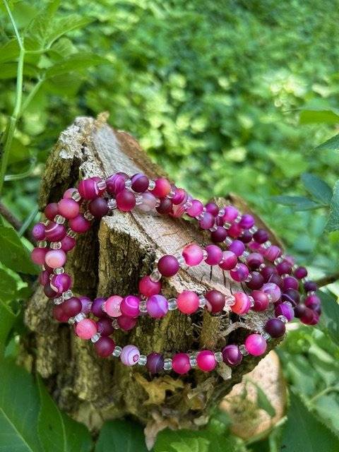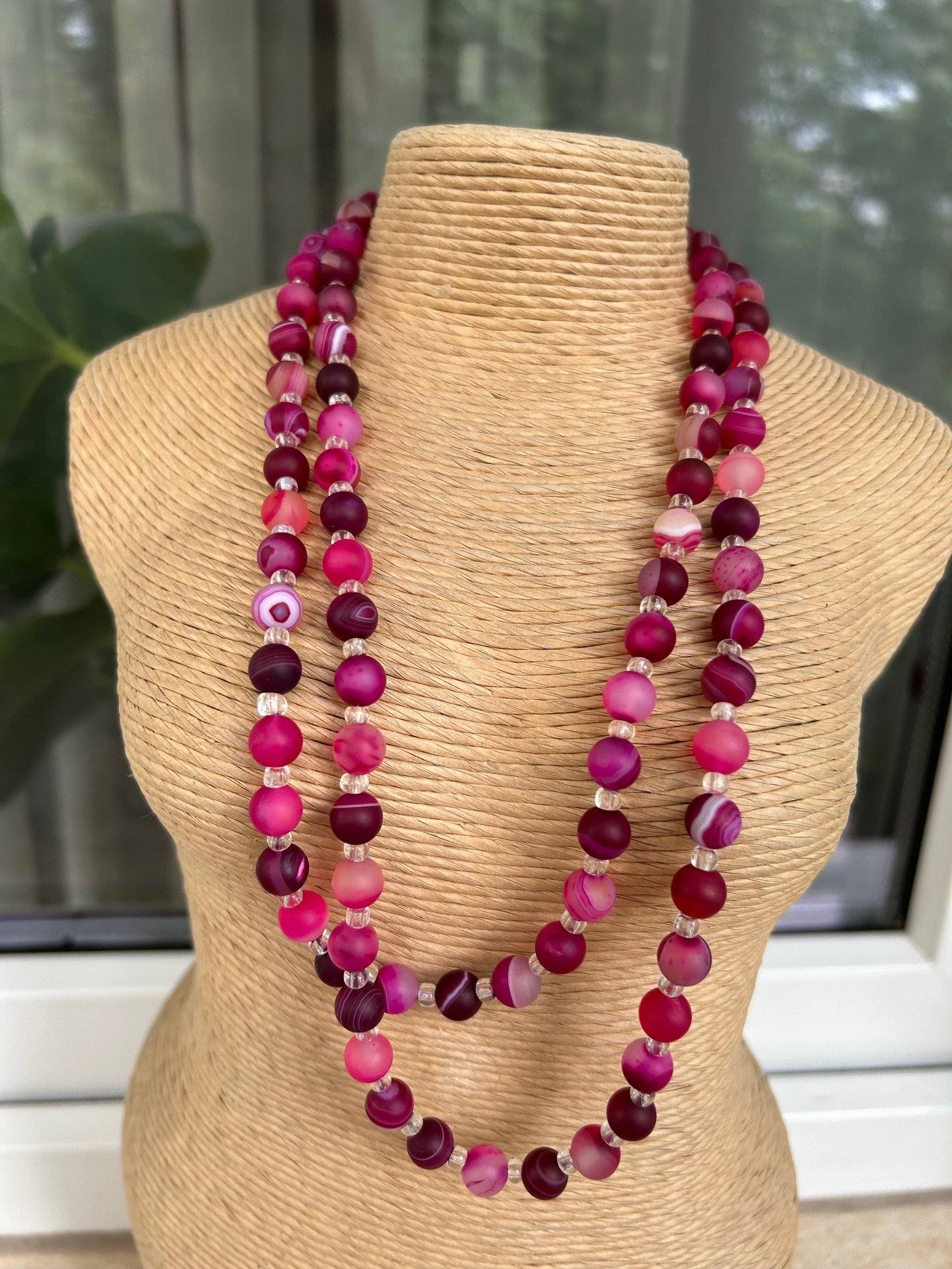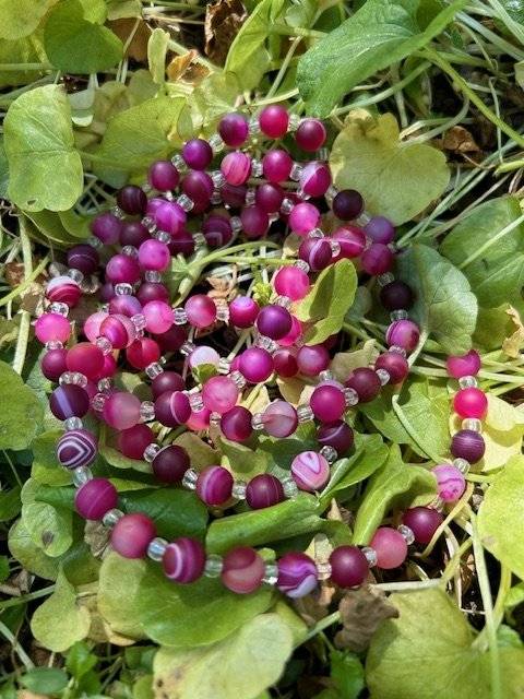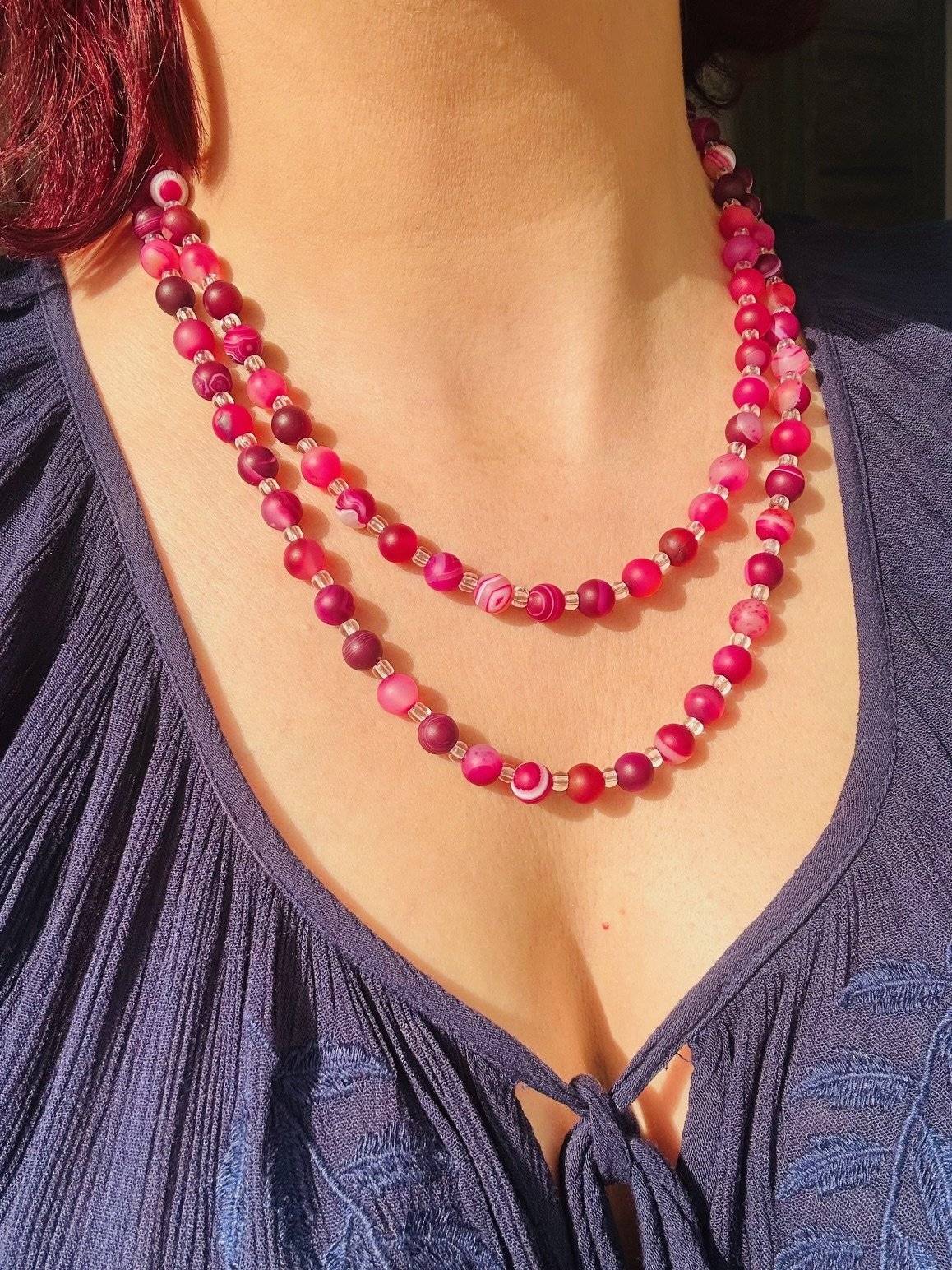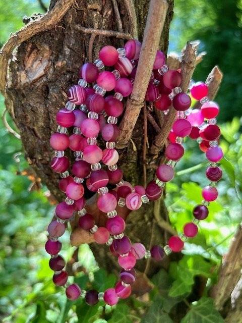 - agate dantelate fuchsia frosted, sfere semiprețioase cu dimensiunea de 8 mm;
