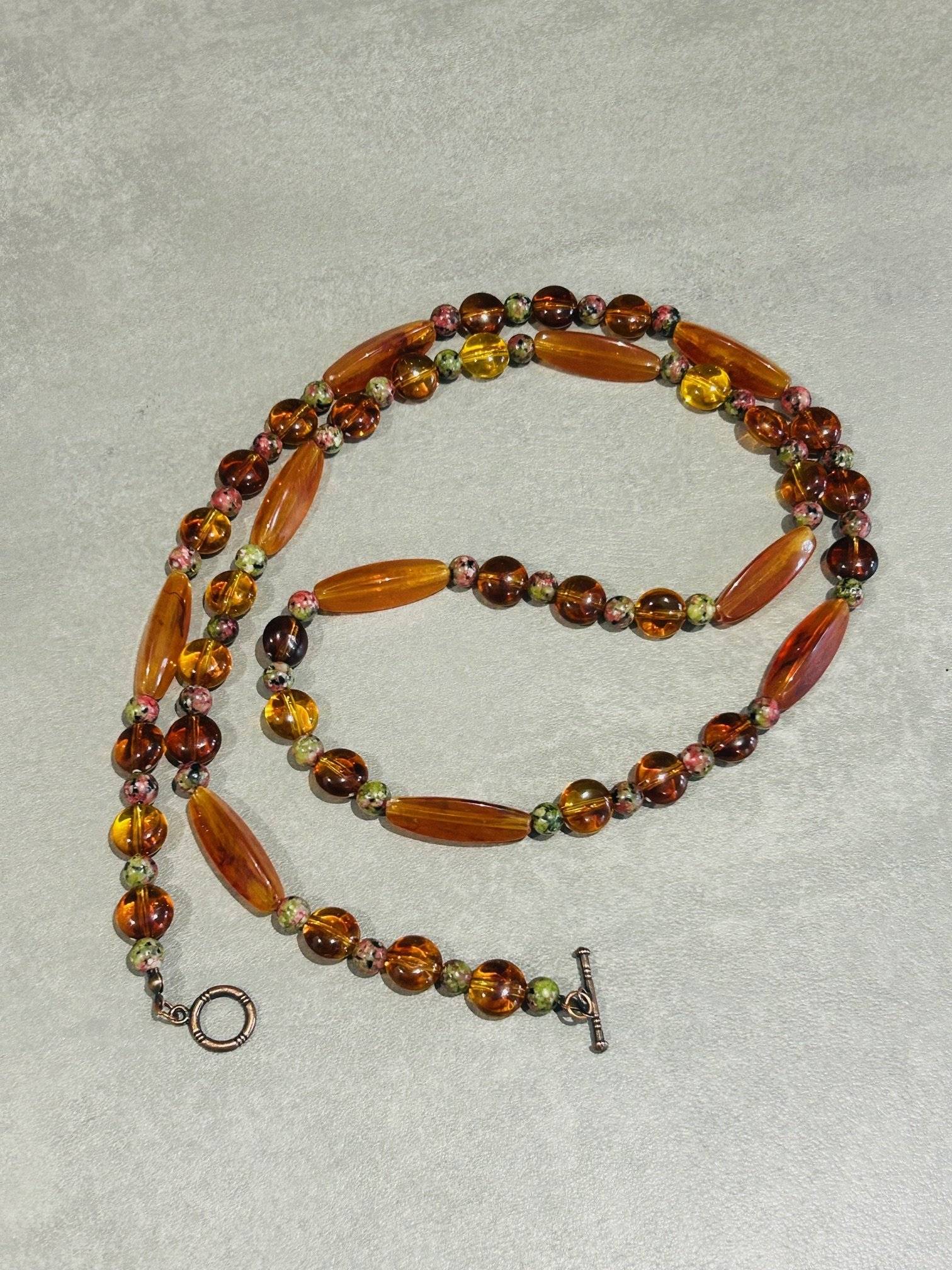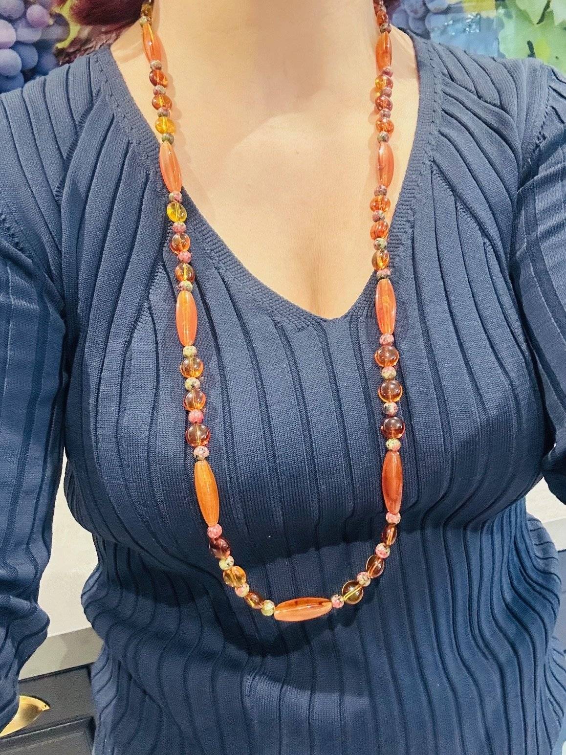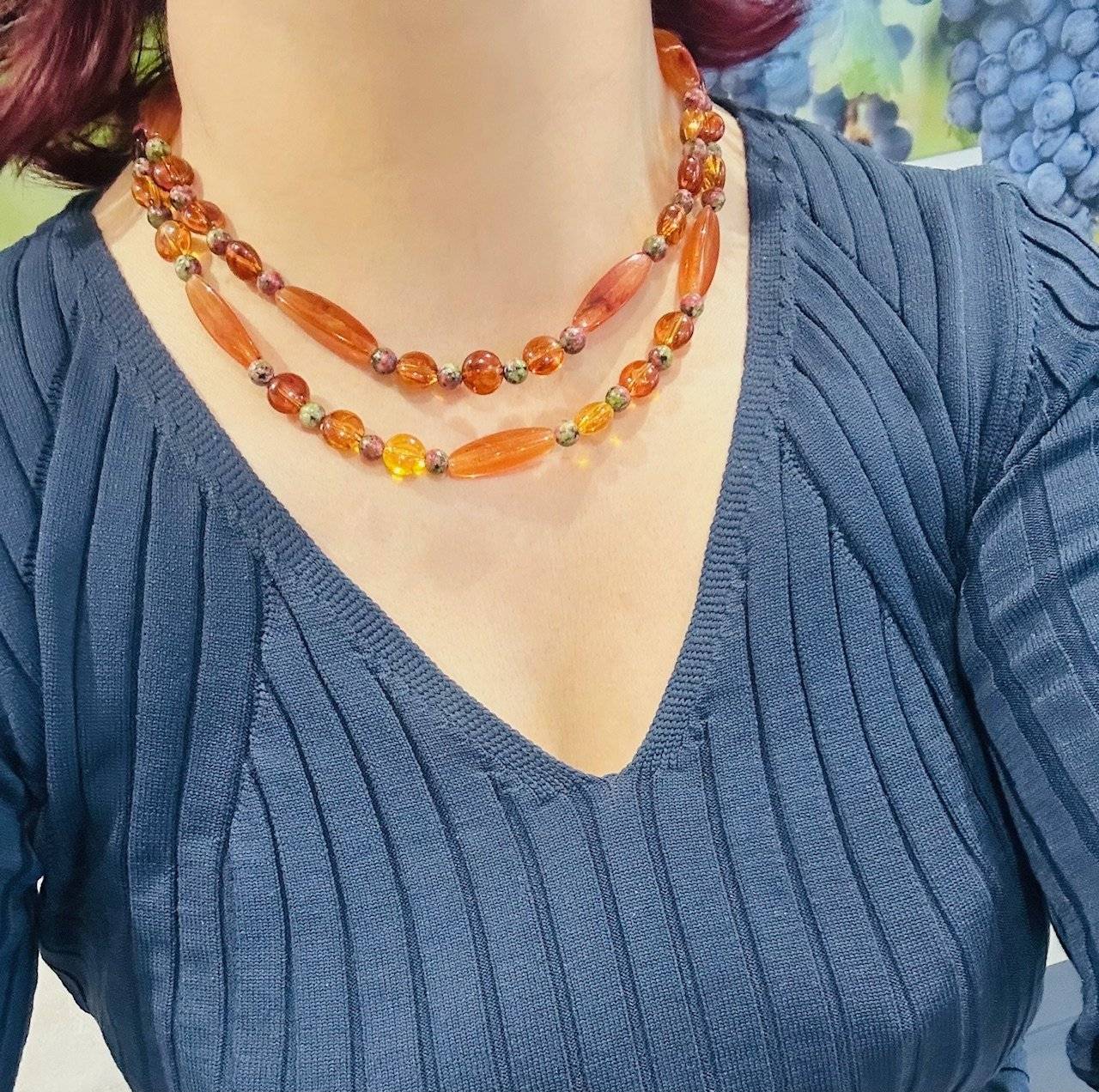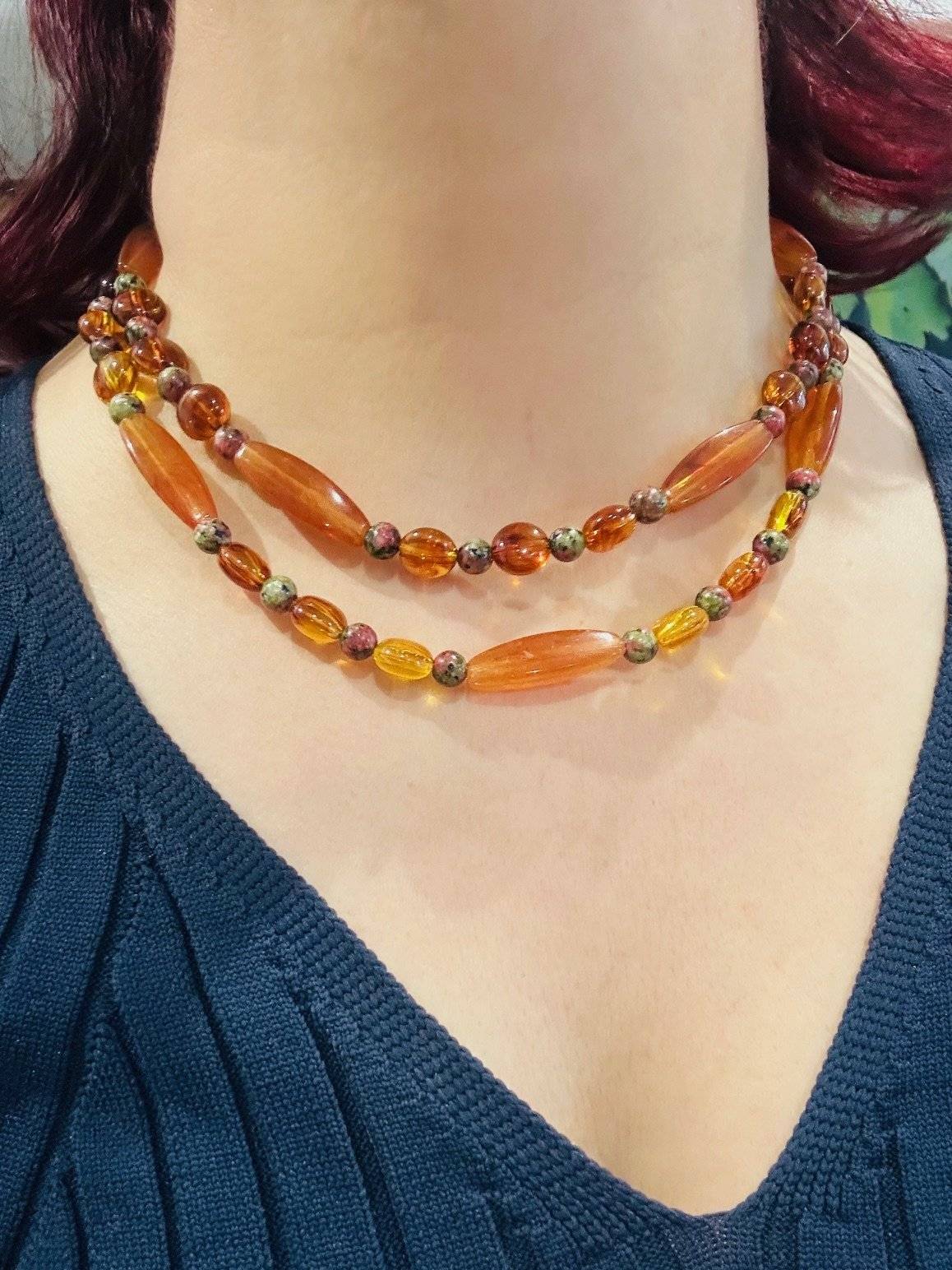 Colierul „DAFINA” este alcătuit din mărgele de unakit cu dimensiunea de 6 mm și mărgele acrilice cu aspect de chihlimbar cu diverse forme și nuanțe specifice chihlimbarului.
