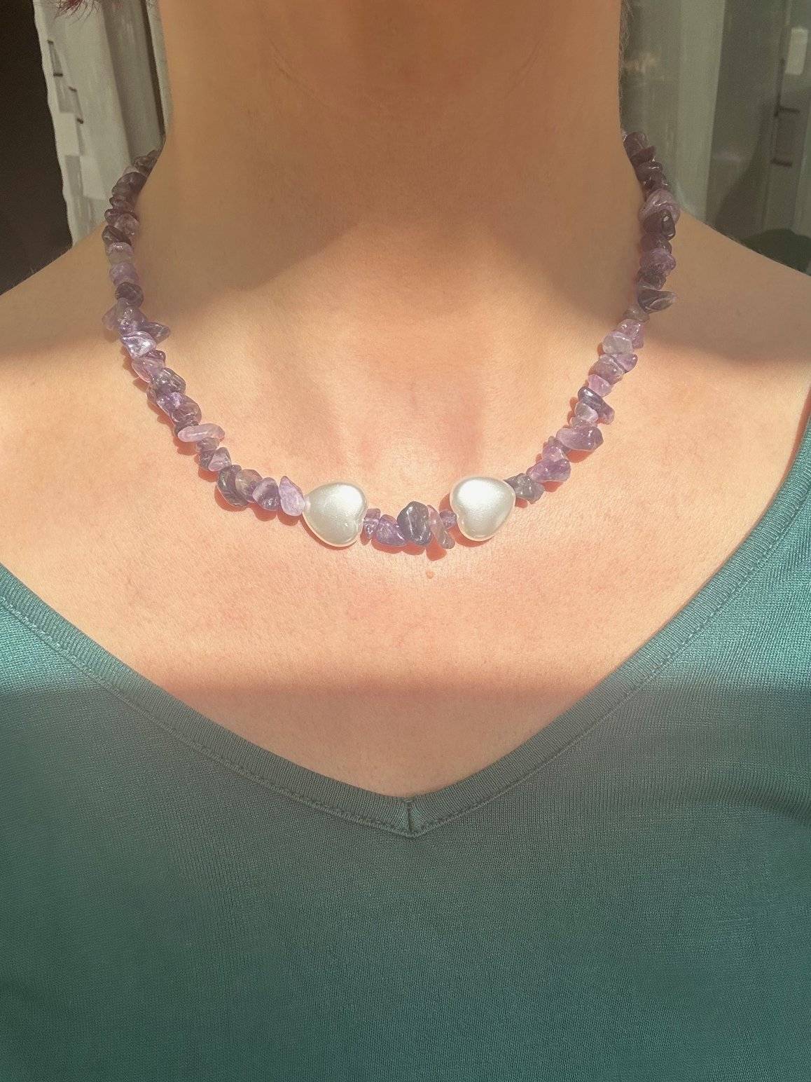 Lungimea colierului este de cca. 45 cm. Chipsurile sunt înșirate pe sârmă siliconată de 0,40 mm și închiderea se face prin închizătoare lobster din aliaj placată cu argint
