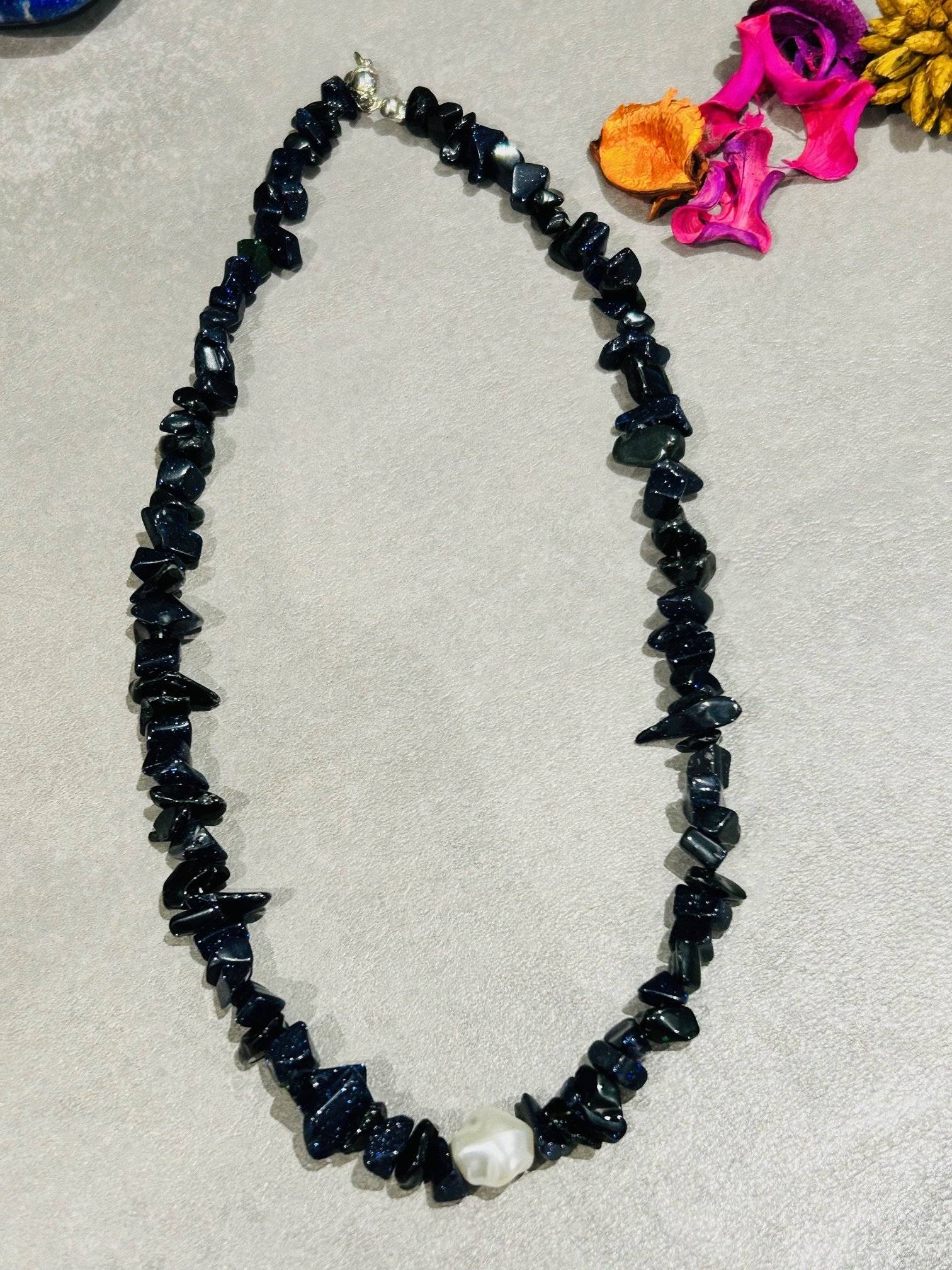 Colier format din chipsuri de piatra soarelui albastră, având central o perluță albă.