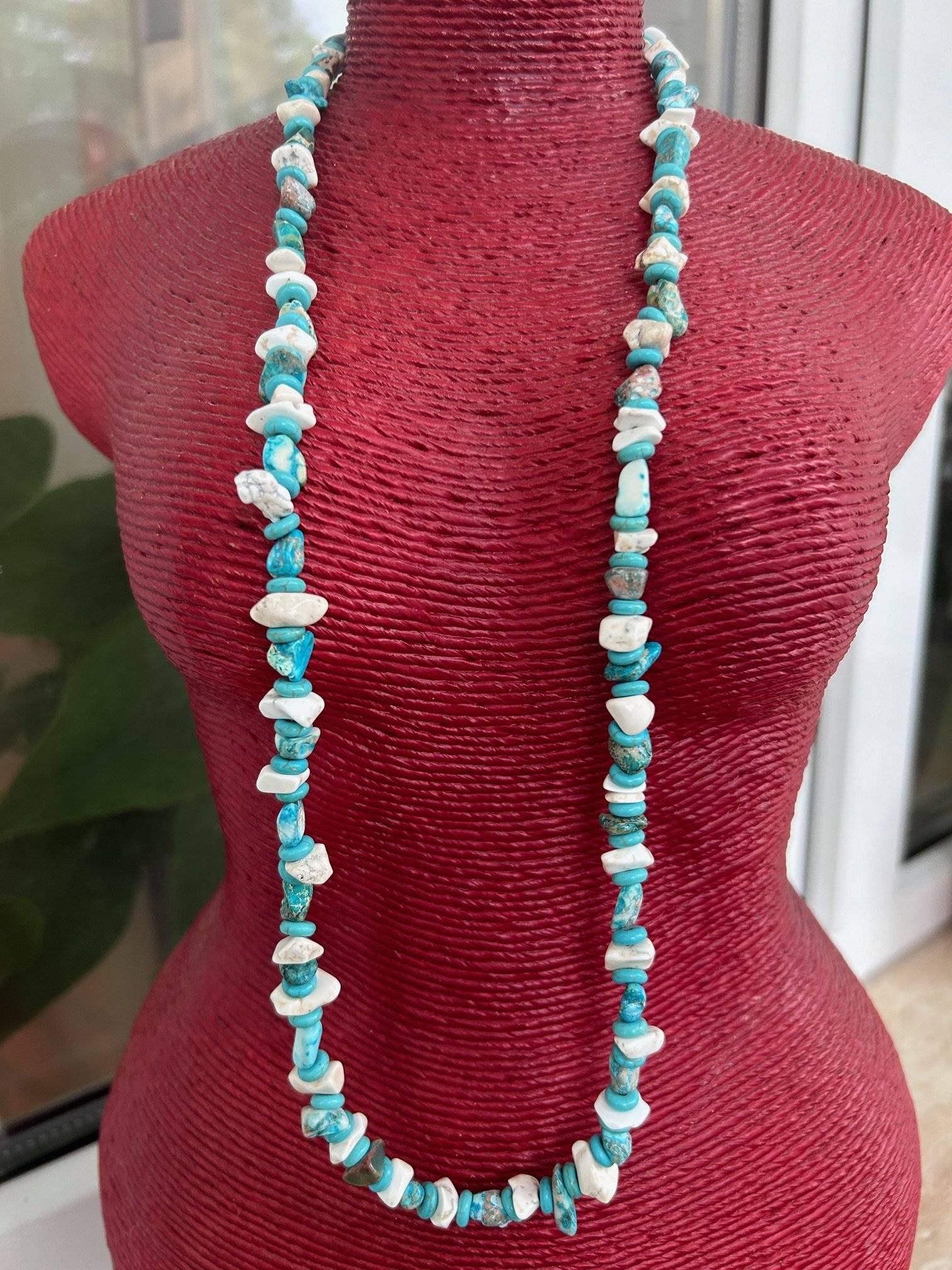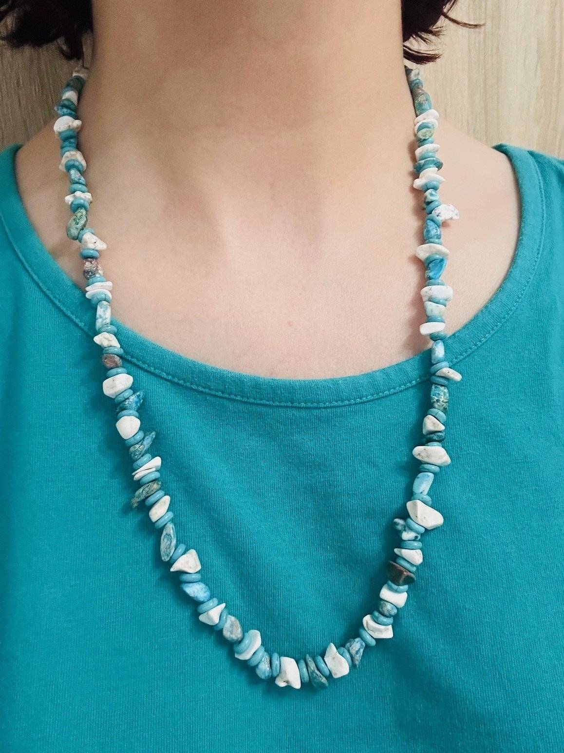 Lungimea colierului este de cca. 64 cm. Chipsurile sunt înșirate pe sârmă siliconată de 0,45 mm și închiderea se face cu închizătoare lobster din aliaj placat cu argint.