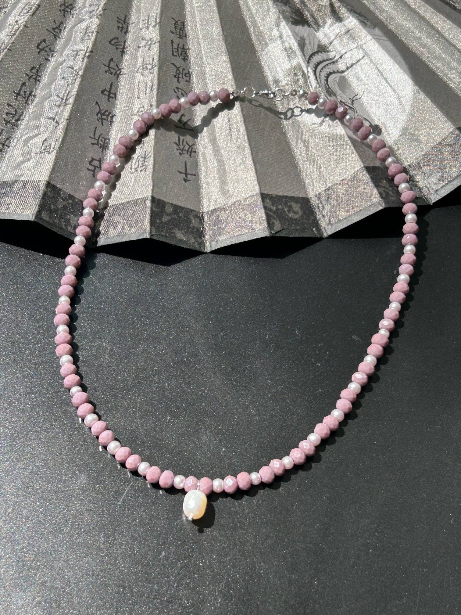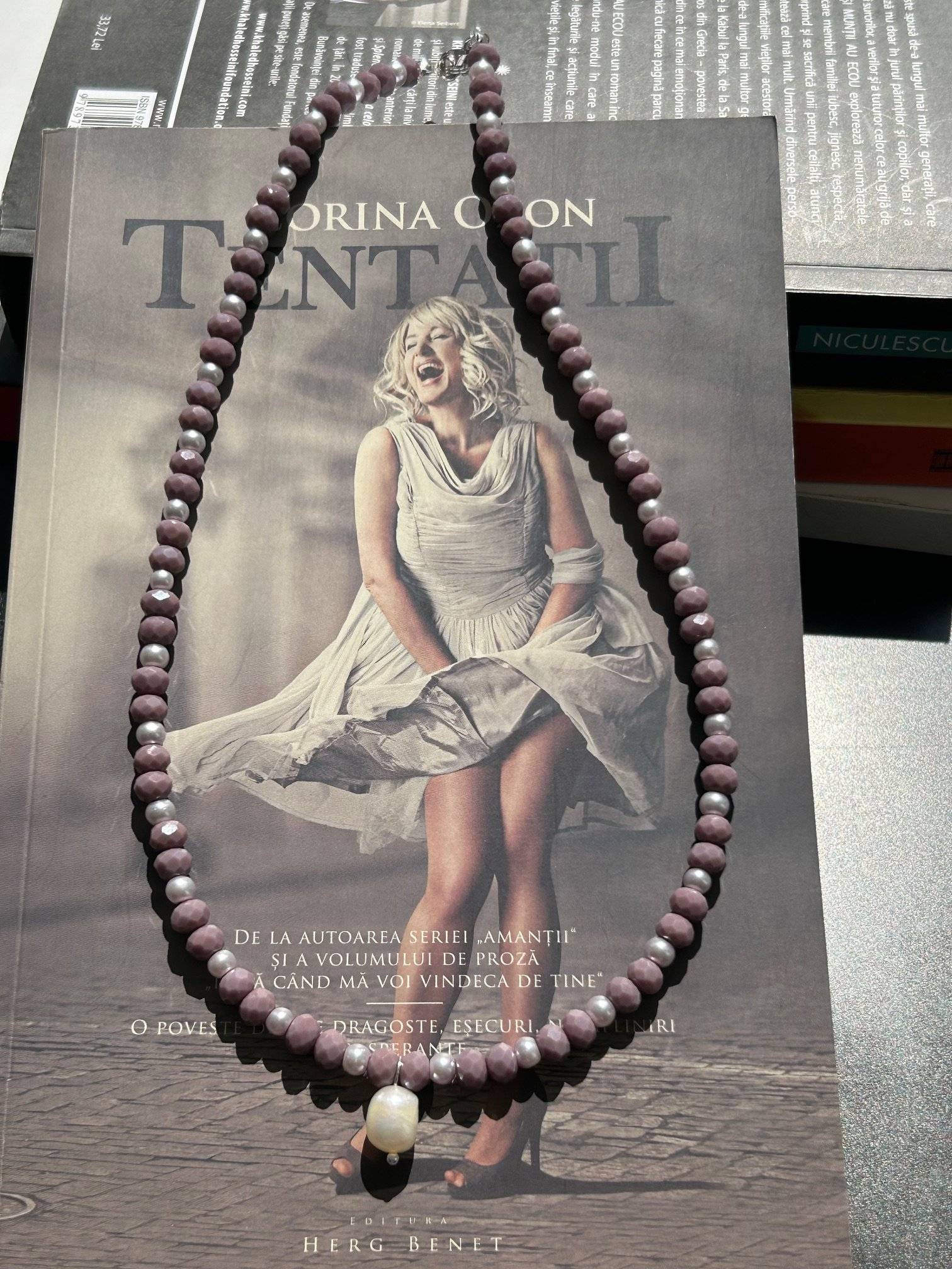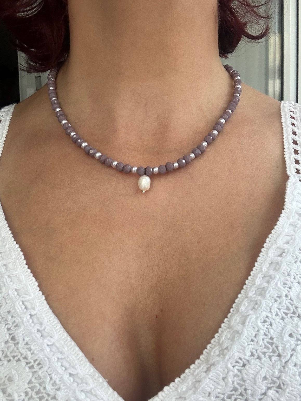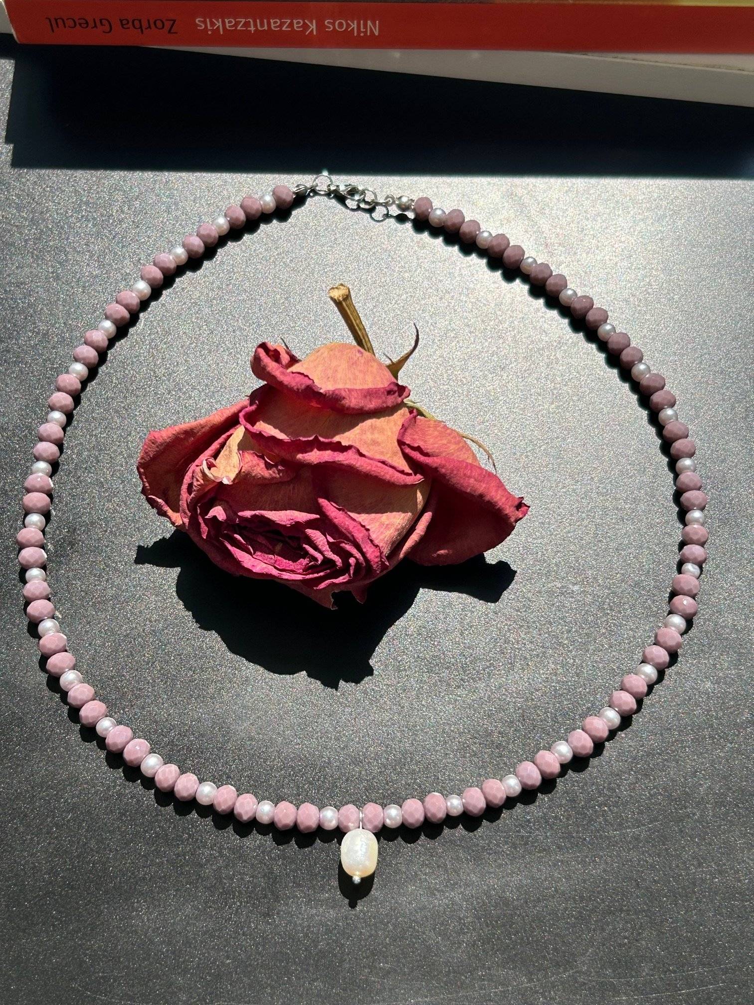 Colierul este confecționat din cristale rondele, culoare mov mat, cu dimensiunea de 6x4 mm și perle de sticlă, culoare lila, dimensiune 4 mm. Central, un pandantiv minuscul dintr-o perluță albă neregulată, 6-7 mm.