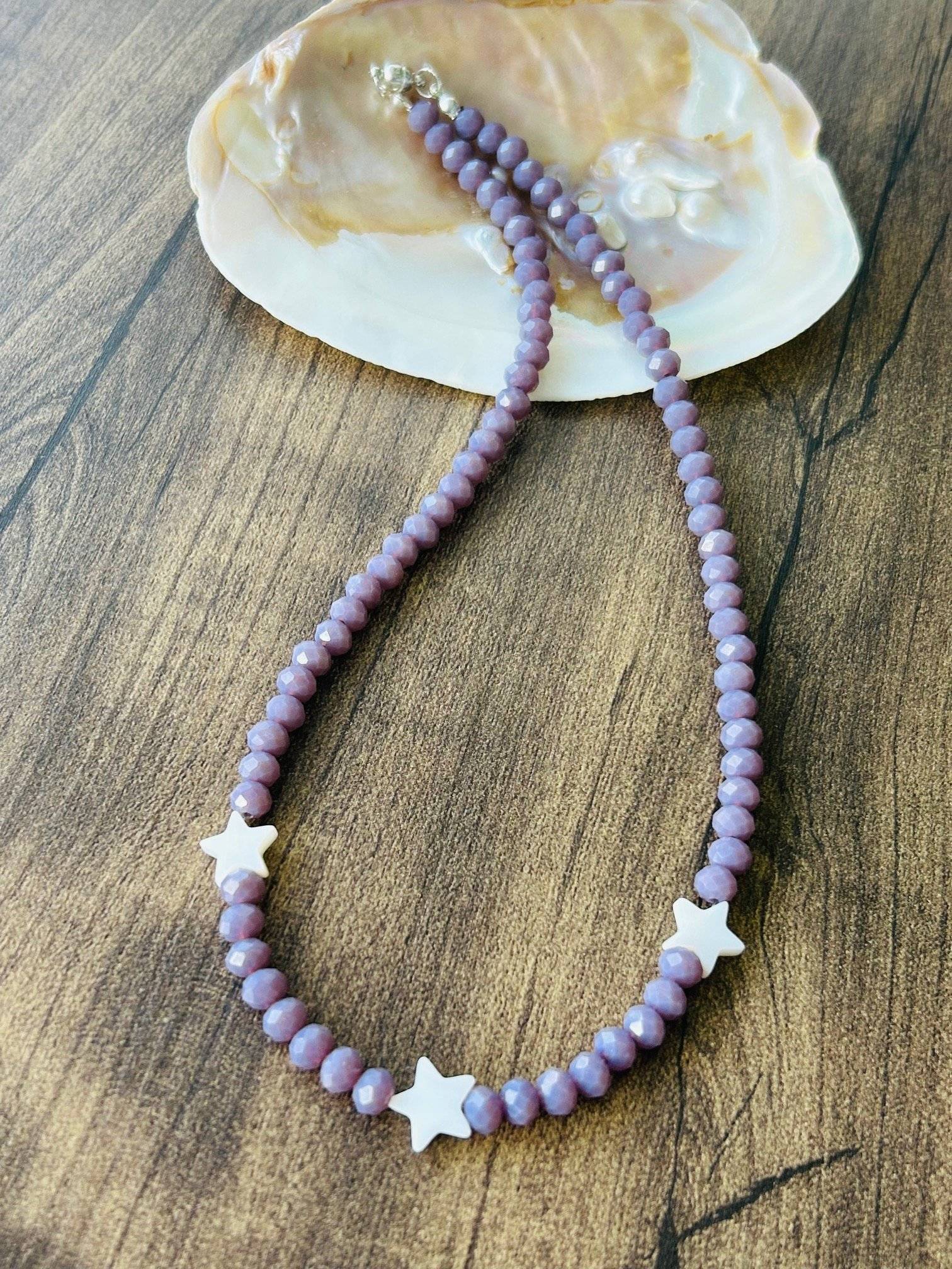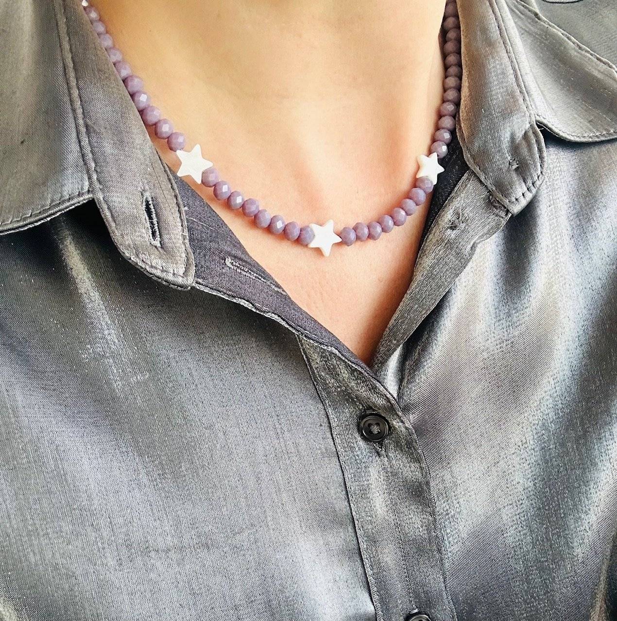 Colierul este confecționat din cristale rondele, culoare mov lila, cu dimensiunea de 6x4 mm și steluțe sidef, dimensiune 5x5 mm.