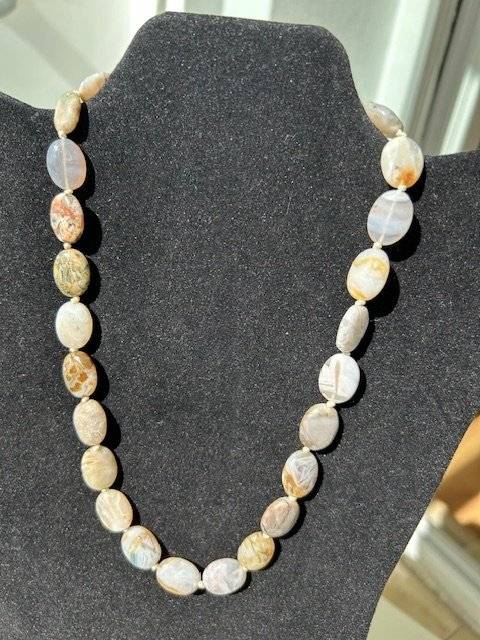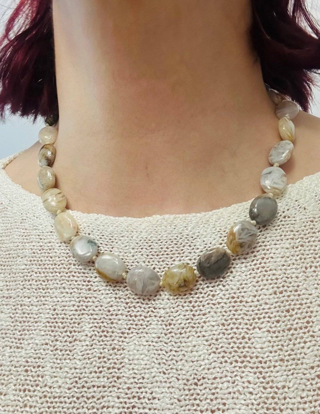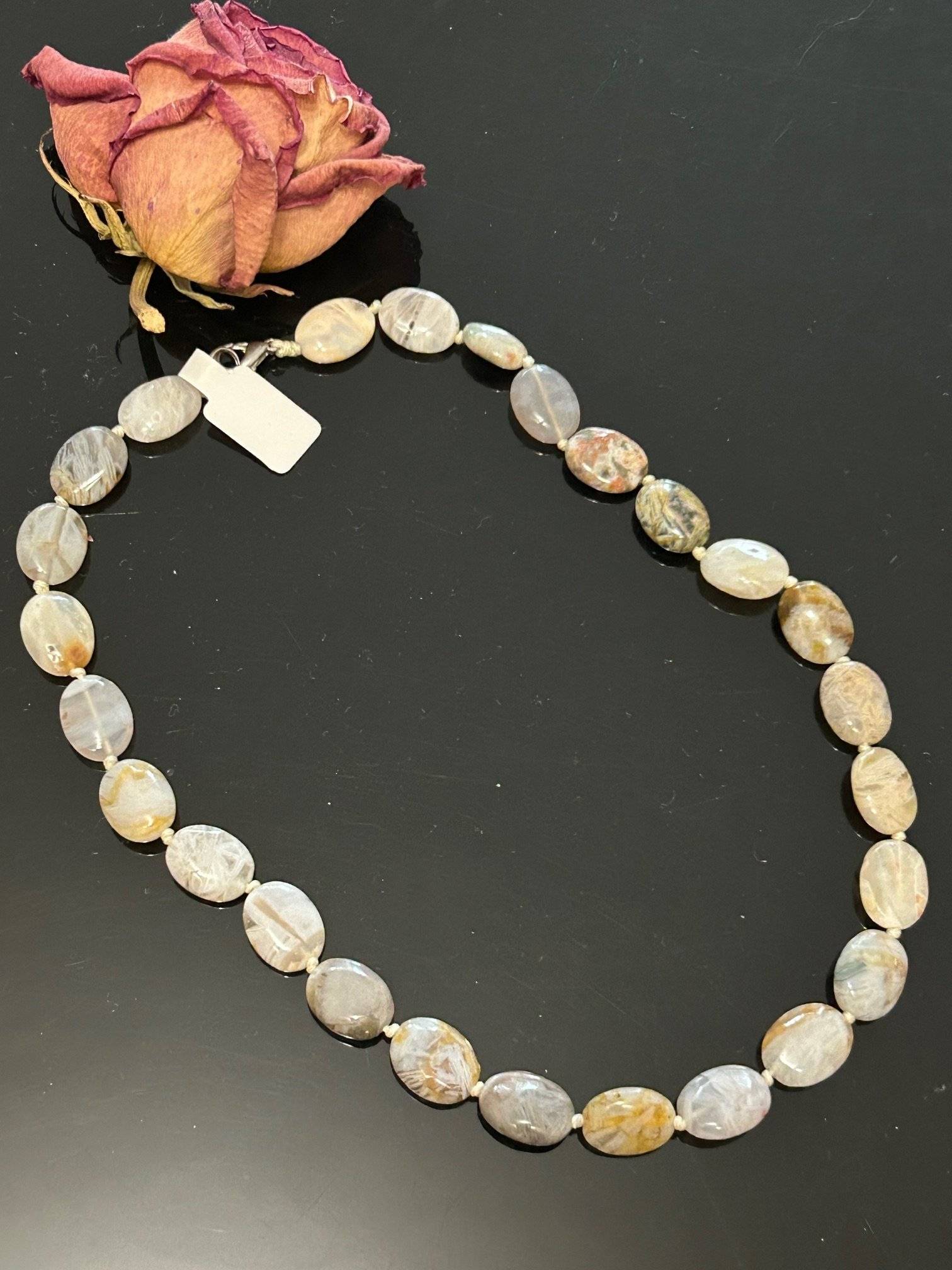 Colier din piatră rulată, ovală de CUARȚ FUMURIU, montat pe fir textil multistrat cu noduri între pietre.