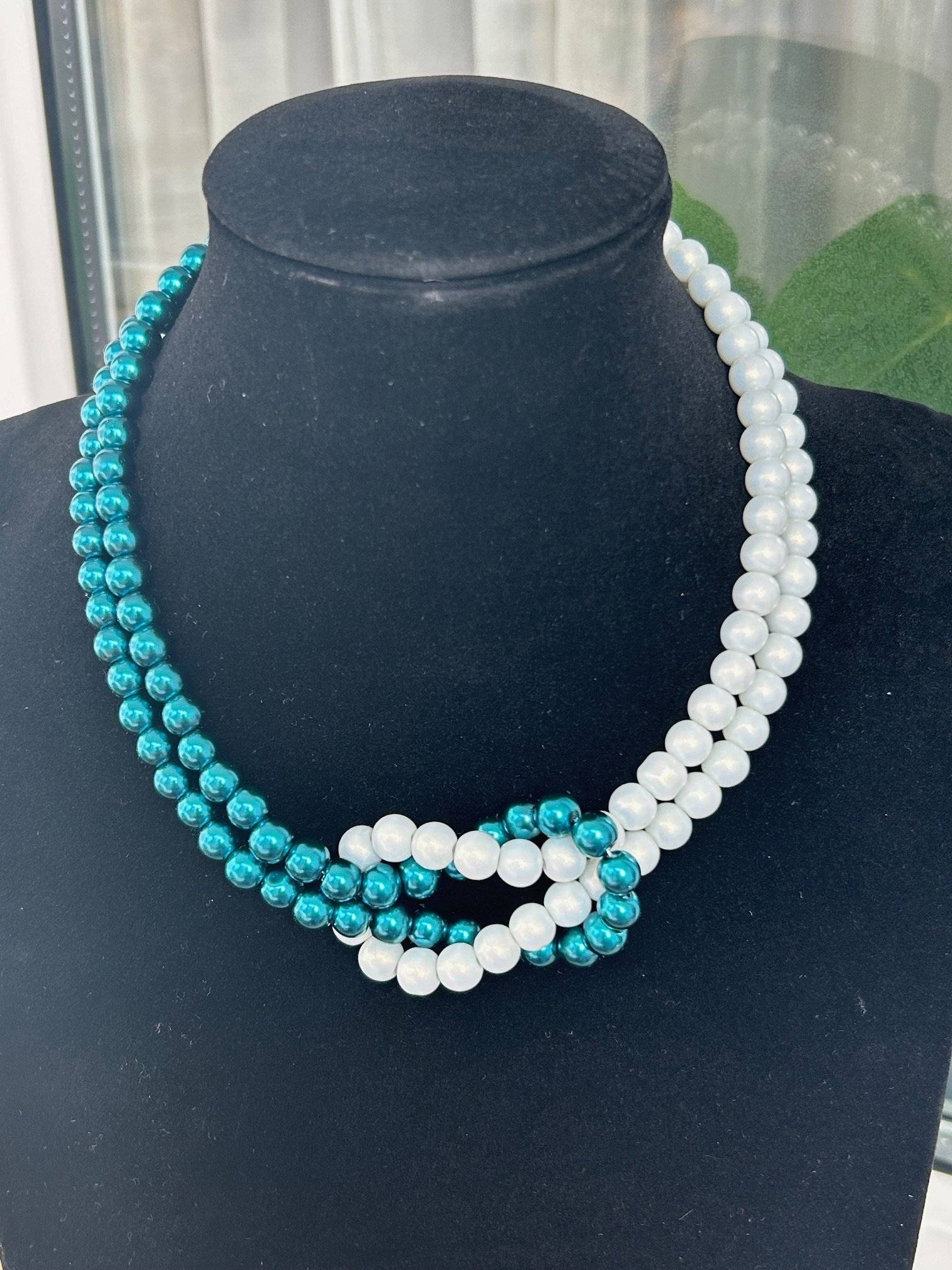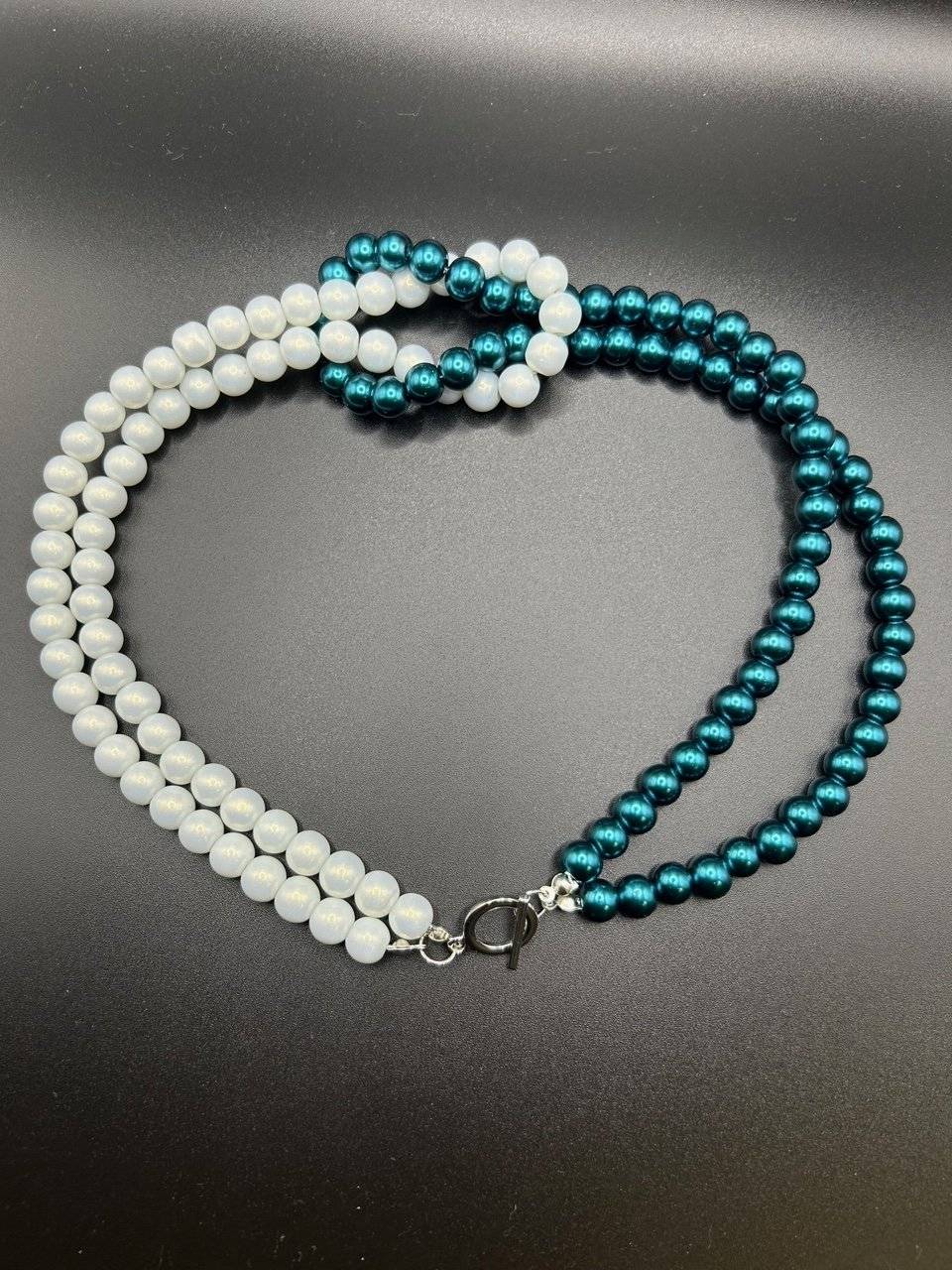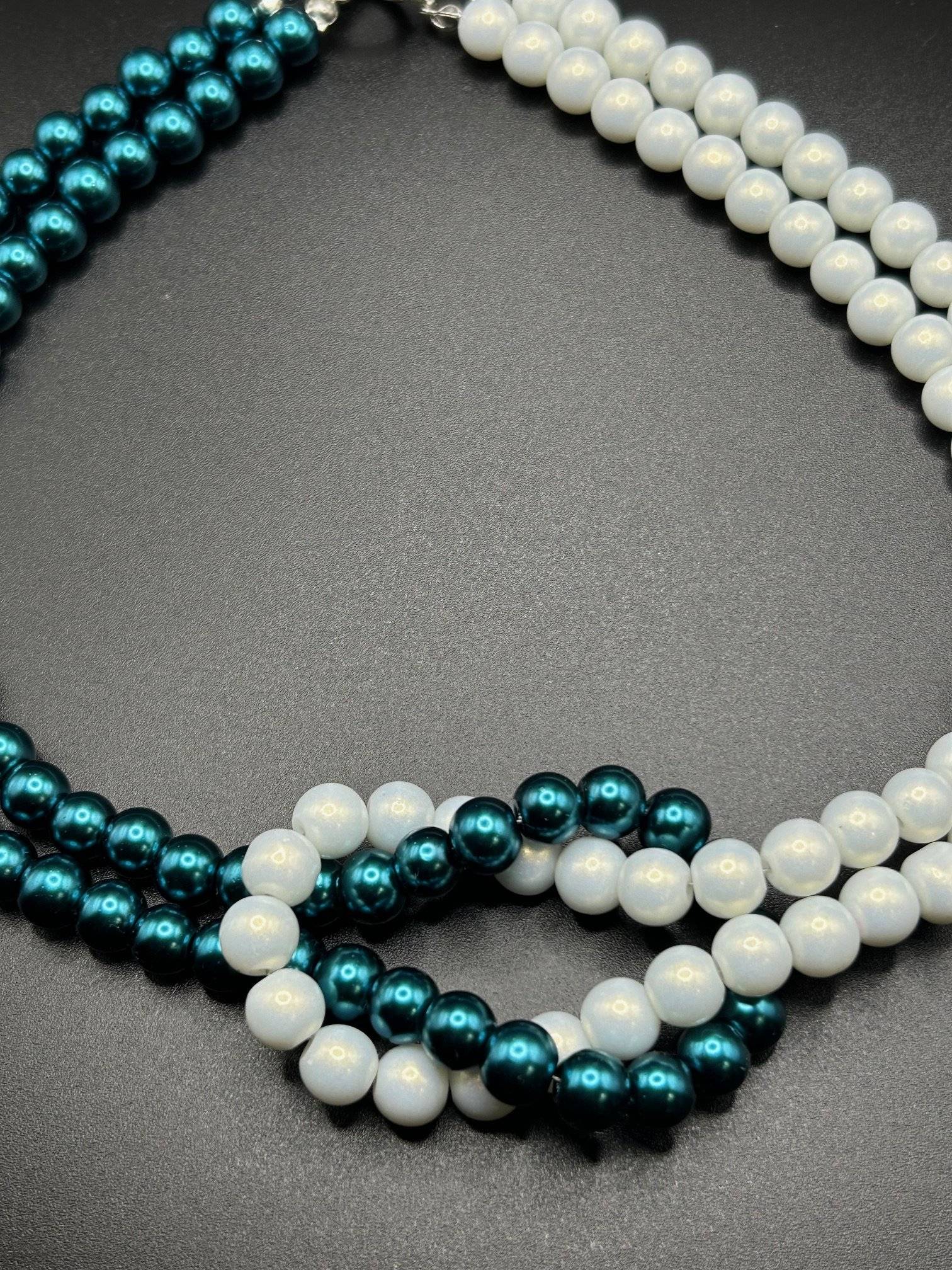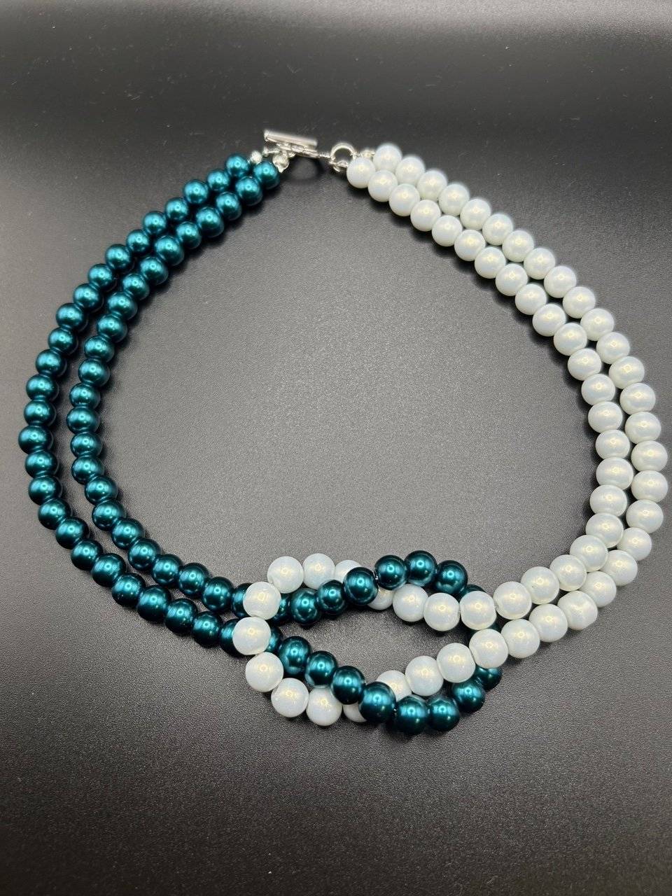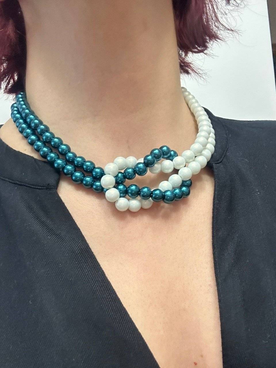 Colierul masiv și strălucitor, din 2 șiraguri de perle petrecute unul peste celălalt, creind un nod deosebit de aspectuos la baza gâtului, potrivit pentru a accesoriza cu succes o ținută de seară plină de eleganță și rafinament. Este confecționat din:
