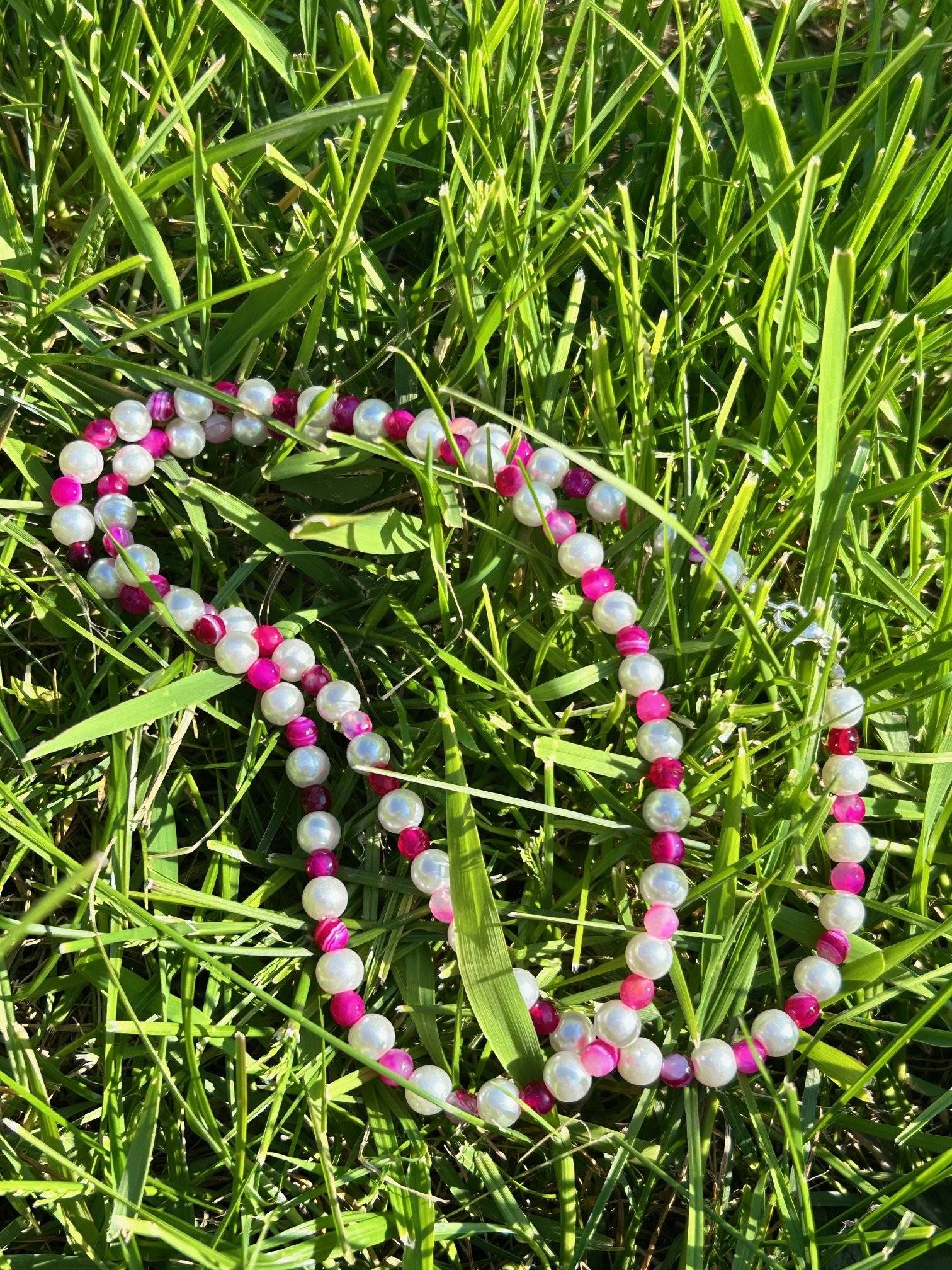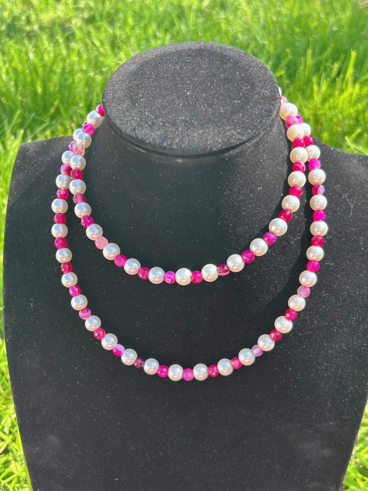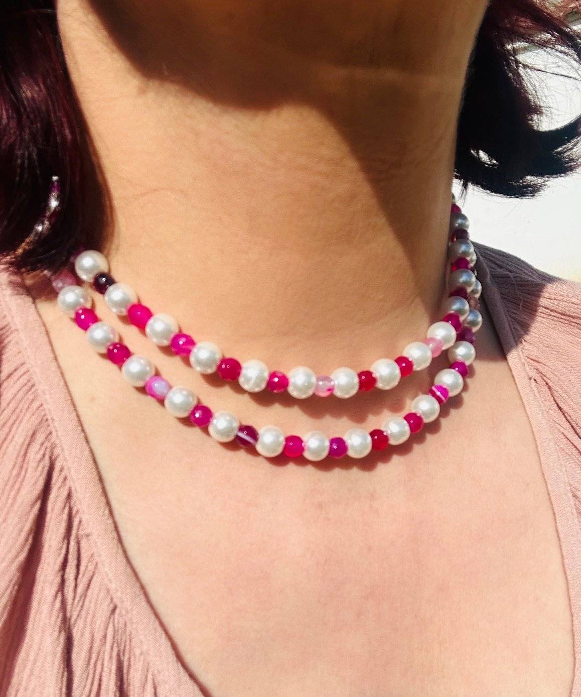 - agate dantelate fuchsia, sfere fațetate cu dimensiunea de 6 mmLungimea colierului este de cca. 78 cm.