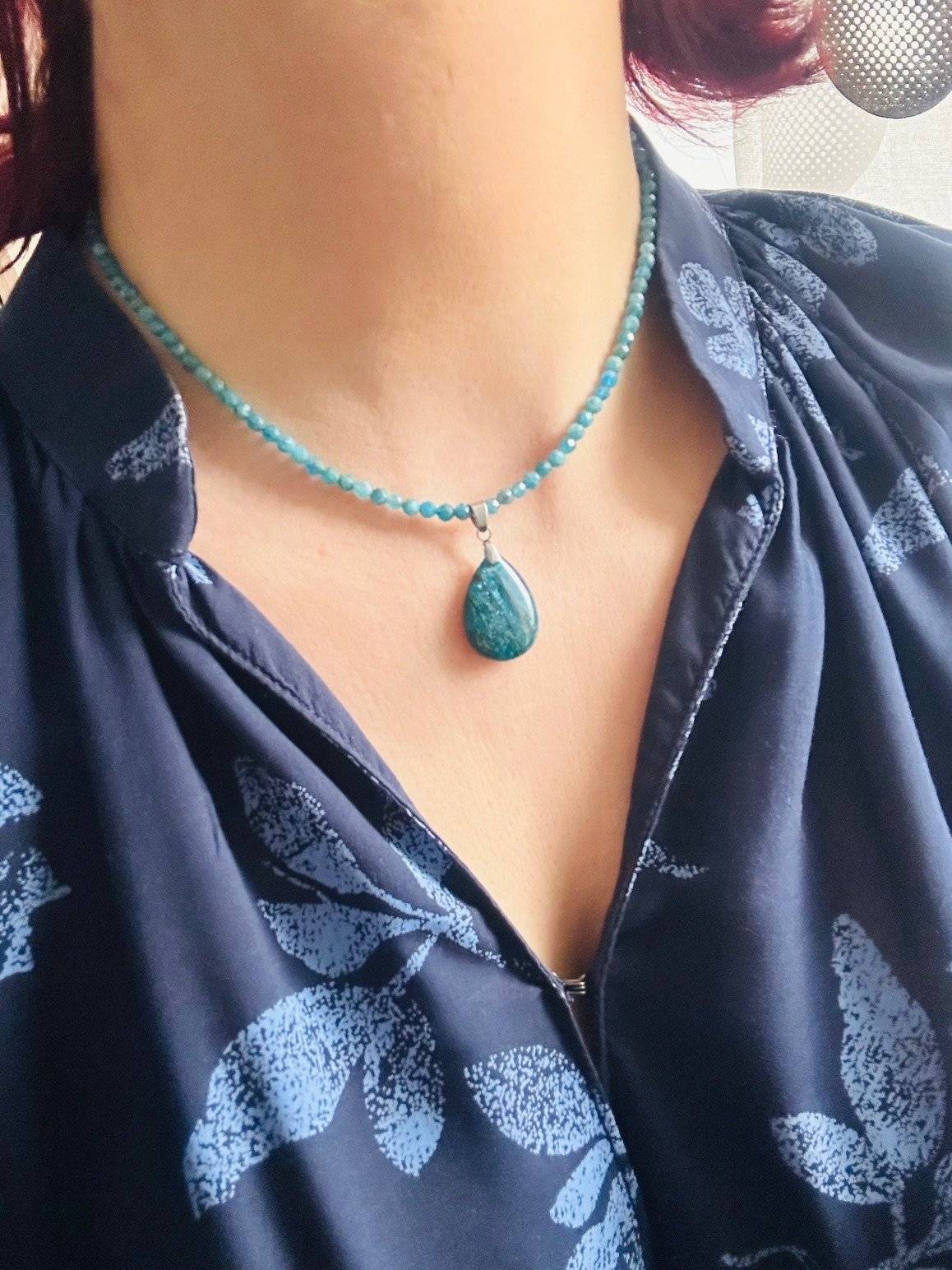 Prin prisma proprietăților sale, Apatitul deschide chakra gâtului, acest lucru ajutând la afirmarea corectă a mesajelor pe care dorești să le transmiți. Cristalul de Apatit este o piatră a manifestării care este legată de viețile anterioare și, în același timp, face o punte de legătură cu viitorul. Susține activitatea socială și îndeamnă la o comunicare mai eficienta cu cei din jur. Este o piatră care susține aflarea adevărului profund, indepărtând supărarea și apatia, eliminând chiar și mânia.