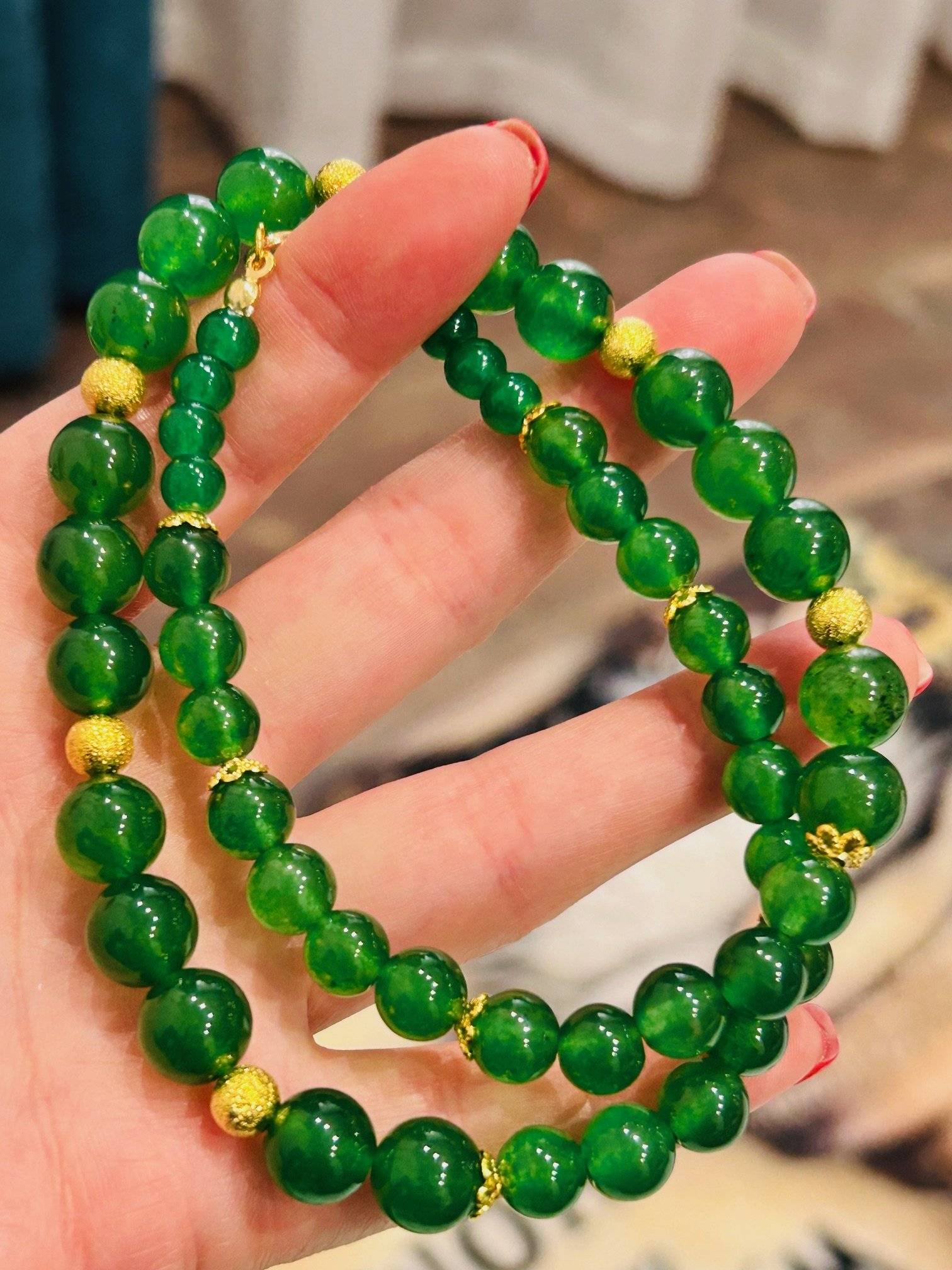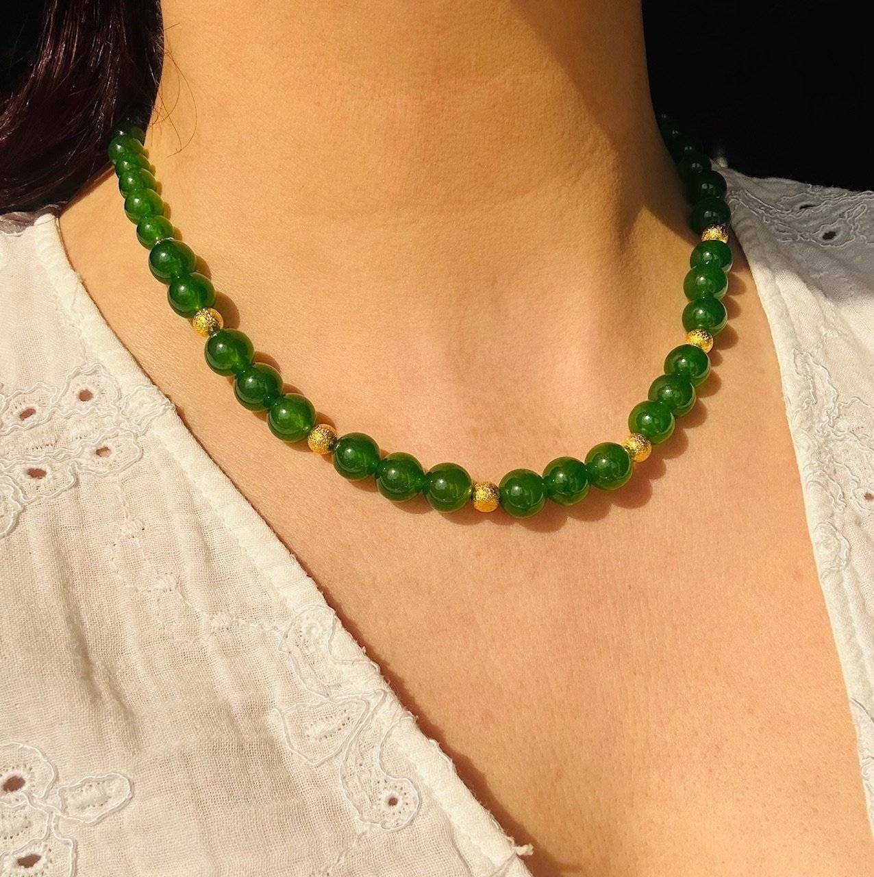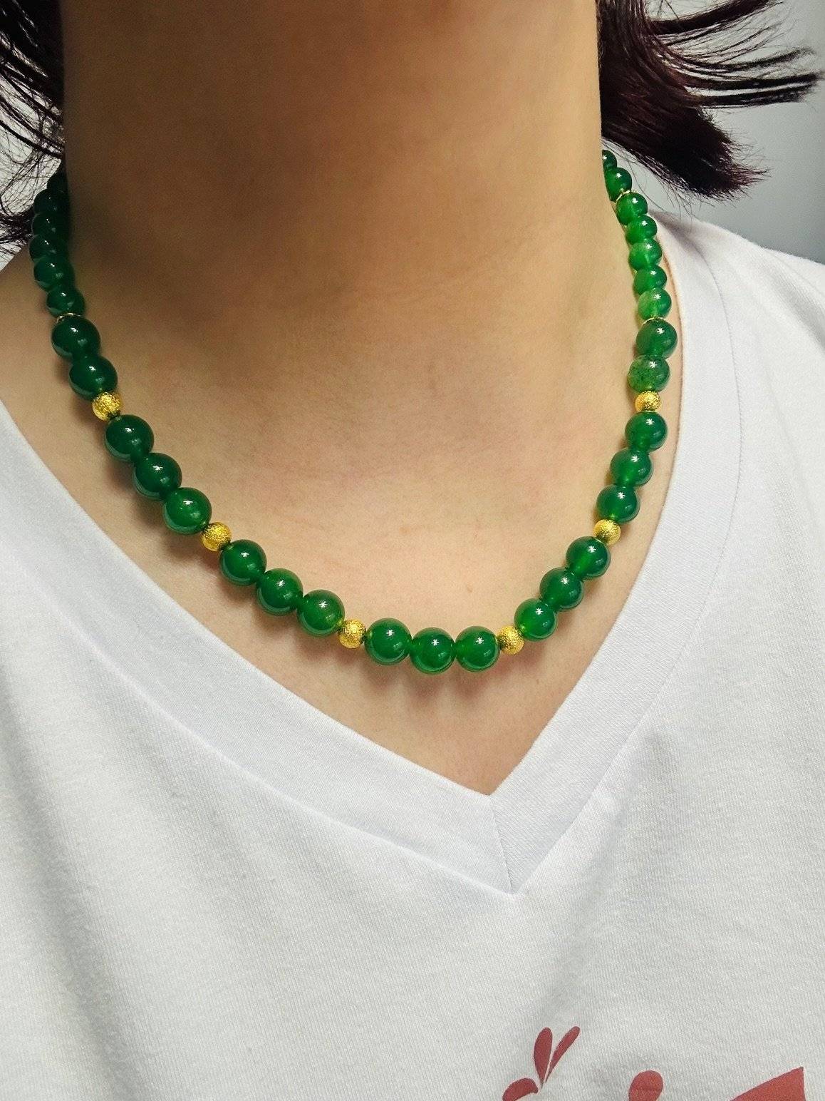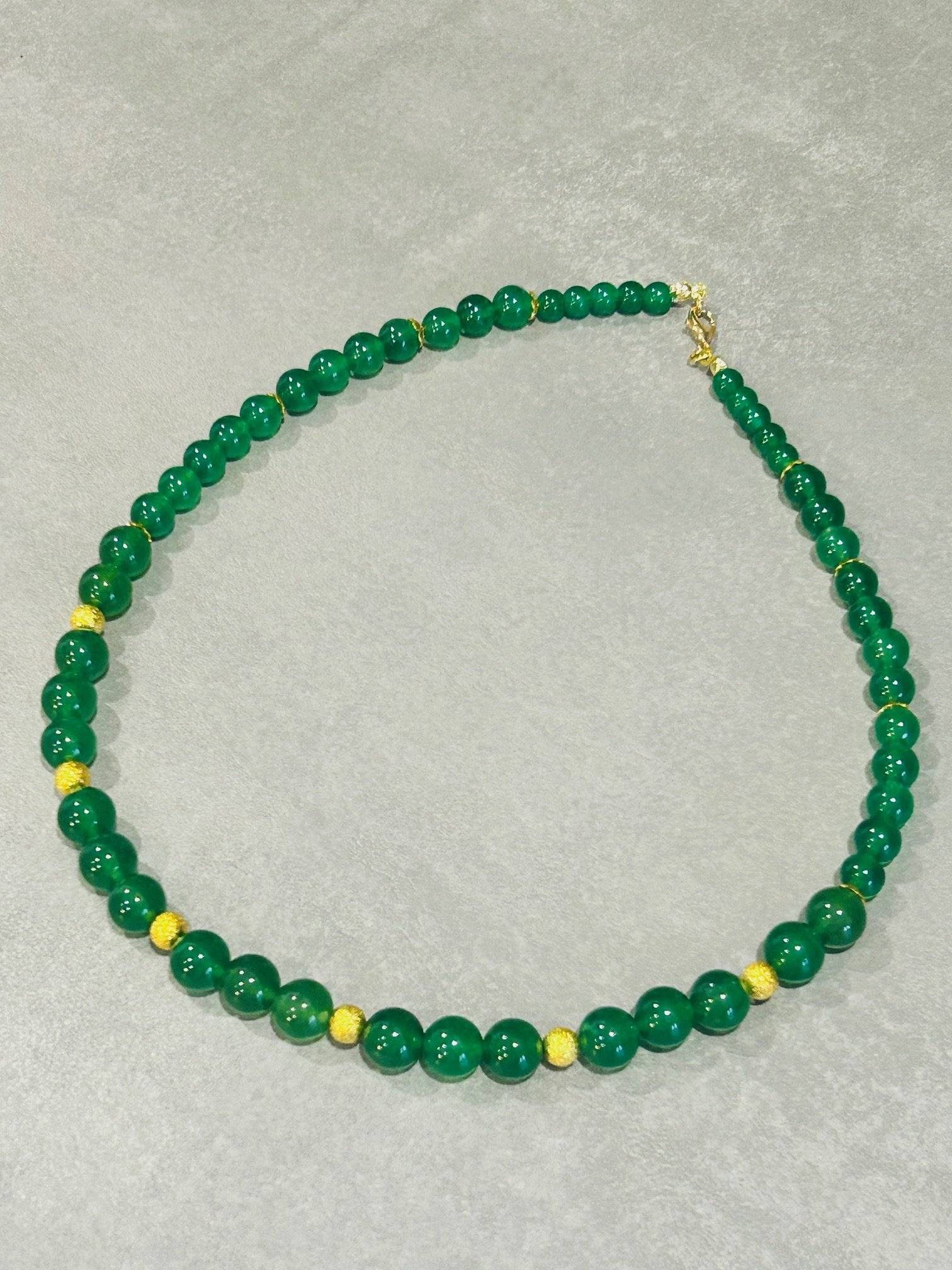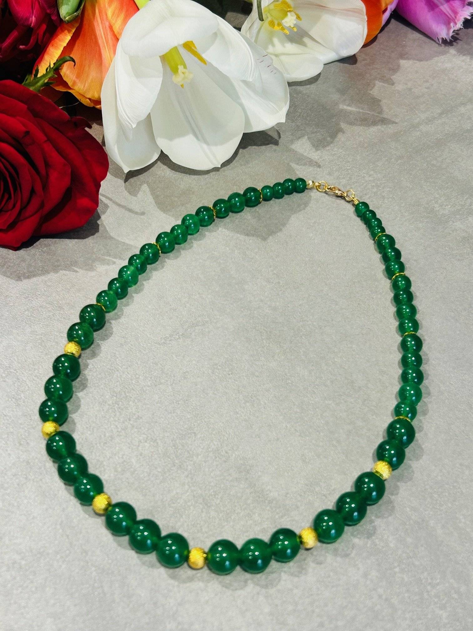 Mărgelele sunt montate pe fir oțel siliconat de 0,45 mm grosime, iar închiderea se face cu închizătoare lobster din alamă placată cu aur. Pietrele semiprețioase pot prezenta mici diferențe de nuanță de la o piatră la alta, iar culoarea poate varia puțin în funcție de setările monitorului Dvs.