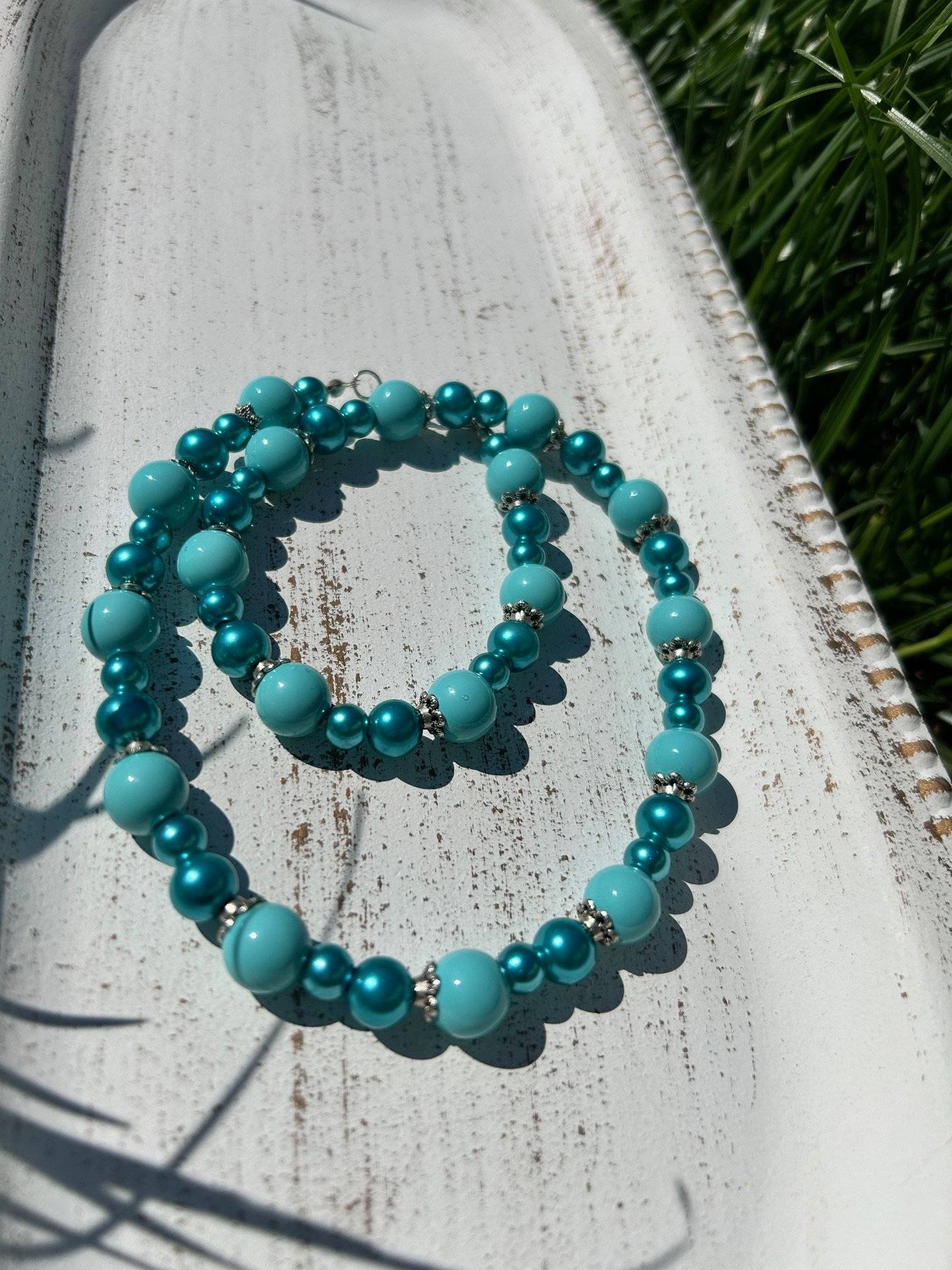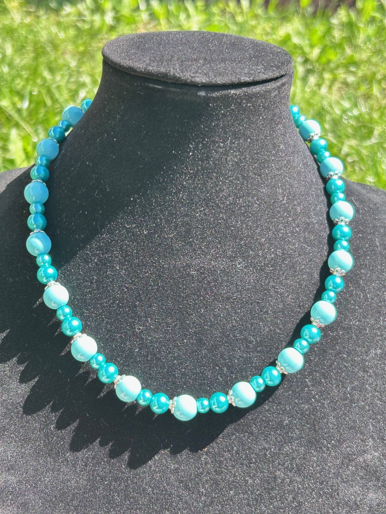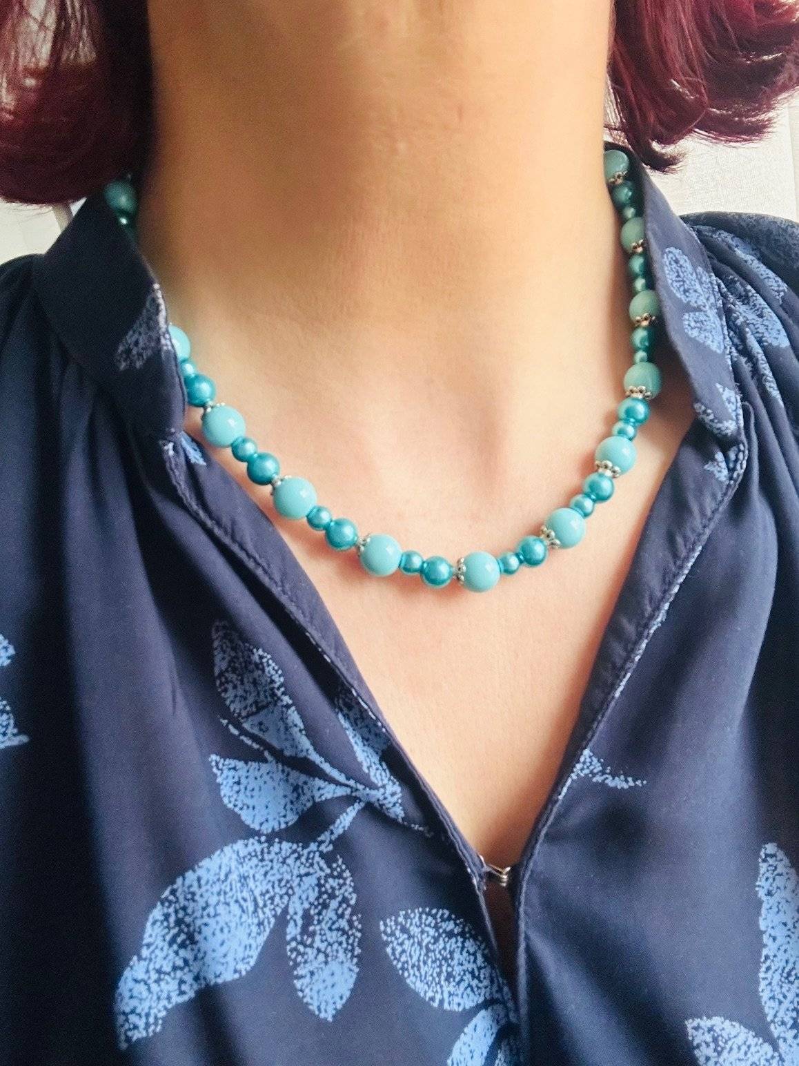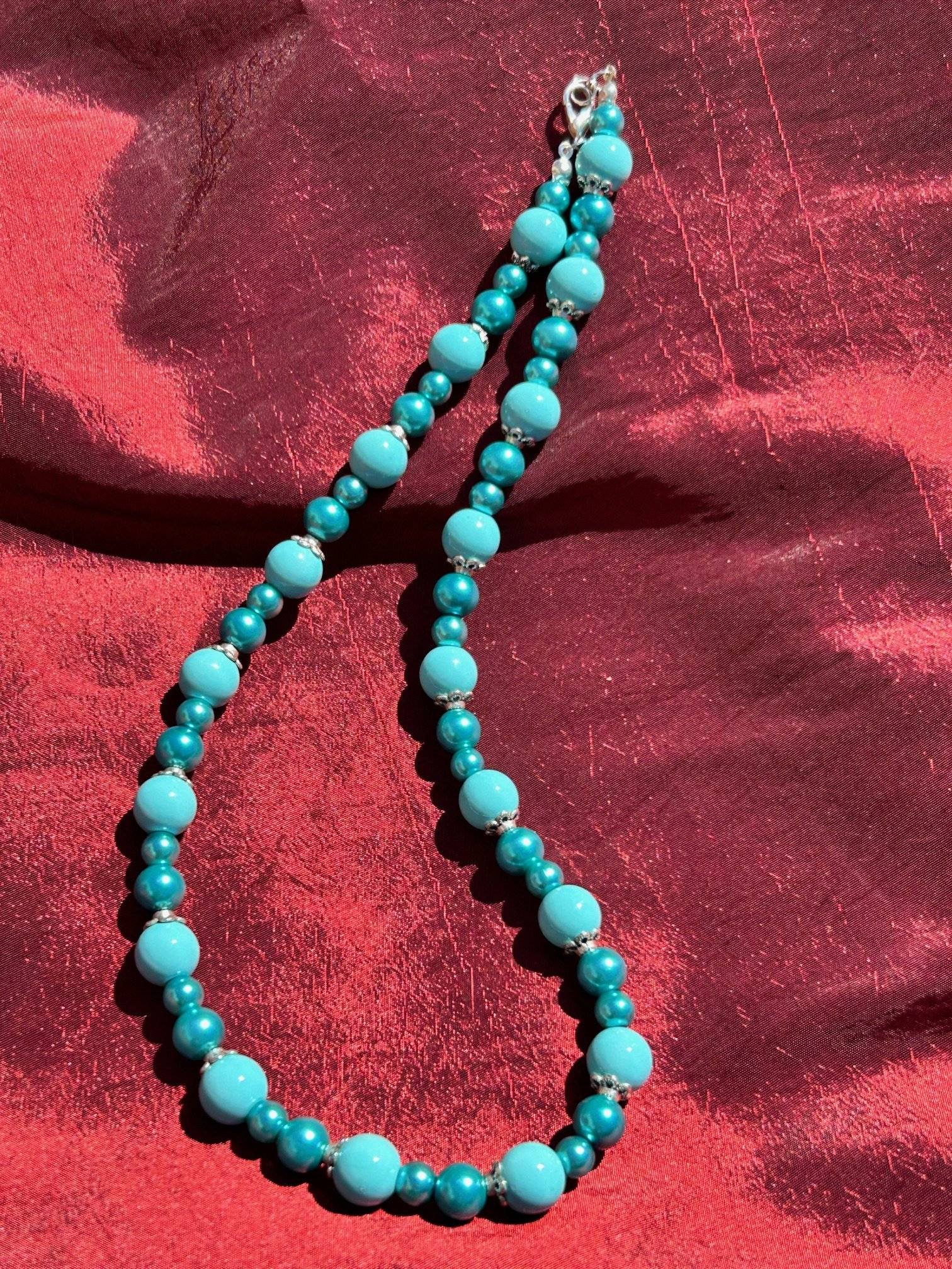 - perlă PRECIOSA, cal.I, culoare turcoaz, sfere cu dimensiunea de 6 și 8 mmLungimea colierului este de 47 cm. Perlele sunt montate pe fir oțel siliconat de 0,45 mm grosime, special pentru bijuterii iar închiderea se face cu închizătoare lobster, din aliaj placată cu argint.