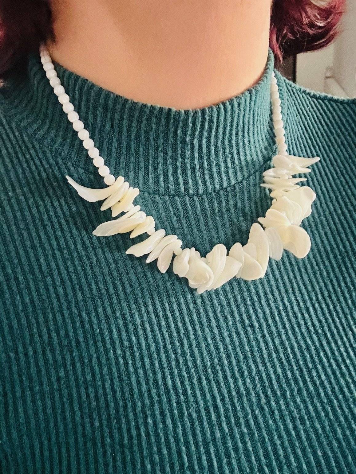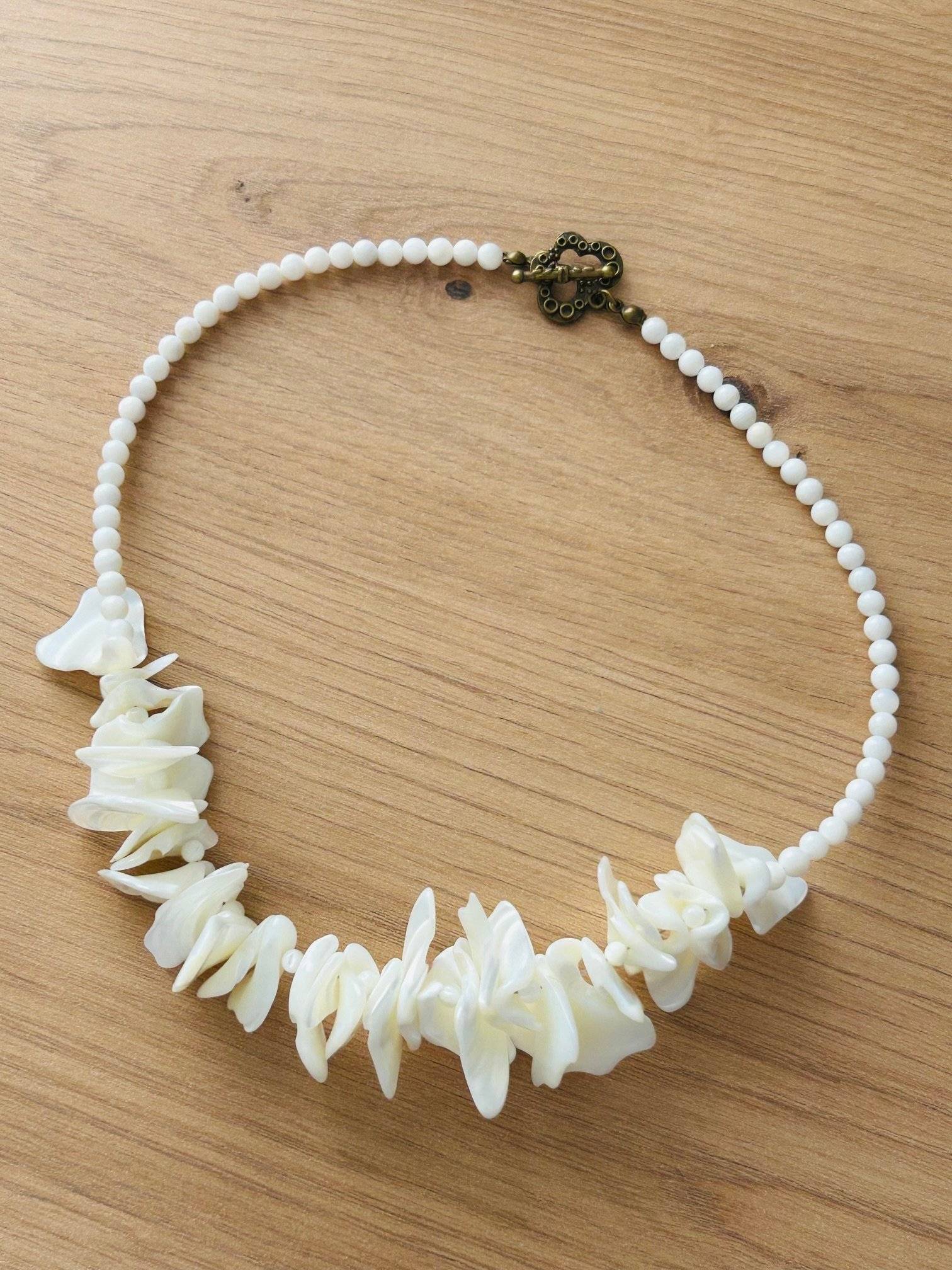 Colierul TONKA este confecționat din sidef natural alb - pietre neregulate cu dimensiunea de 18/25 mm și sfere de 5 mm.