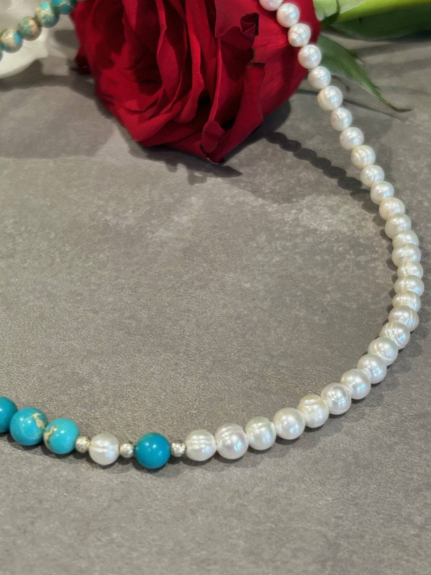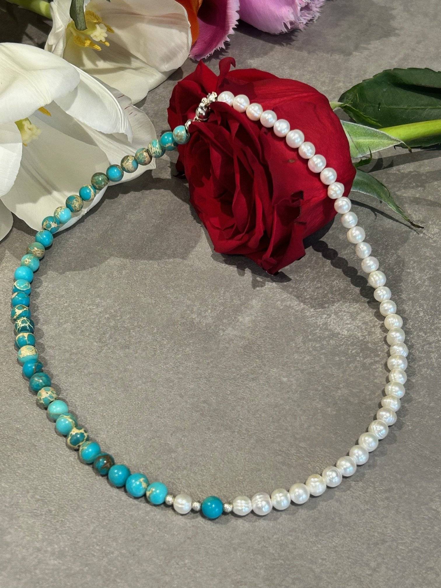 Pietrele semiprețioase și perlele de cultură sunt montate pe fir oțel siliconat, special pentru bijuterii, de 0,45 mm grosime, iar închiderea se face cu închizătoare magnetică din aliaj placat cu argint. Pietrele semiprețioase pot prezenta mici diferențe de nuanță de la o piatră la alta, acest aspect nefiind nicidecum un defect, ci o dovadă de autenticitate a cristalelor. Culoarea poate varia puțin în funcție de setările monitorului Dvs.
