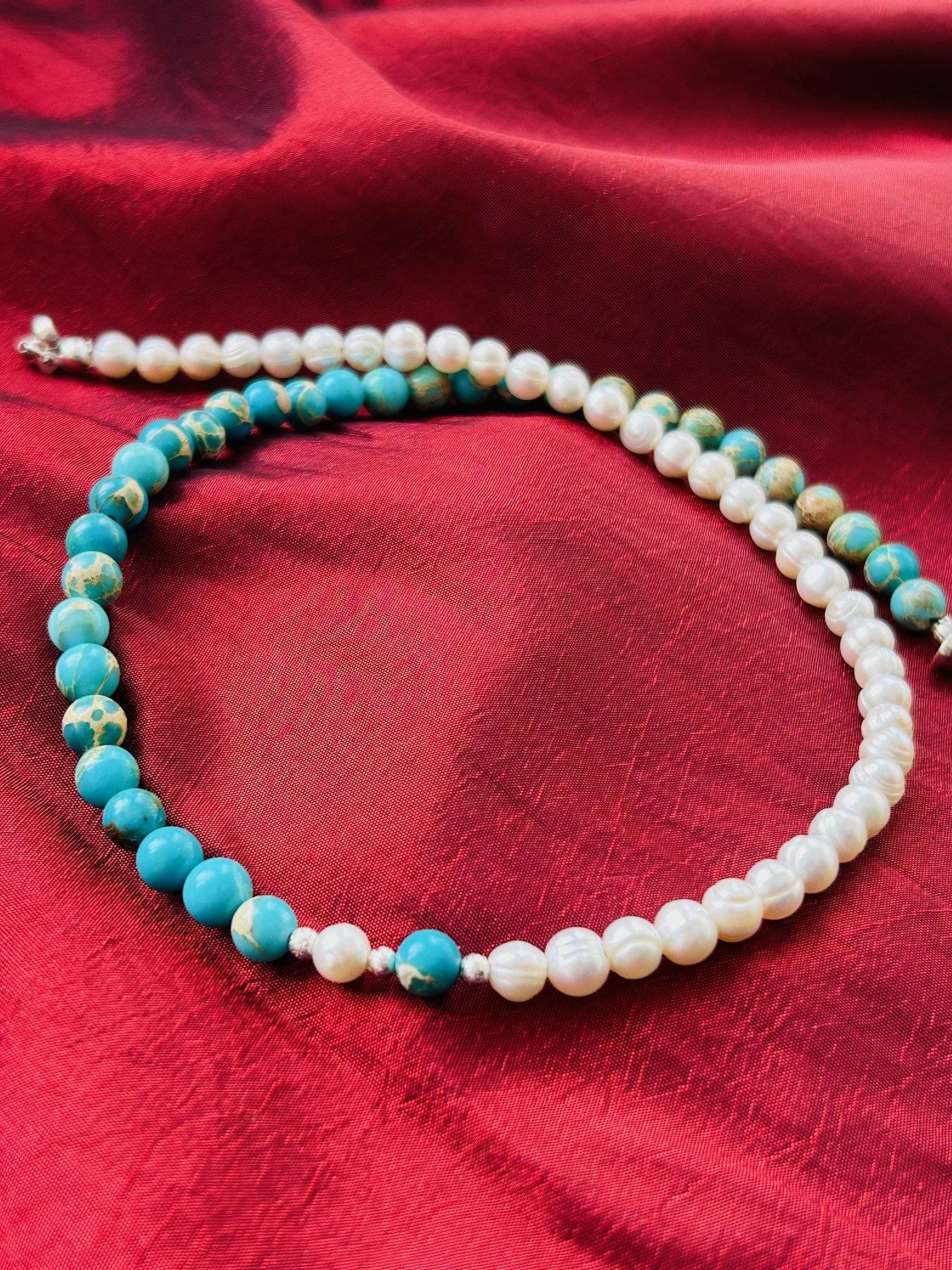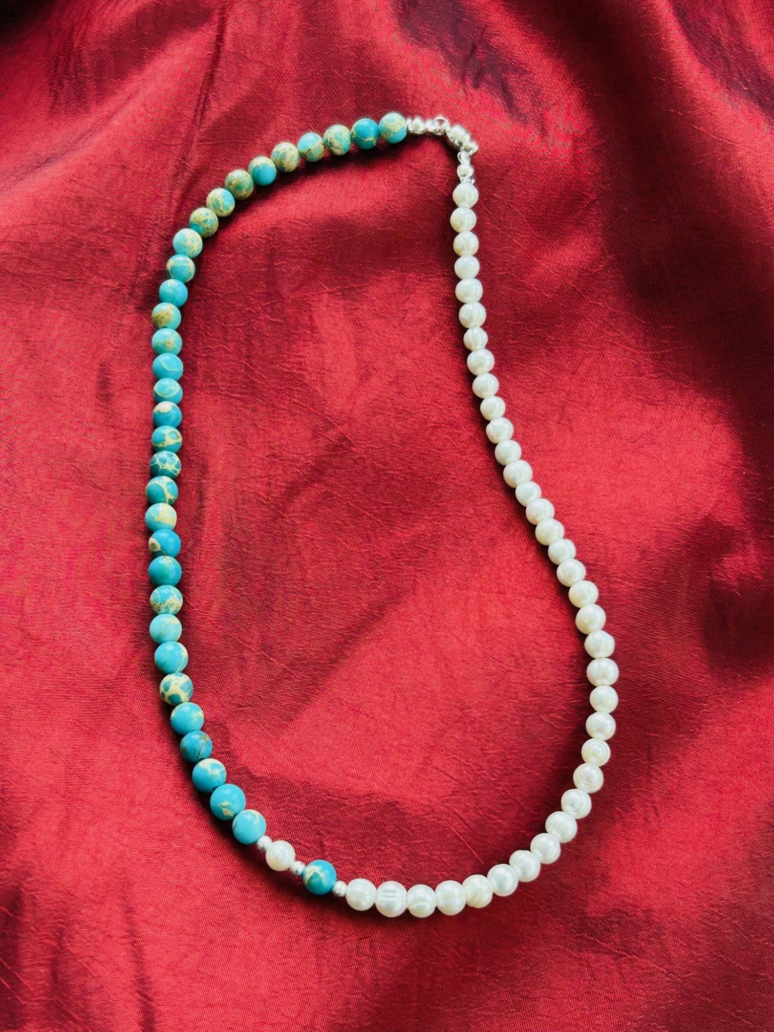 Iată un colier care aduce cu sine vibrația unei zile petrecute la malul mării, limpede, perfectă, luminoasă și plină de vitalitate. Albastrul intens al mării - reflectat de detoxifiantul jasp albastru - tonurile fierbinți ale soarelui și clipocitul apei în scoicile ce produc minunea numită PERLĂ - toate se întâlnesc în această compoziție jucată pe jumătăți de măsură, care, chiar și așa, păstrează un eficient echilibru.