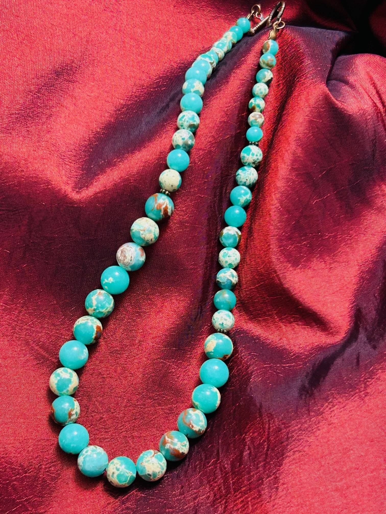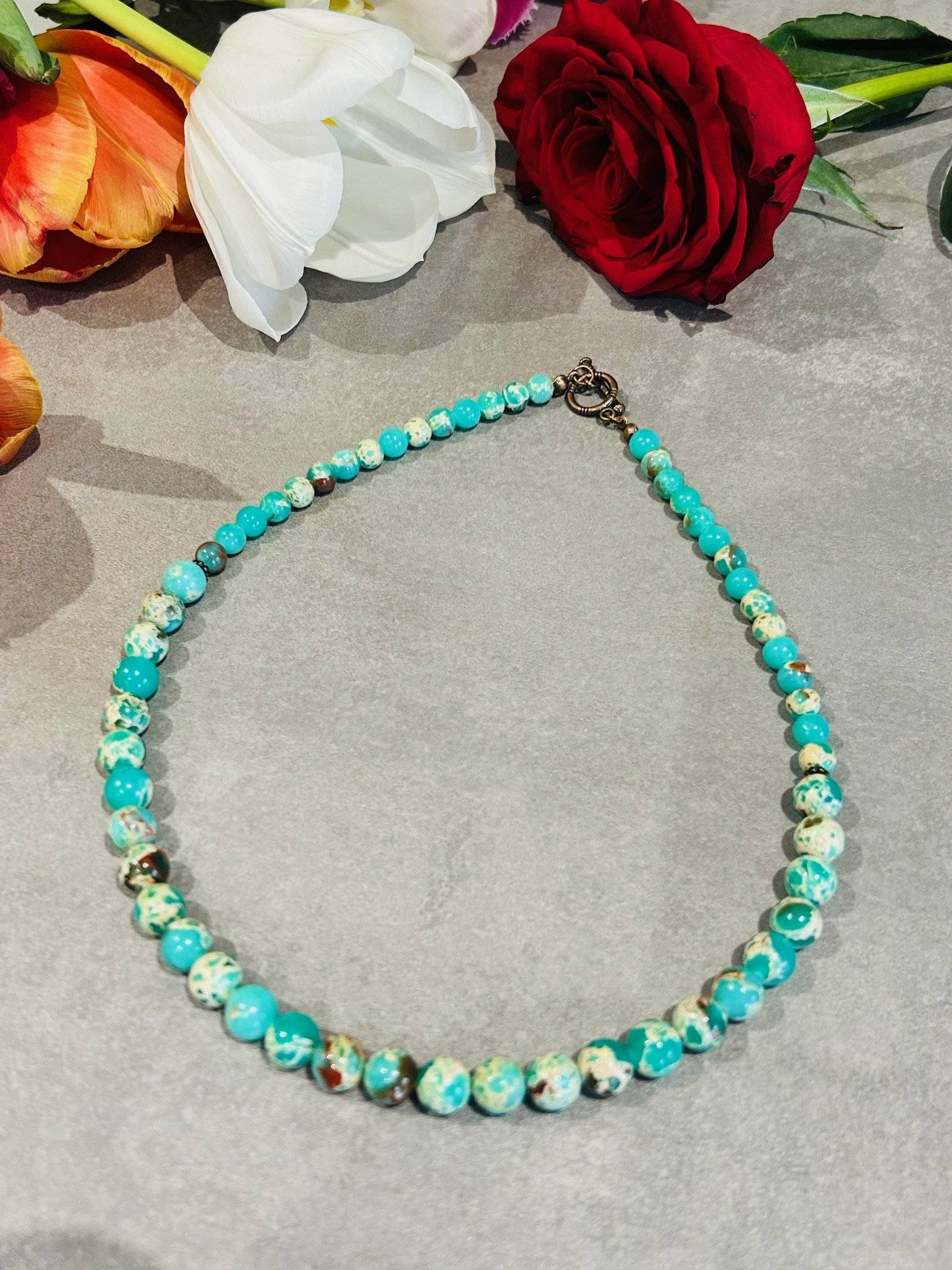Colierul din pietre semiprețioase JESSICA este confecționat din JASP IMPRESSION TURCOAZ, sfere cu dimensiunea de 6, 8 și 10 mm.