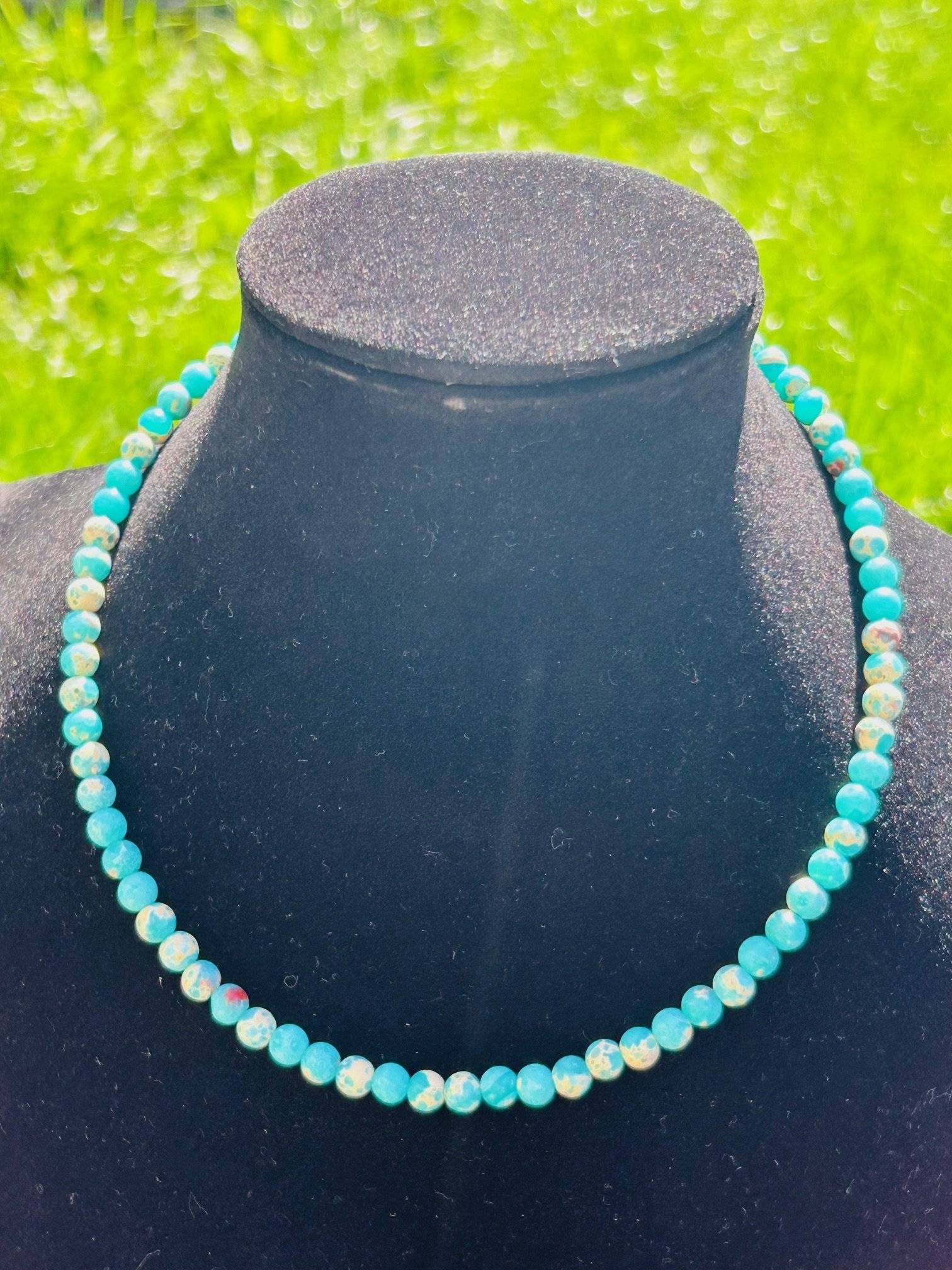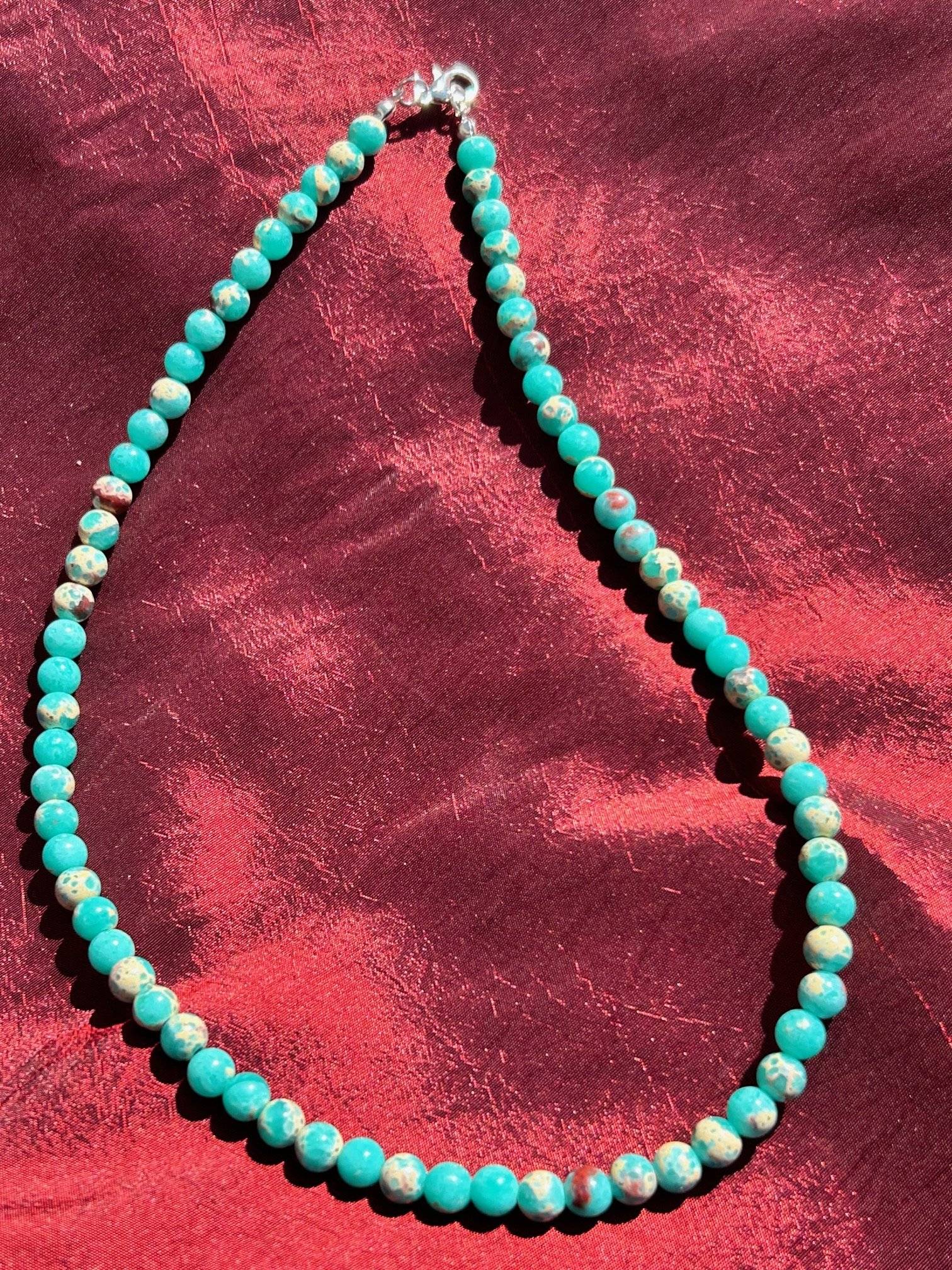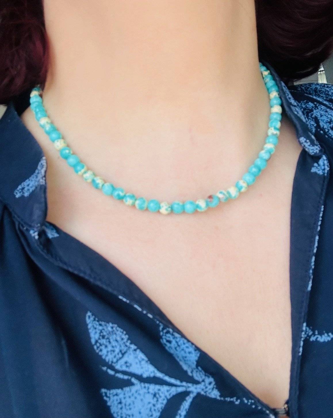 Colierul din pietre semiprețioase AMALIA este confecționat din JASP IMPRESSION TURCOAZ, sfere cu dimensiunea de 6 mm.