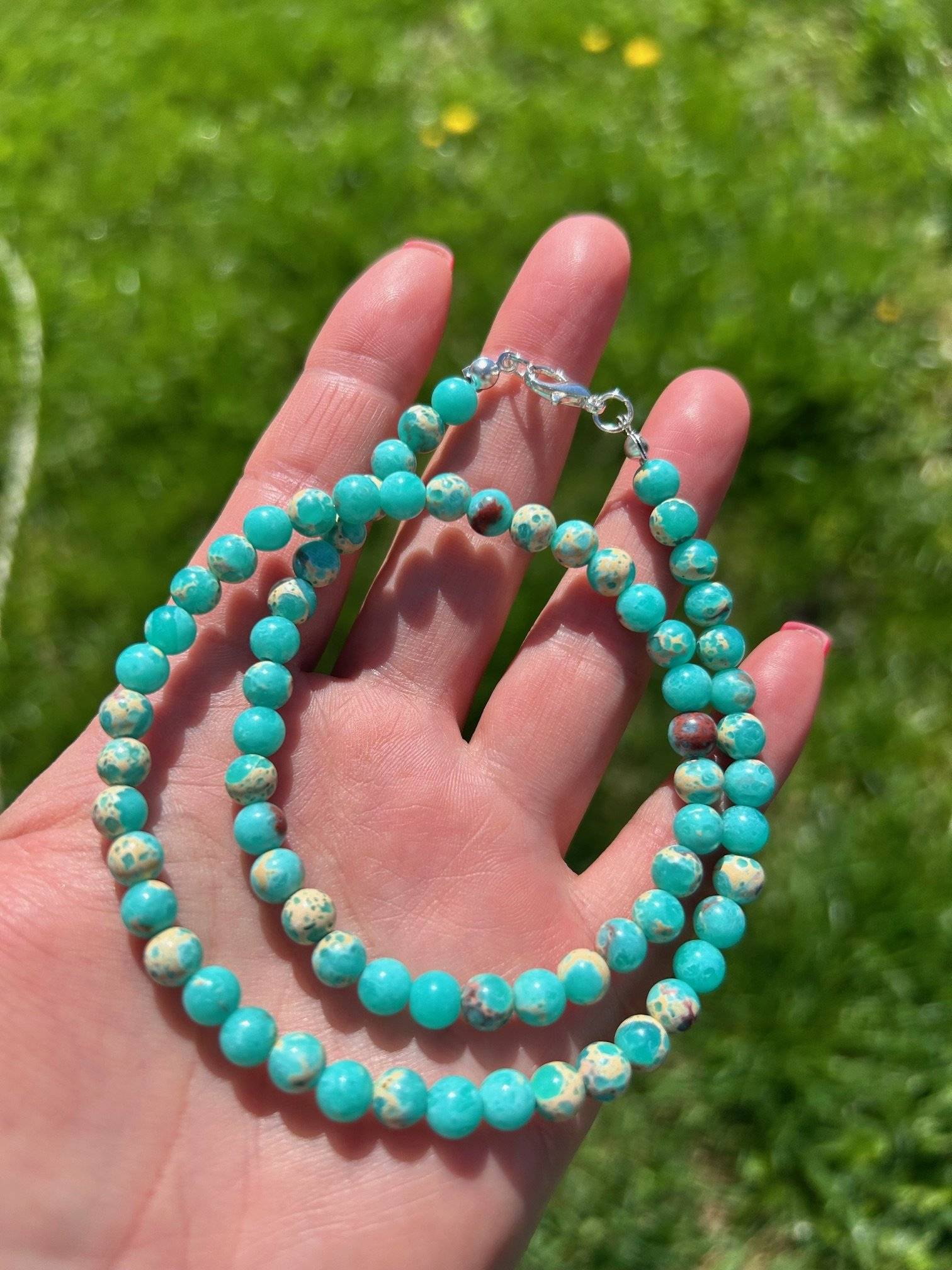 Pietrele semiprețioase de jasp sunt montate pe fir oțel siliconat de 0,45 mm grosime, iar închiderea se face cu închizătoare lobster din aliaj placată cu argint. Pietrele semiprețioase pot prezenta mici diferențe de nuanță de la o piatră la alta, iar culoarea poate varia puțin în funcție de setările monitorului Dvs.