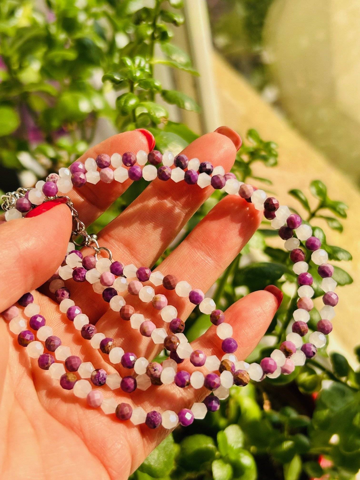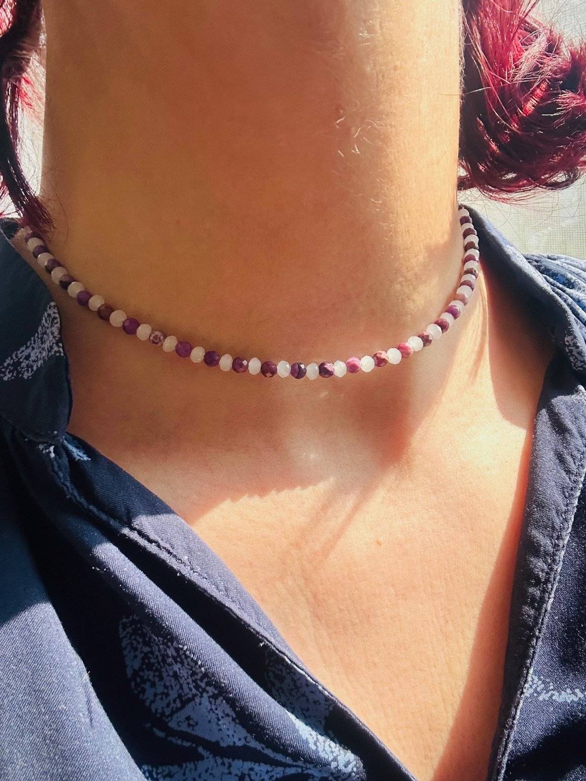 Cristalele sunt montate pe fir oțel siliconat de 0,40 mm grosime, iar închiderea se face cu închizătoare din aliaj placat cu argint și lanț prelungitor. Pietrele semiprețioase pot prezenta diferență de nuanță de la o piatră la alta, iar culoarea poate varia puțin în funcție de setările monitorului Dvs.