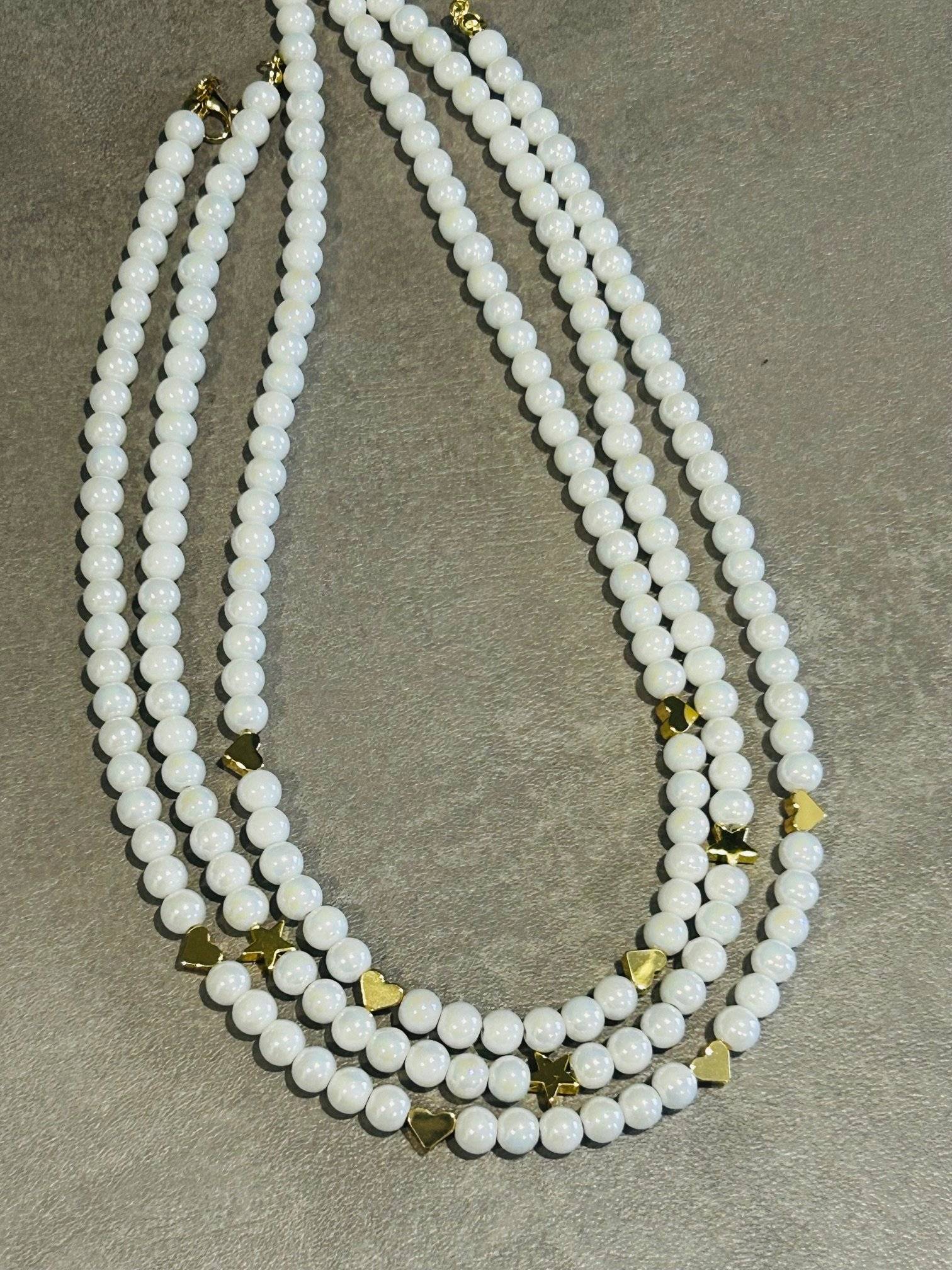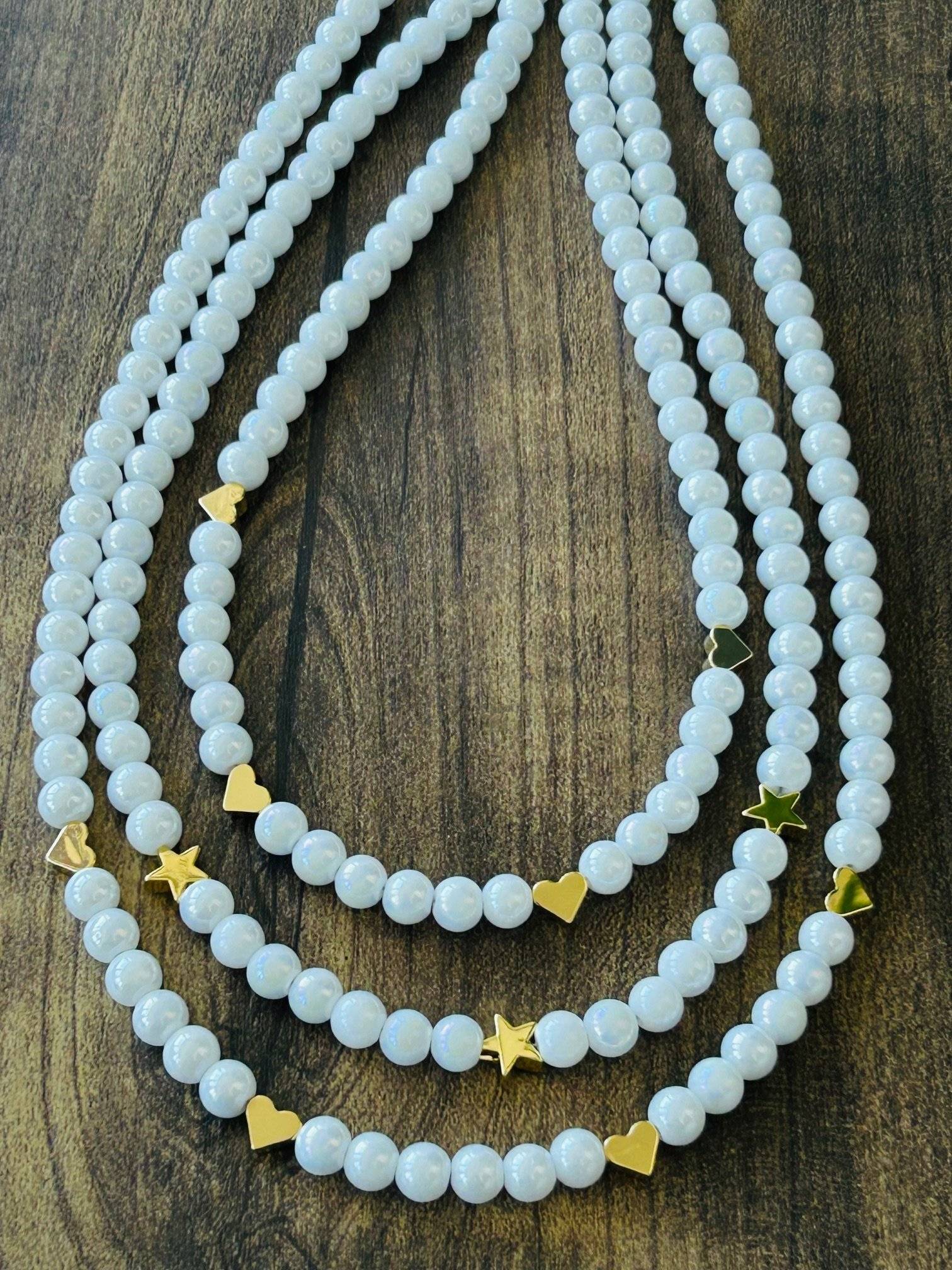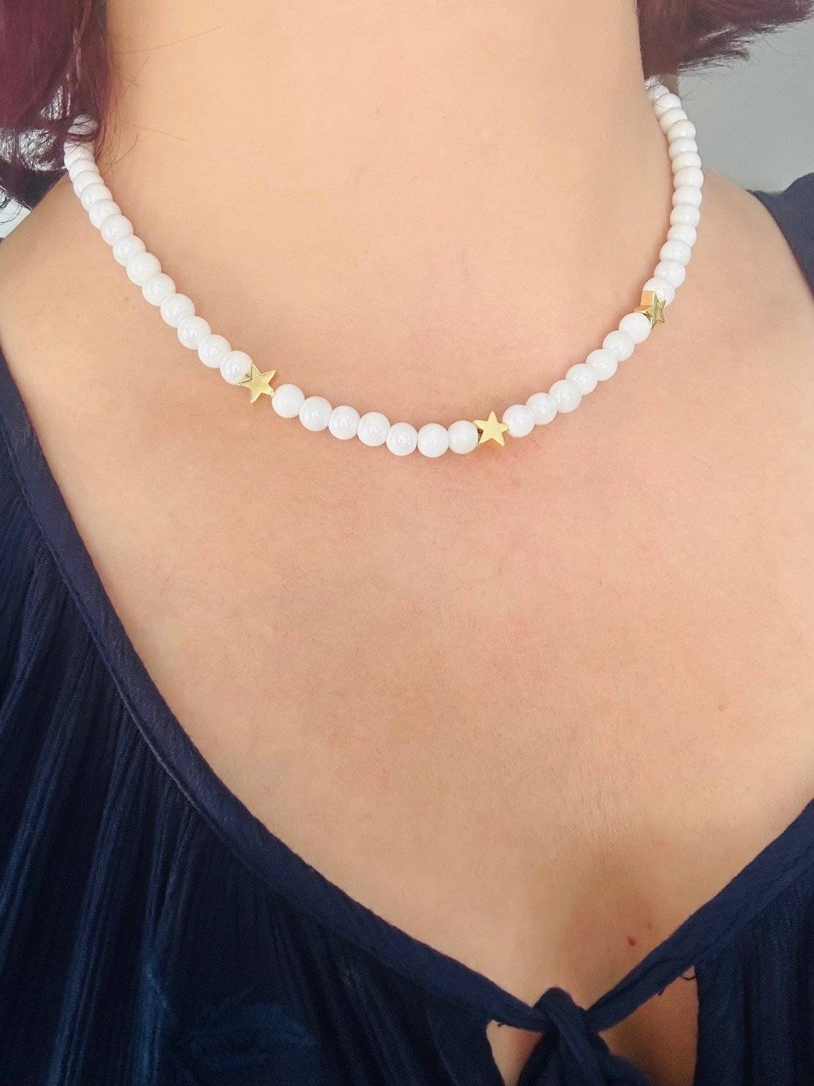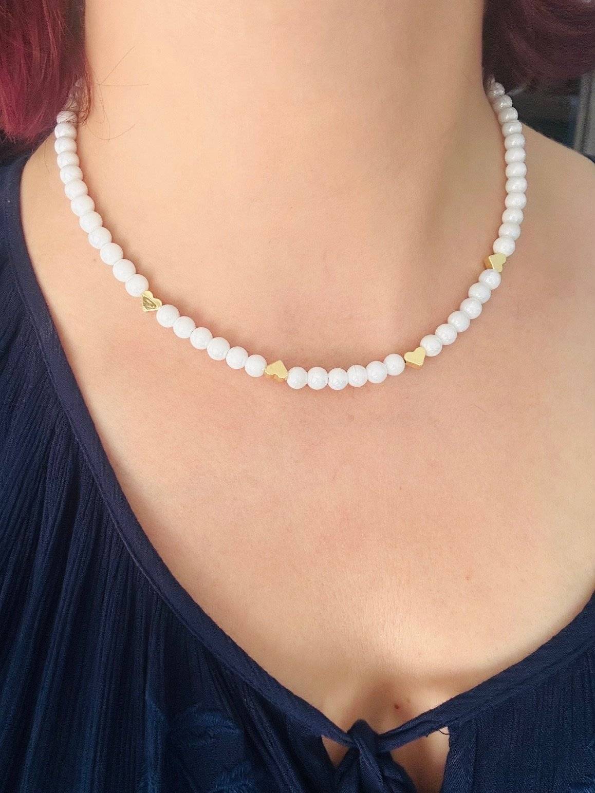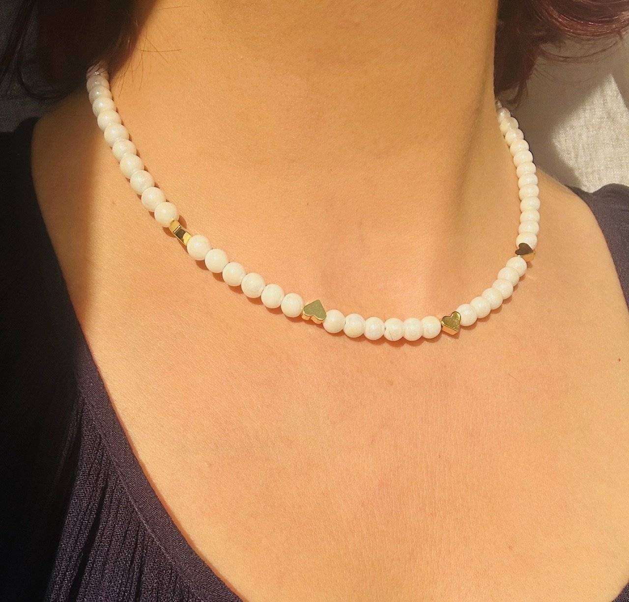 Vă prezentăm un colier realizat manual din perle albe sidefate PRECIOSA, de calitate AA, cu dimensiunea de 6 mm și accesorii centrale din alamă placată cu aur de 18 K.