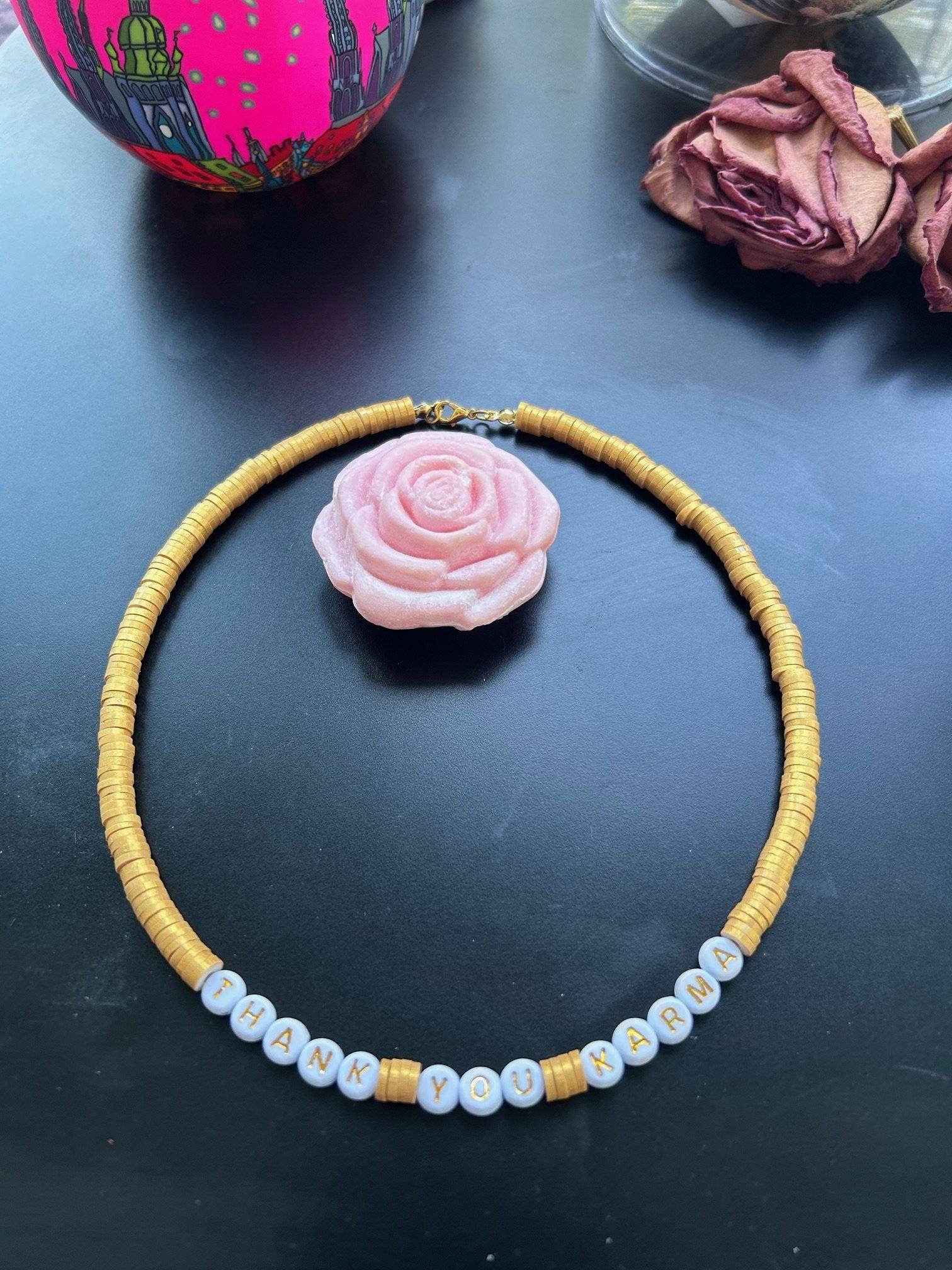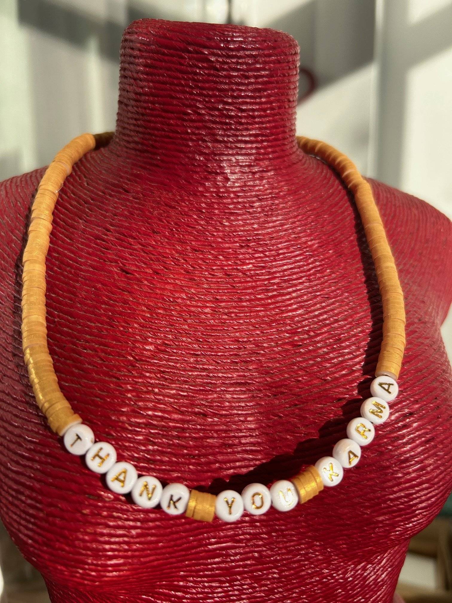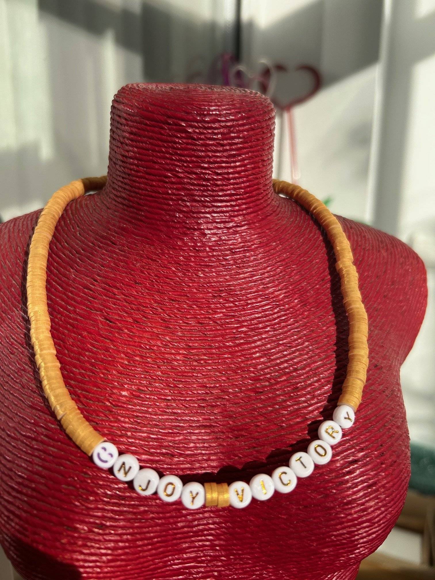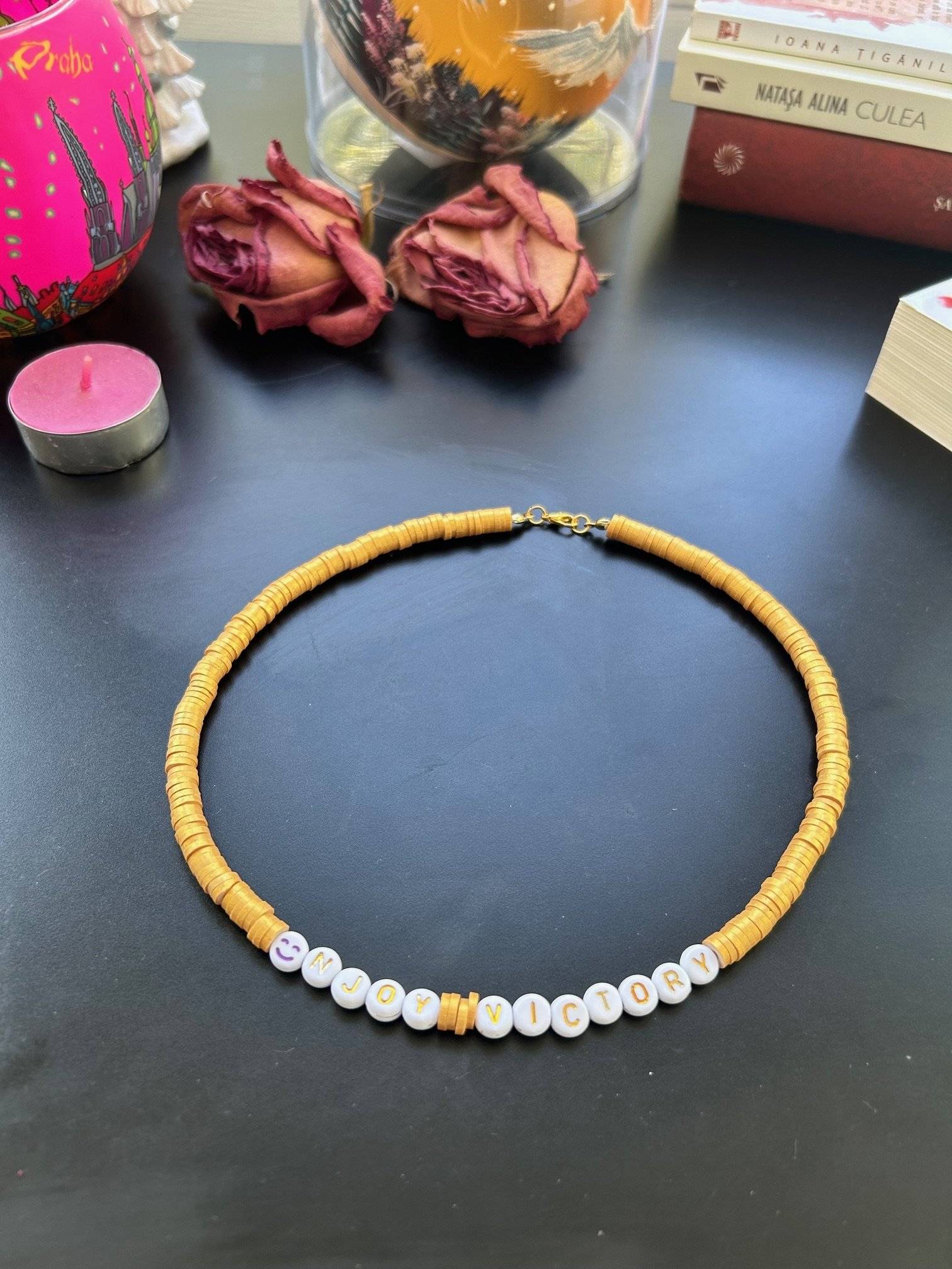 Coliere unicat confecționate din heishi aurii de 6 mm, înșirate pe sârmă siliconată și cu accesorii metalice din alamă placată cu aur. Mesajul-simbol este construit din mărgeluțe-litere acrilice aurite.