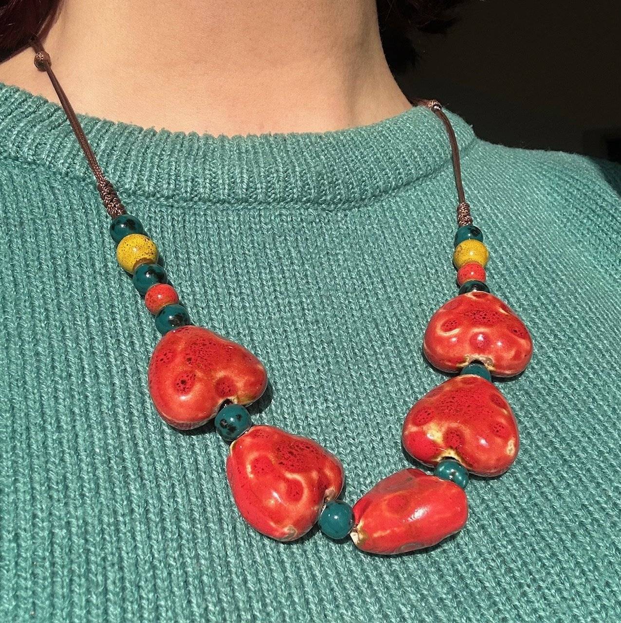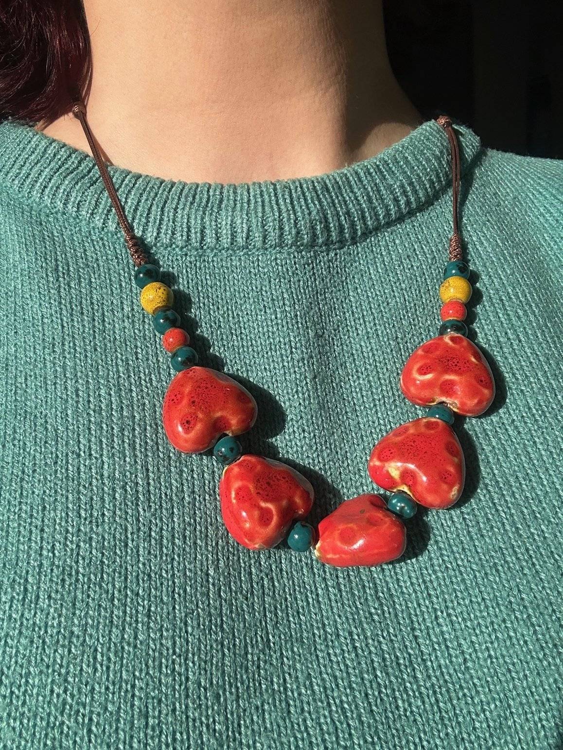Vă prezentăm un colorat colier construit din mărgele ceramice de diferite mărimi, în nuanțe de roșu și verde, care sunt montate pe fir textil multistrat cu dimensiune reglabilă.