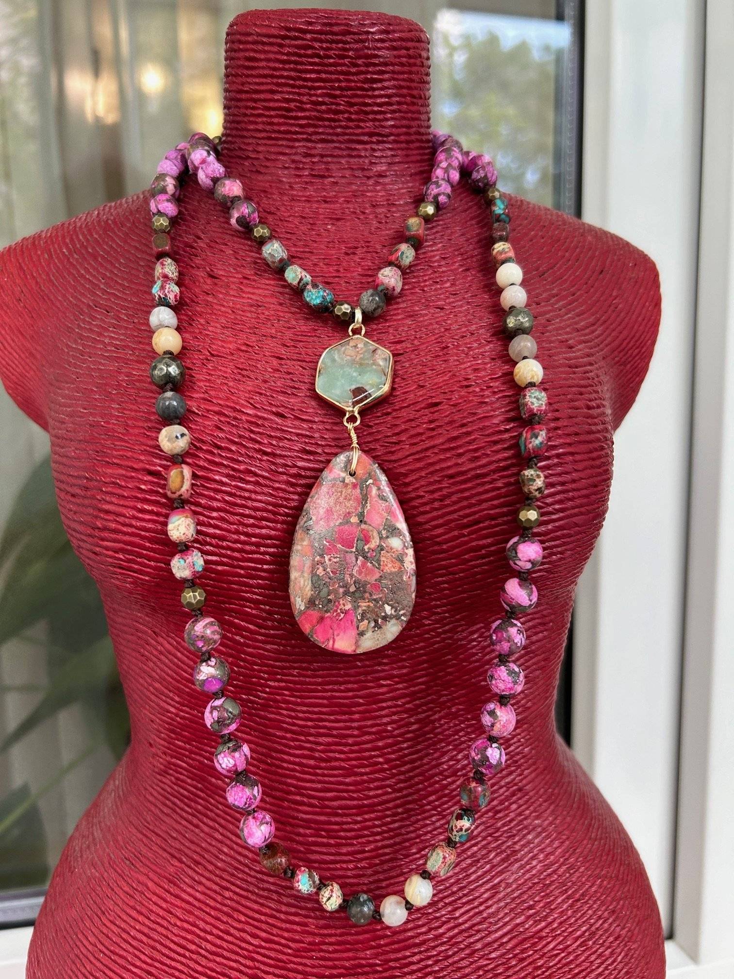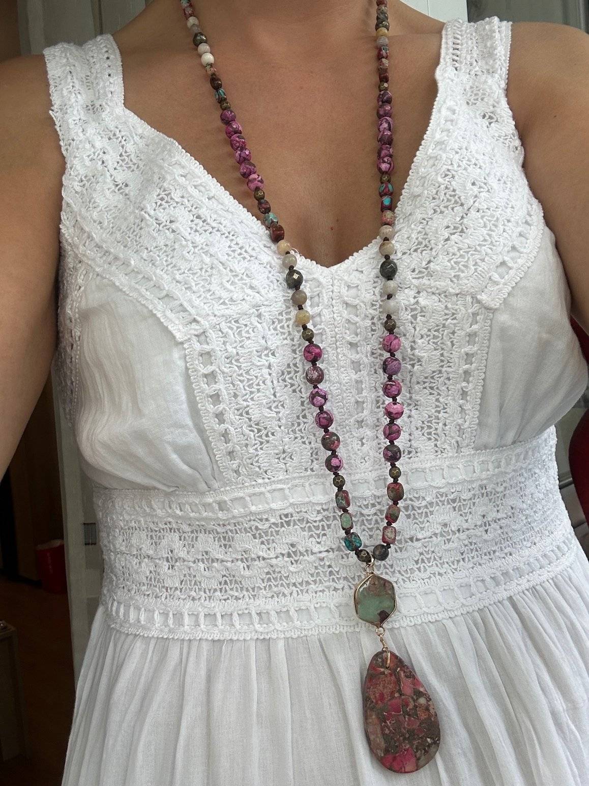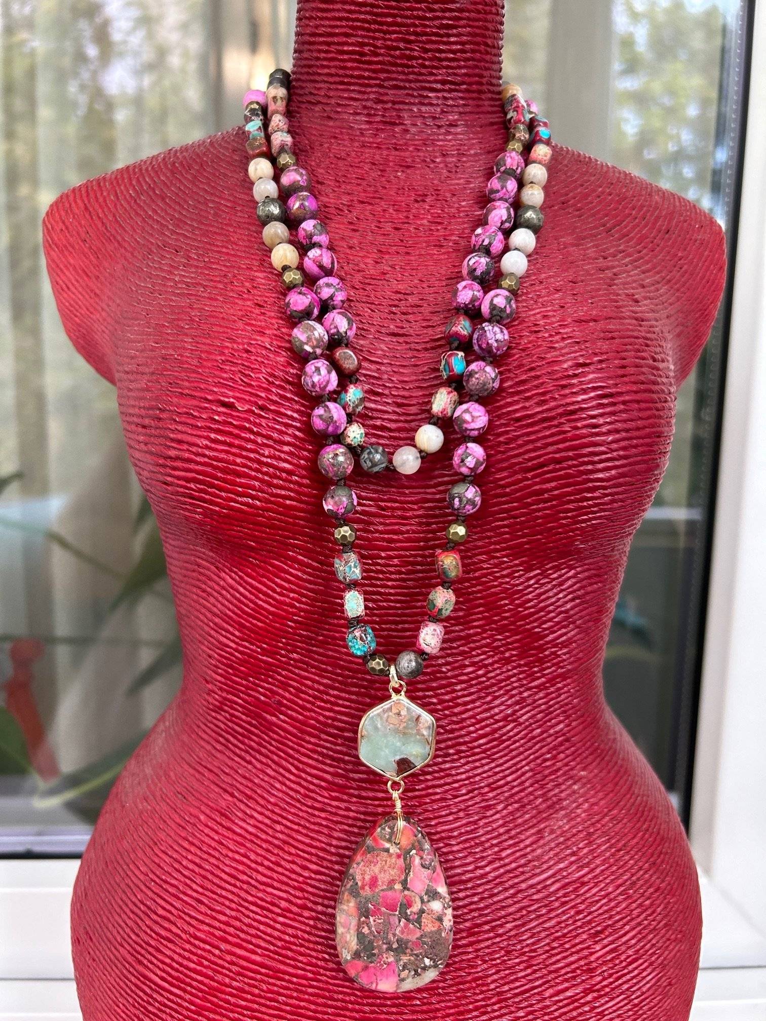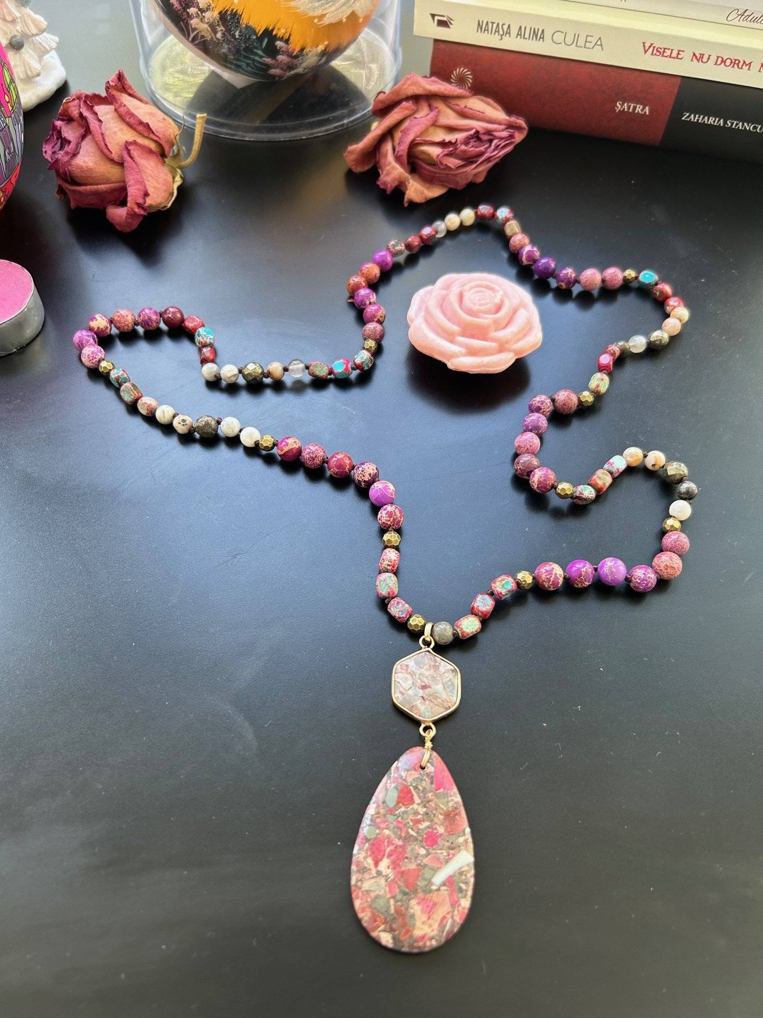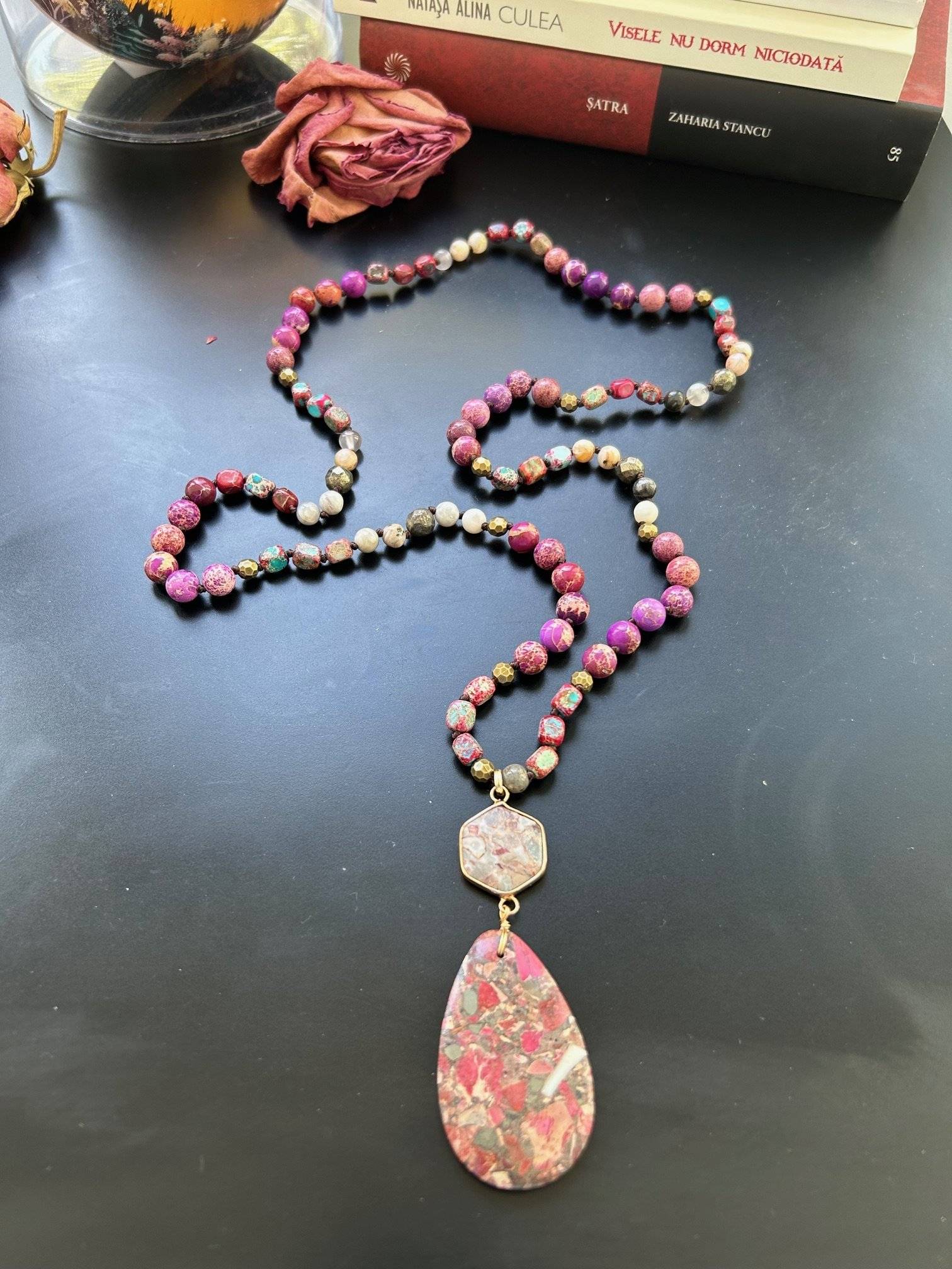 Un colier de mărgele absolut încântător, alcătuit din pietre sintetice de jasp imperial roz intens, mărgele-sfere cu dimensiunea de 8 mm și mărgele dreptunghiulare de 6x8 mm și câteva mărgele metalice fațetate 4 și 6 mm, separate prin noduri.