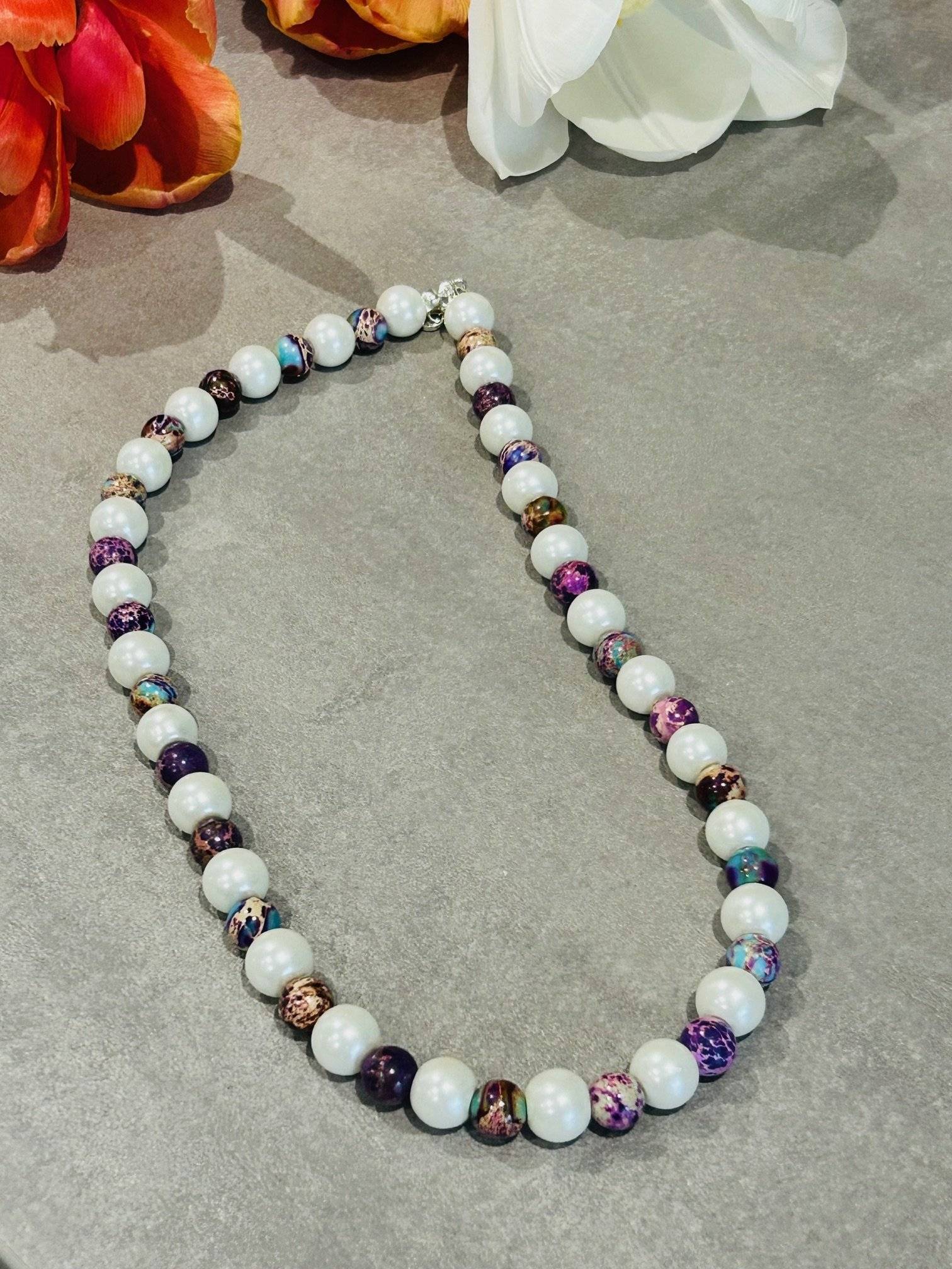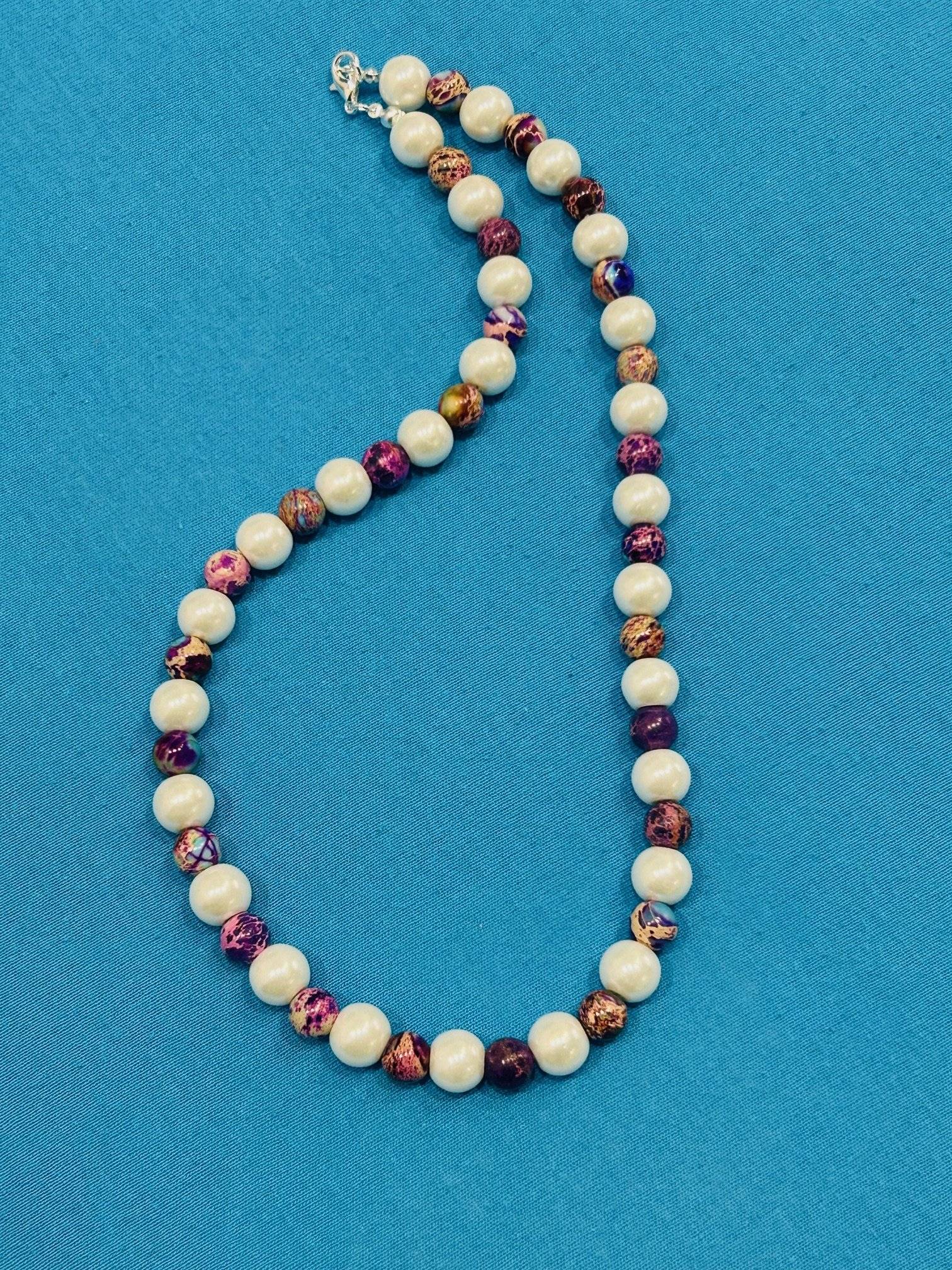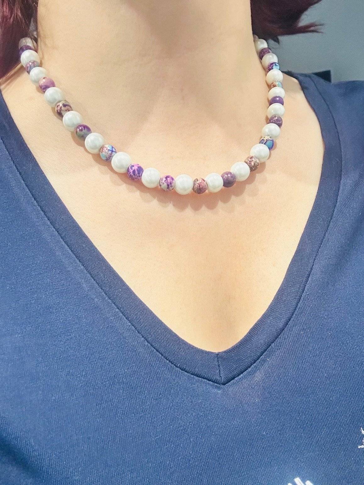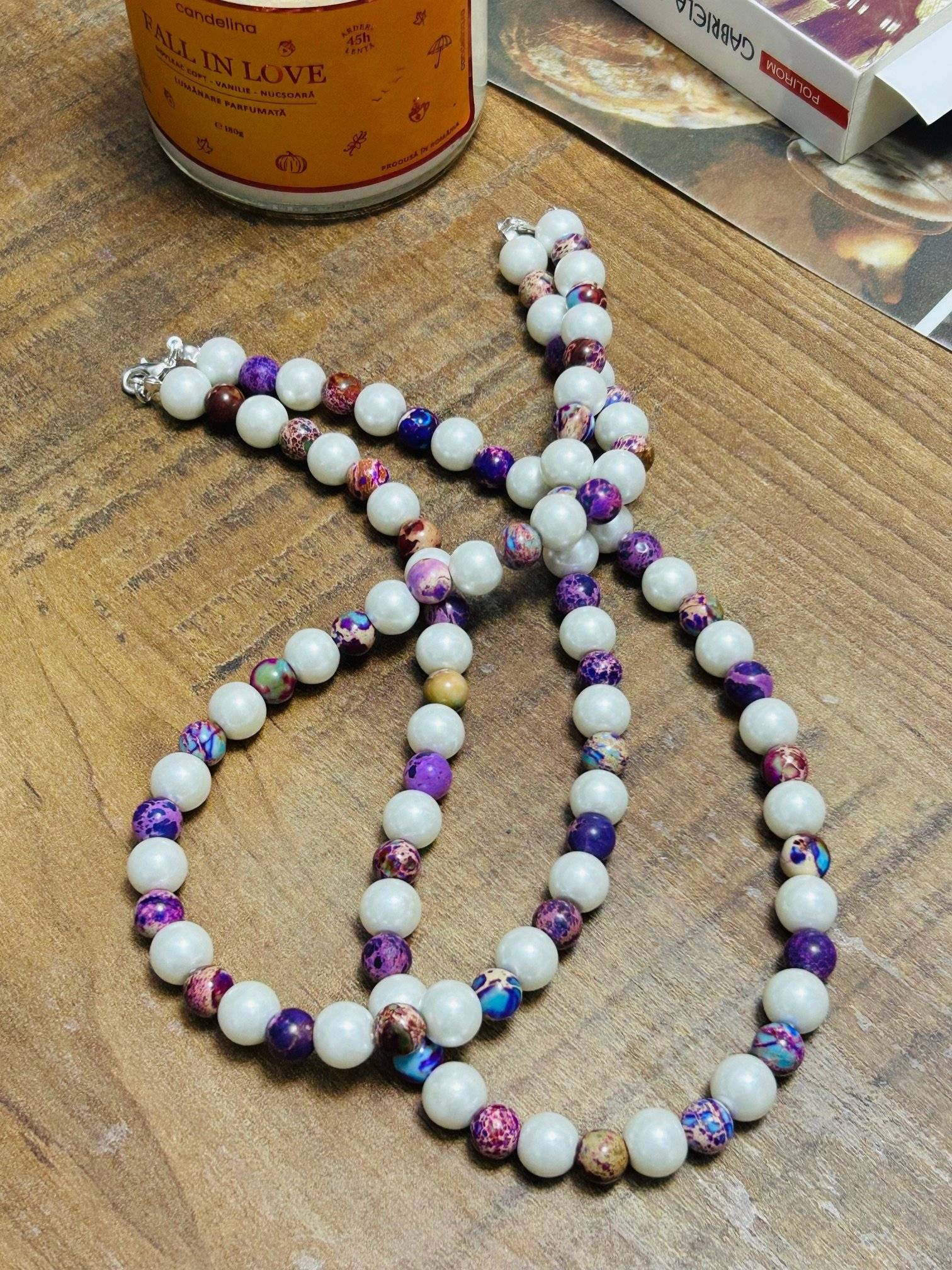 Mărgelele sunt montate pe fir oțel siliconat de 0,45 mm grosime, iar închiderea se face cu închizătoare lobster din aliaj placată cu argint. Pietrele semiprețioase pot prezenta în mod natural diferență de nuanță de la o piatră la alta, iar culoarea poate varia puțin în funcție de setările monitorului Dvs.