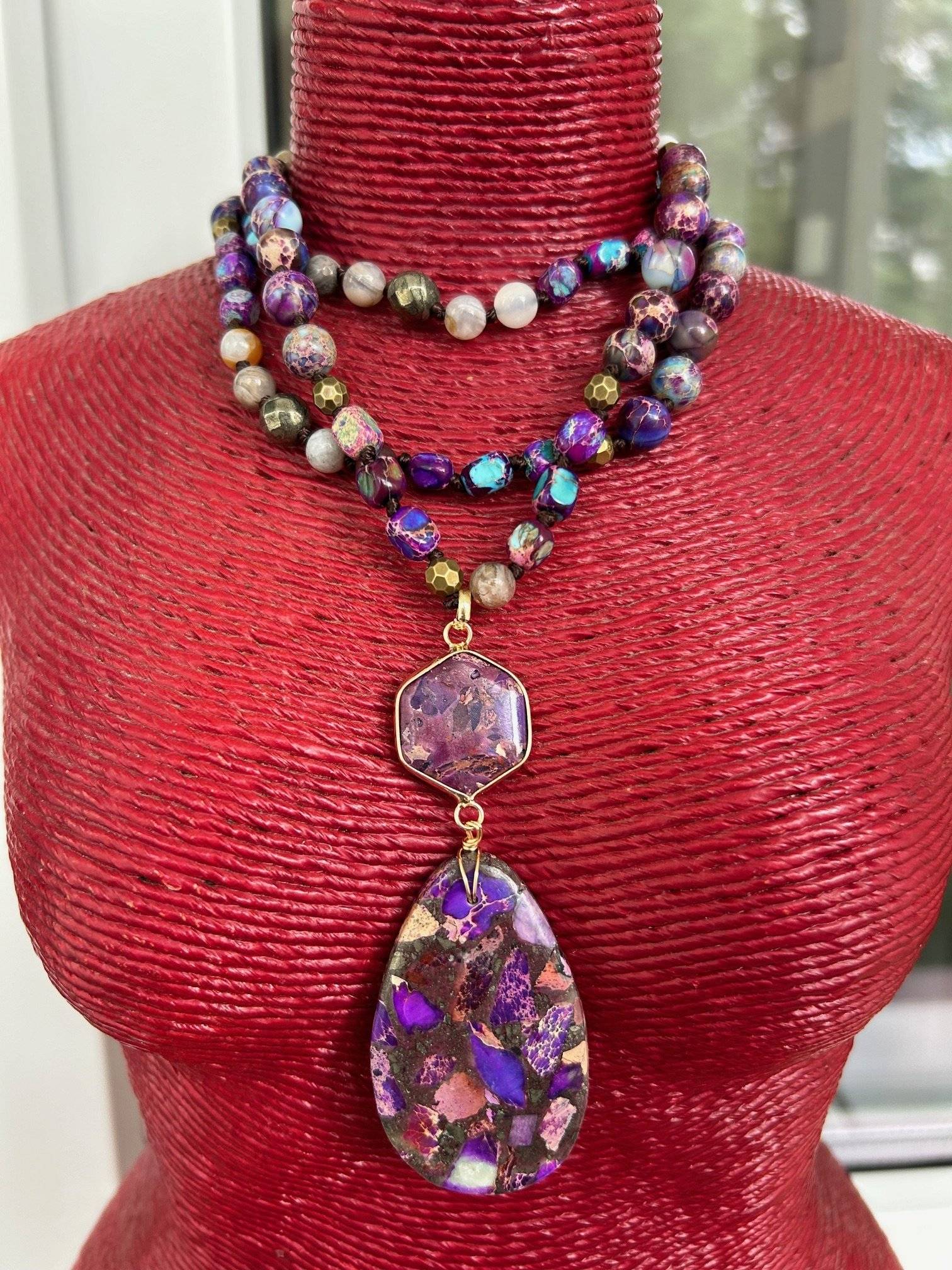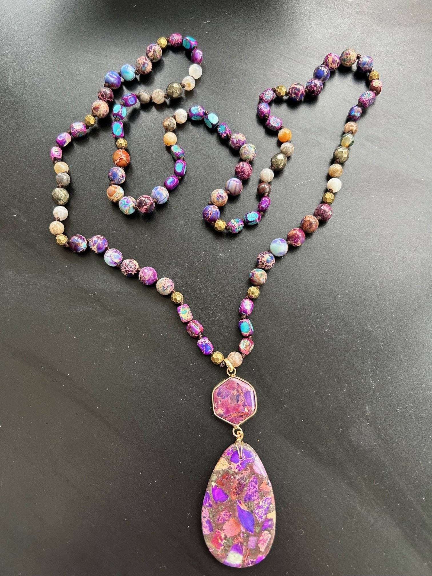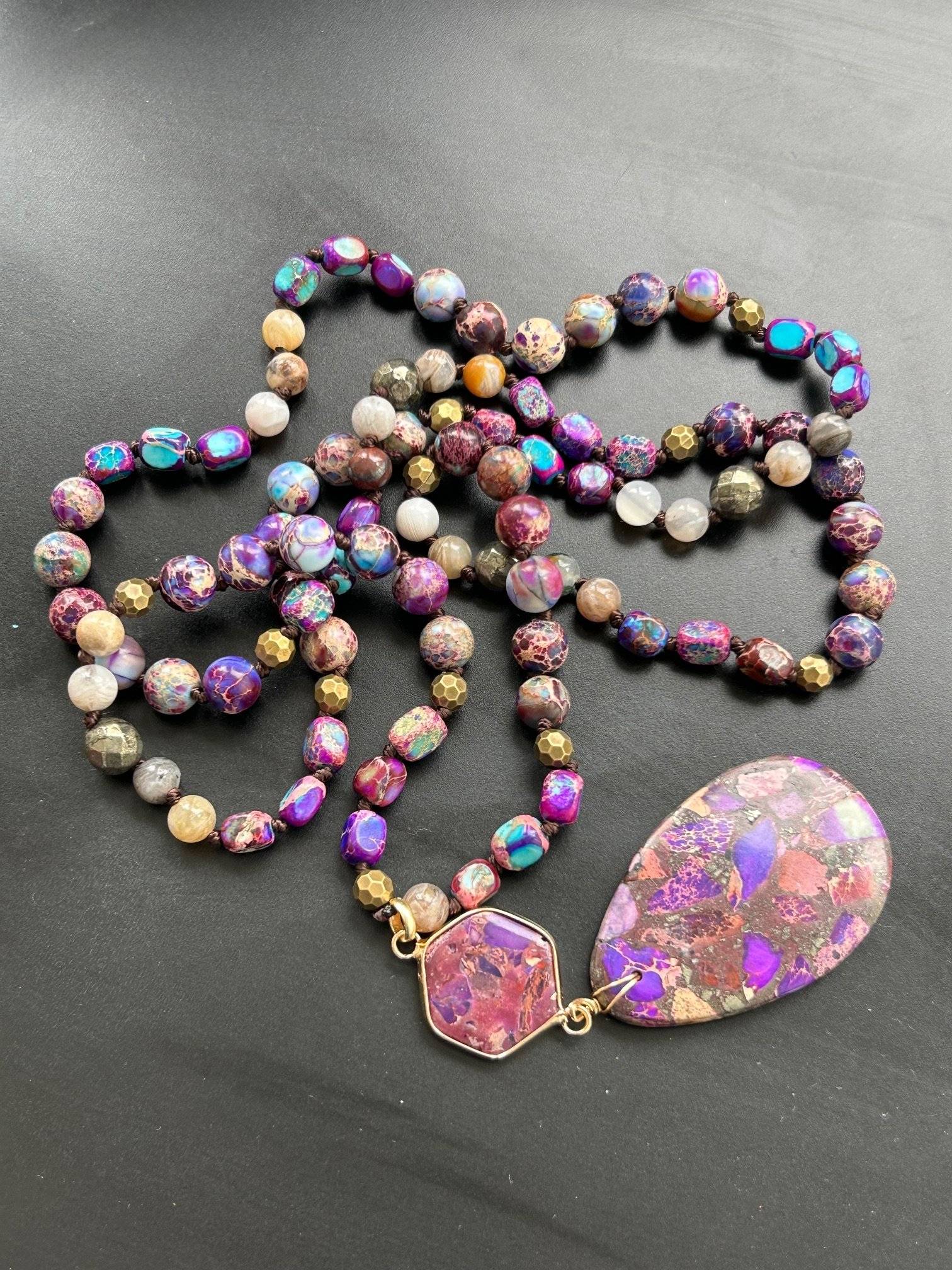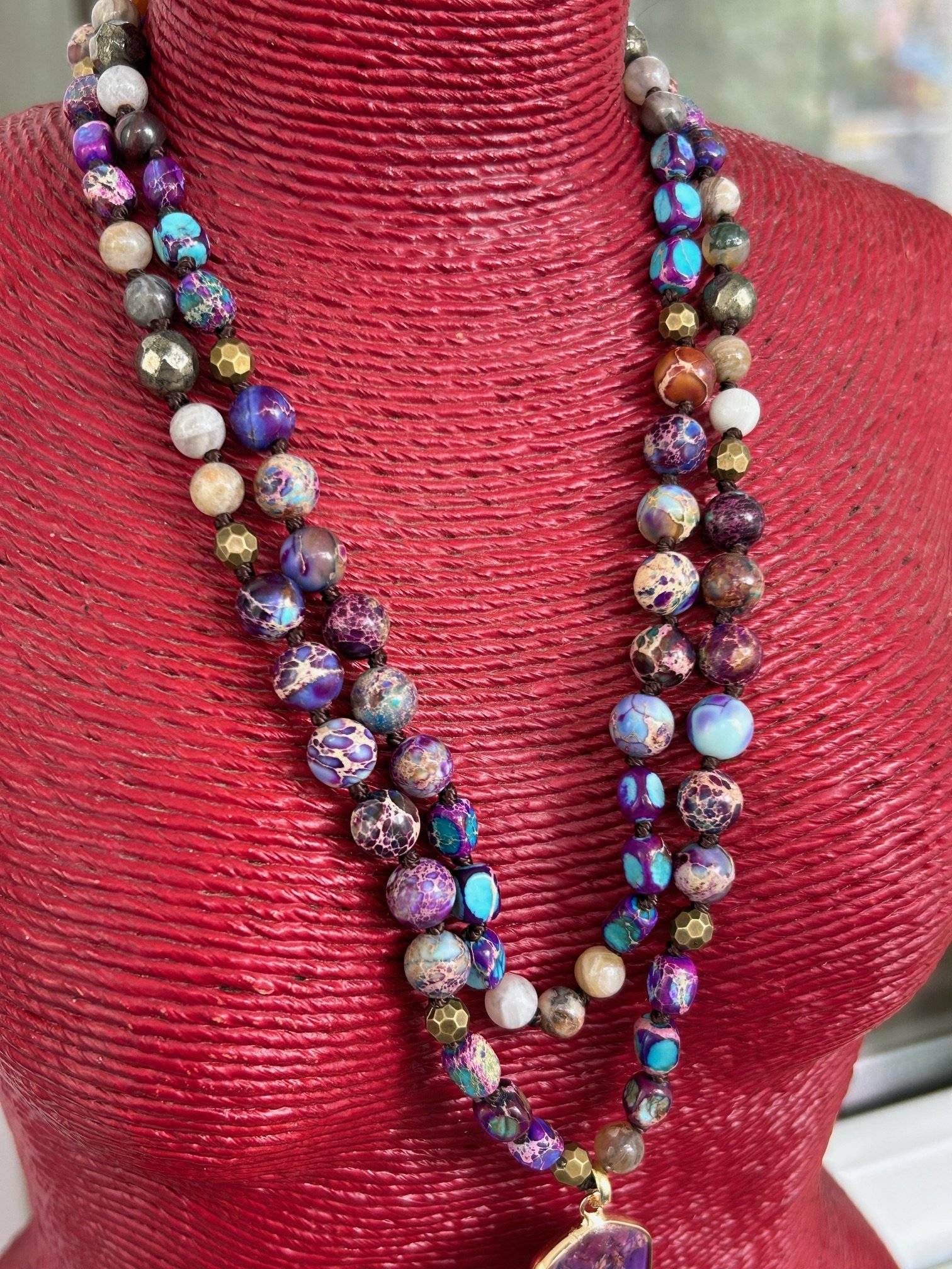 Un șirag de mărgele absolut încântător, alcătuit din pietre de jasp imperial violet, mărgele sfere cu dimensiunea de 8 mm și mărgele dreptunghiulare de 6x8 mm și câteva mărgele metalice fațetate 4 și 6 mm, separate prin noduri.