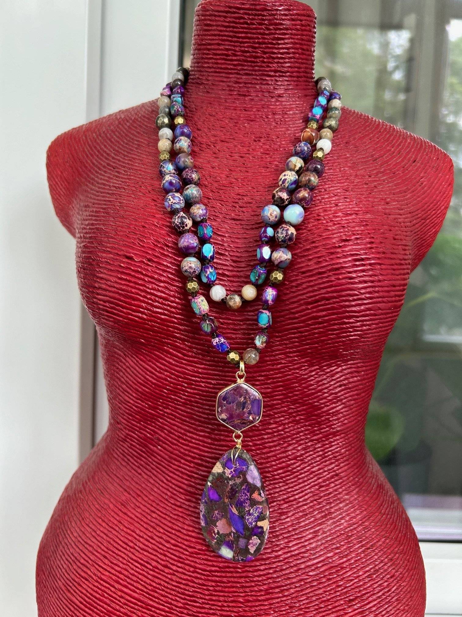 Dispune de un pandantiv mai mic, hexagonal, dimensiune 20x20 mm și unul mare, oval, dimensiune 30x50 mm, ambele din piatră JASP IMPERIAL nuanță indigo / violet.
