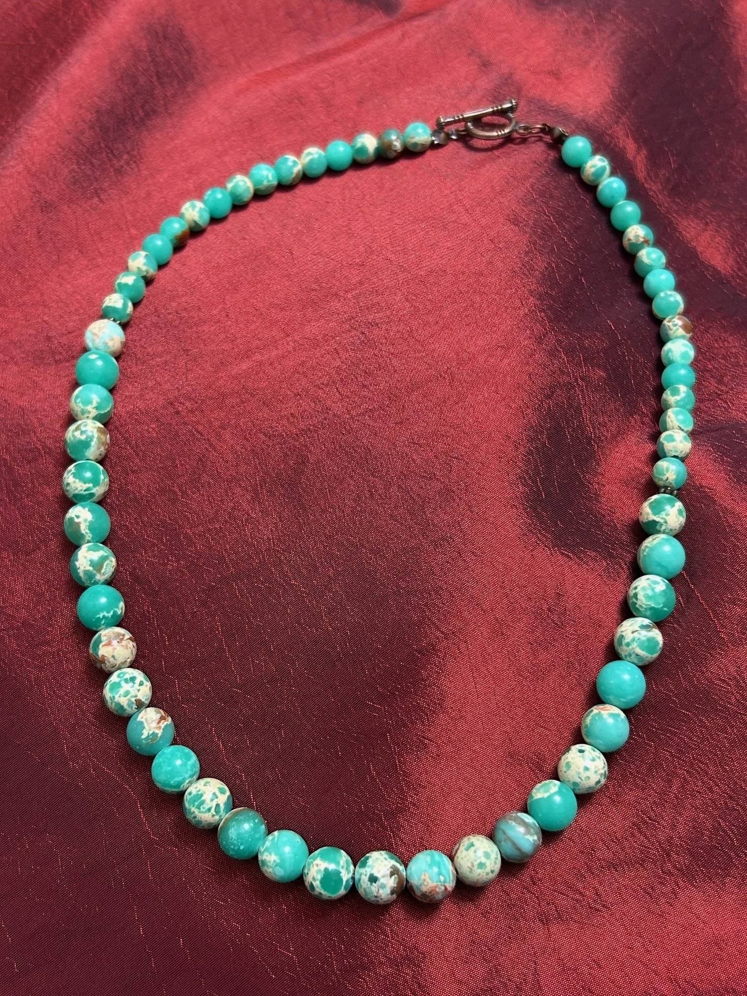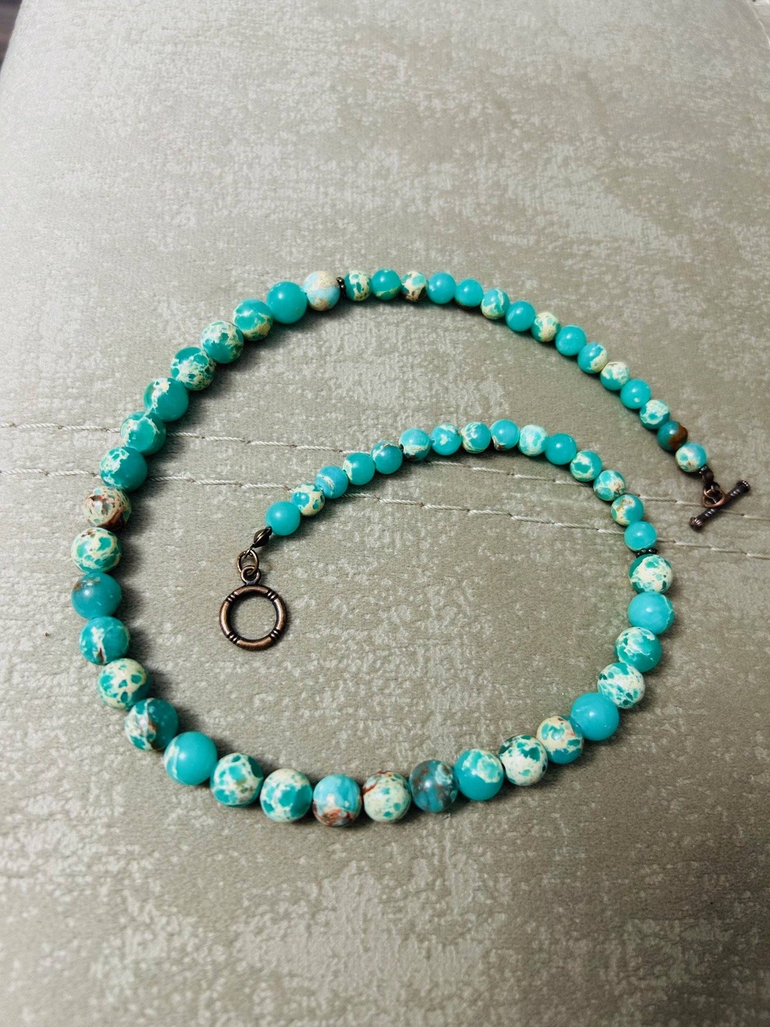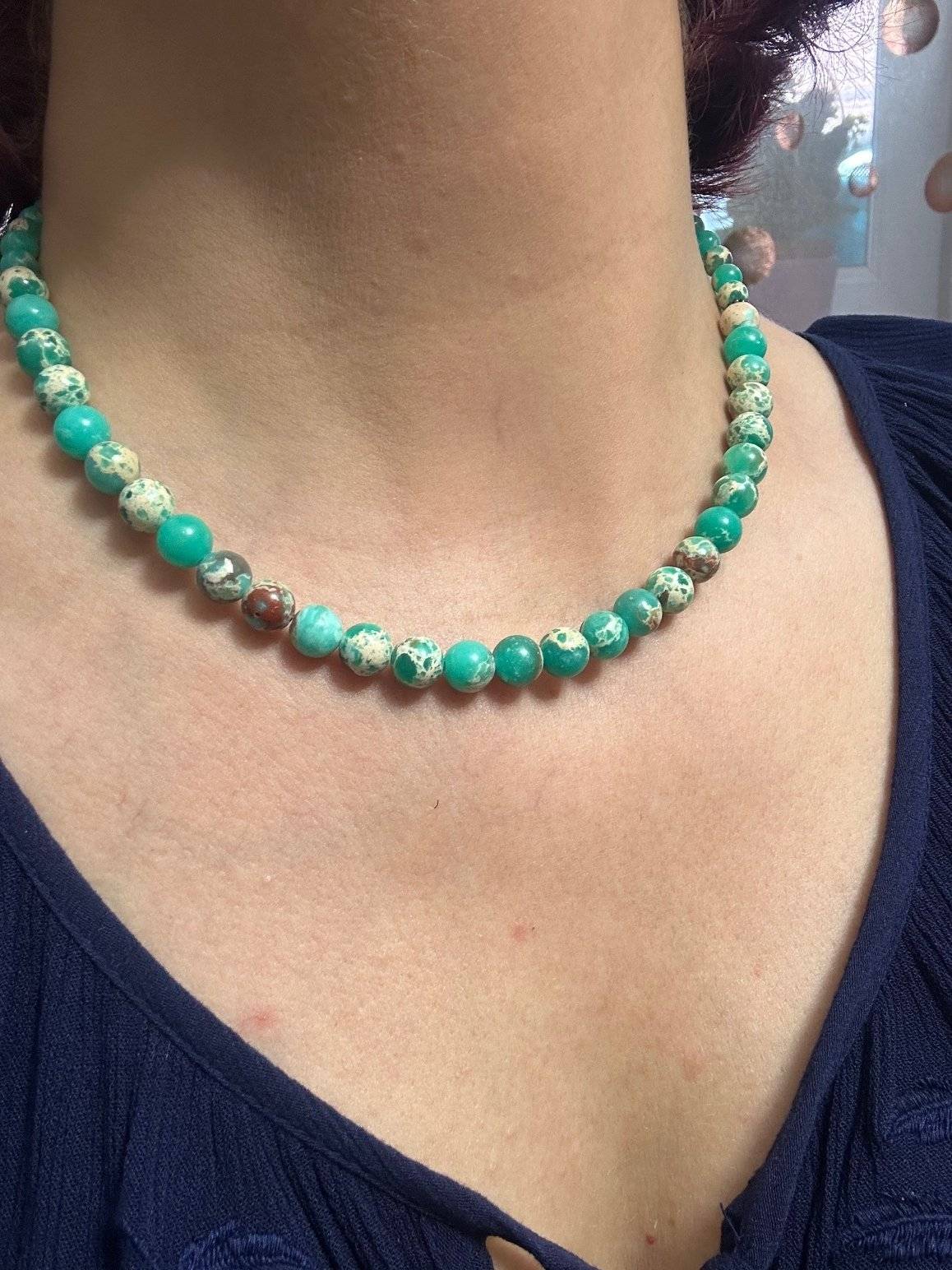 Colierul din pietre semiprețioase MARILYN este confecționat din JASP IMPRESSION TURCOAZ, sfere cu dimensiunea de 6 și 8 mm.
