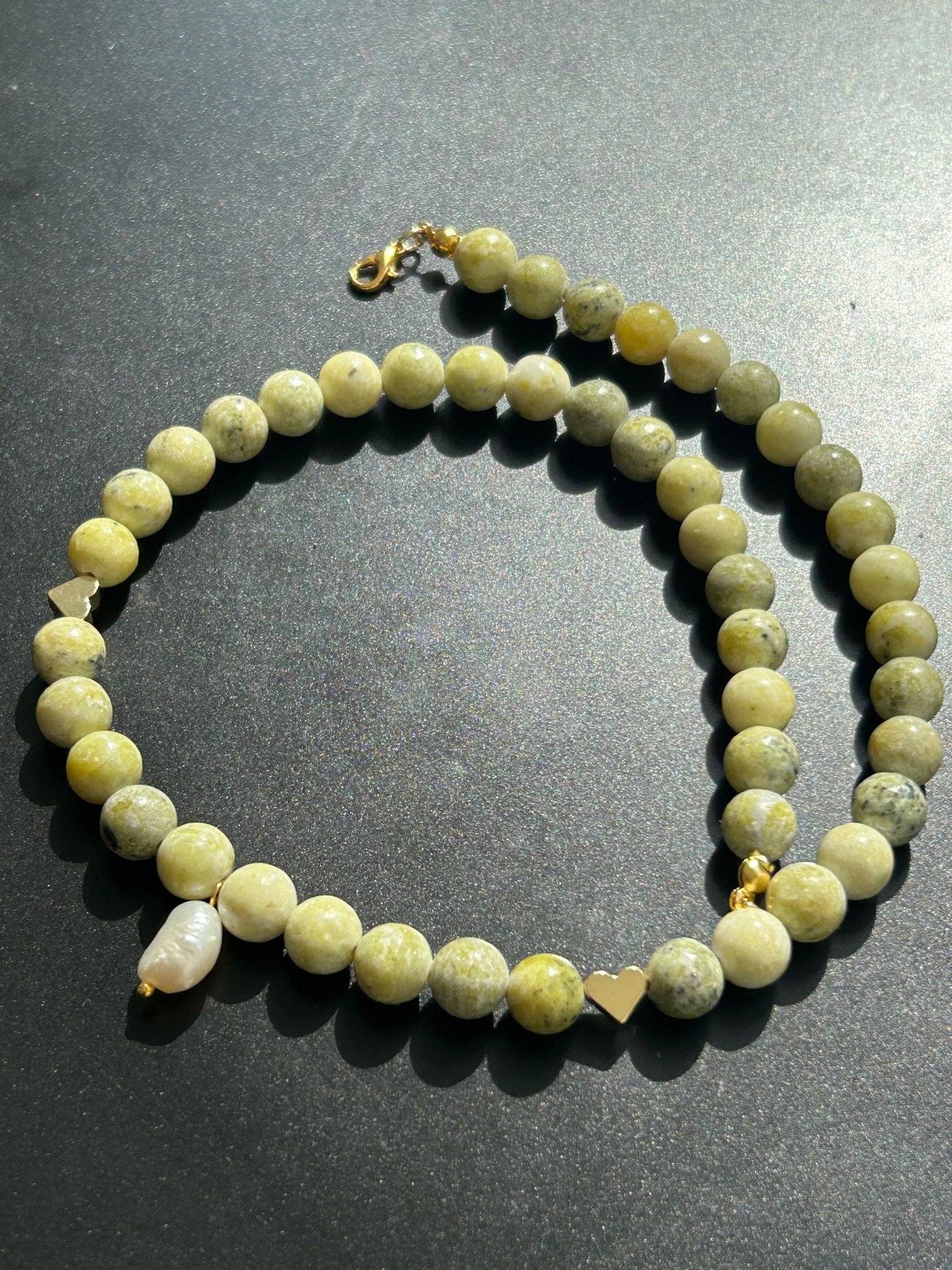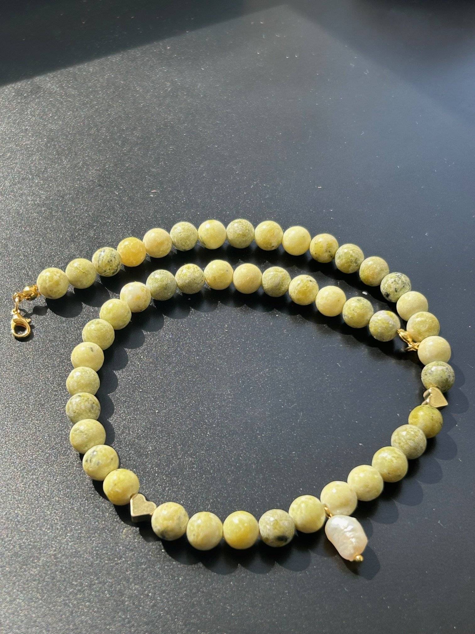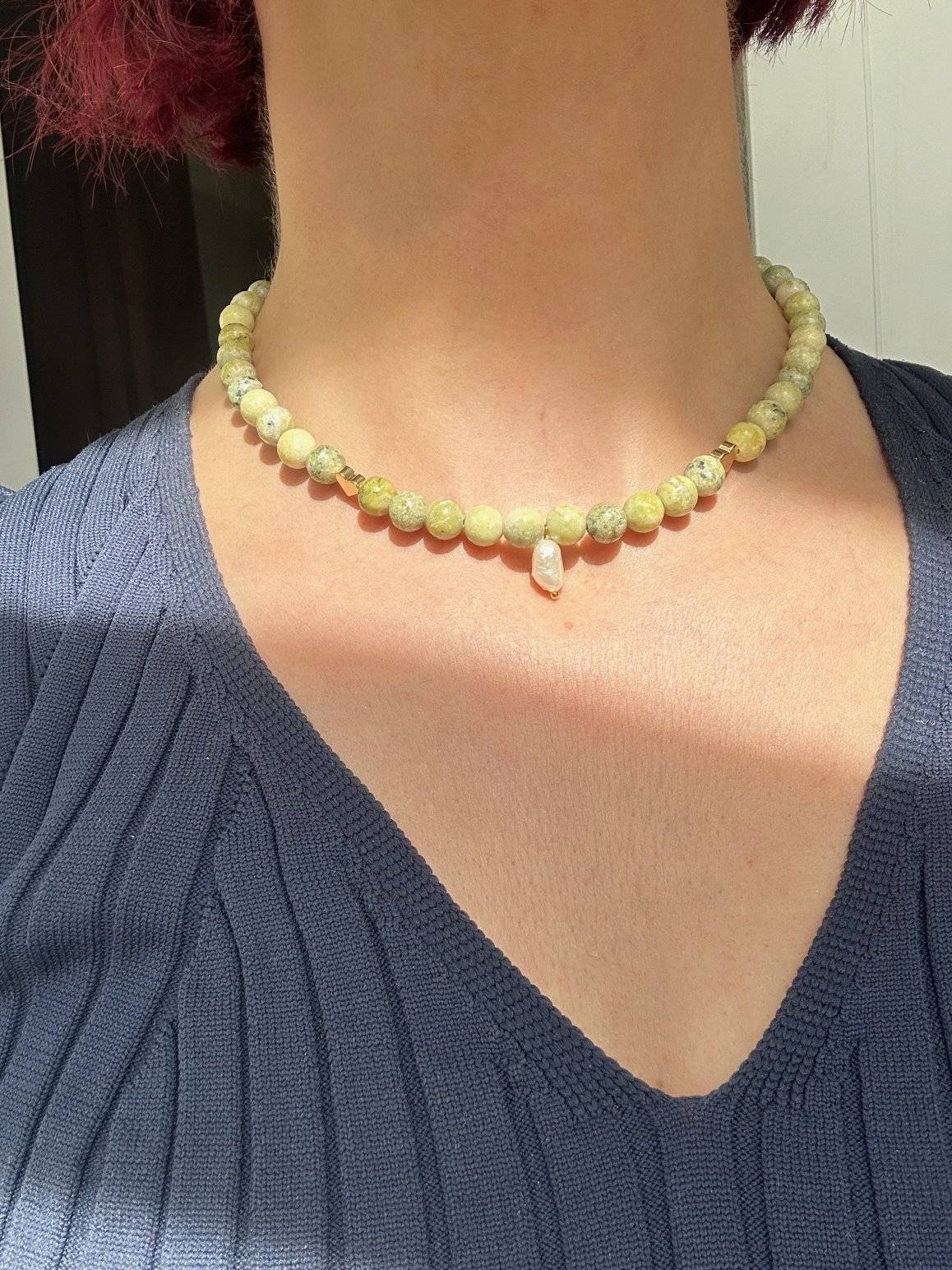 Mărgelele sunt înșirate pe fir oțel siliconat de 0,45 mm grosime, iar închiderea se face cu închizătoare lobster din aliaj placată cu aur de 14k. Pietrele semiprețioase pot prezenta mici diferențe de nuanță de la o piatră la alta, iar culoarea poate varia puțin în funcție de setările monitorului Dvs.