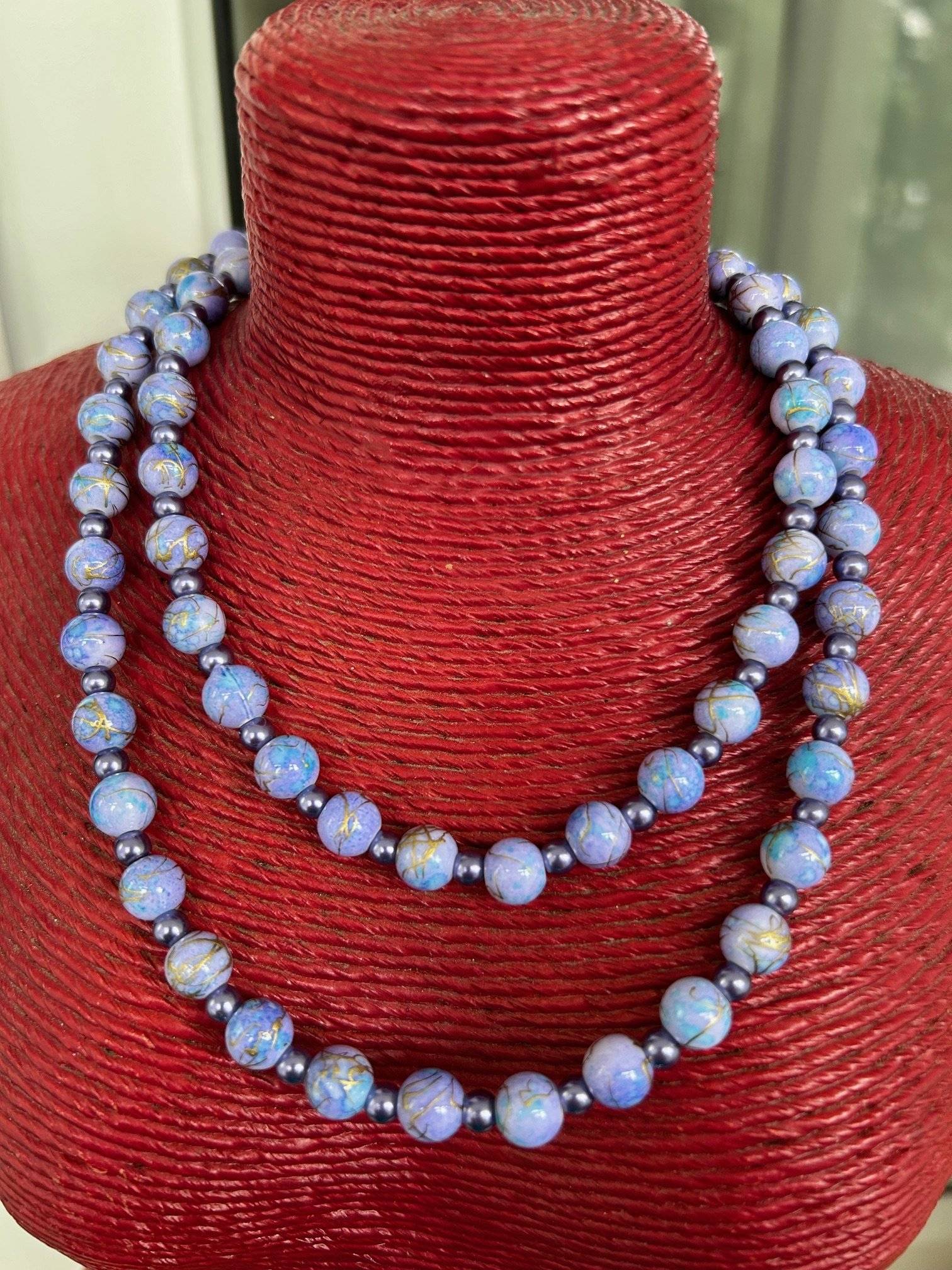 Un colier fantezie cu lungime medie - de 71/74 cm - compus din mărgeluțe acril albastru petrol, cu desen auriu, sfere de 6 mm și perlă de sticlă, de 4 mm, culoare albastru cerneală.