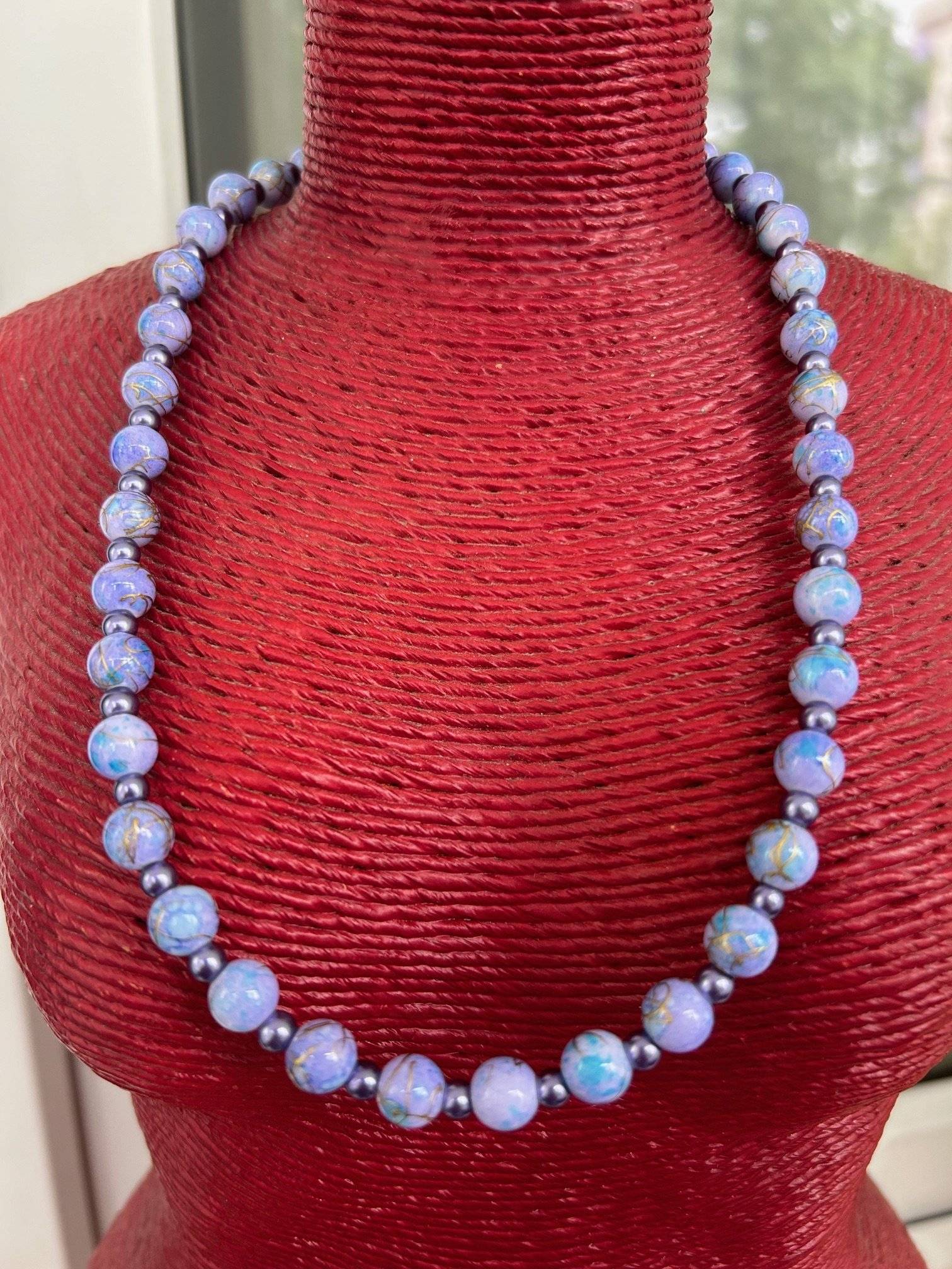 Un colier fantezie cu lungimea de 41/43 cm compus din mărgeluțe acrilice albastru petrol, cu desen auriu, sfere de 6 mm și perlă de sticlă, de 4 mm, culoare albastru cerneală.